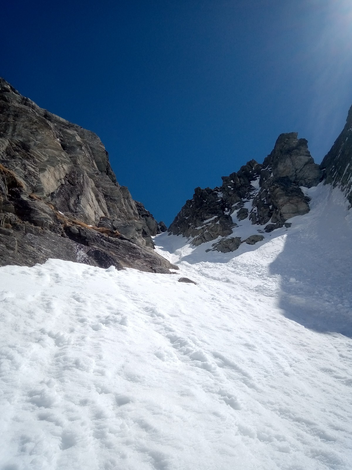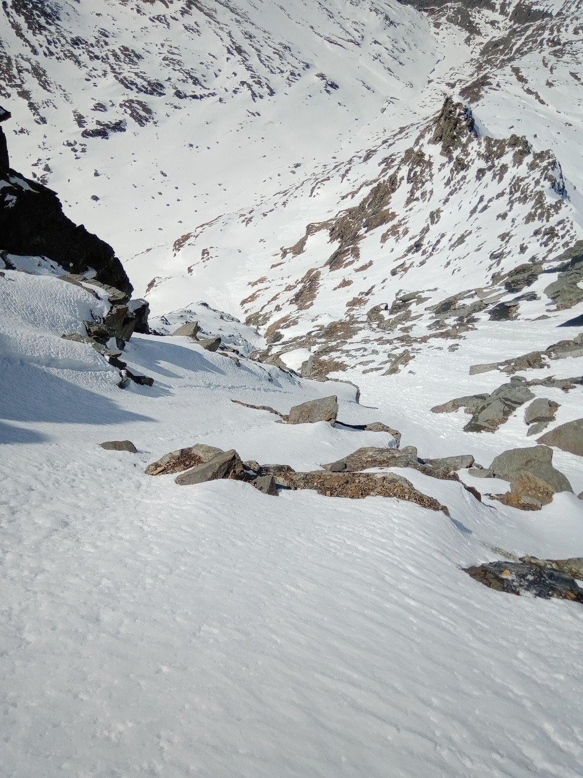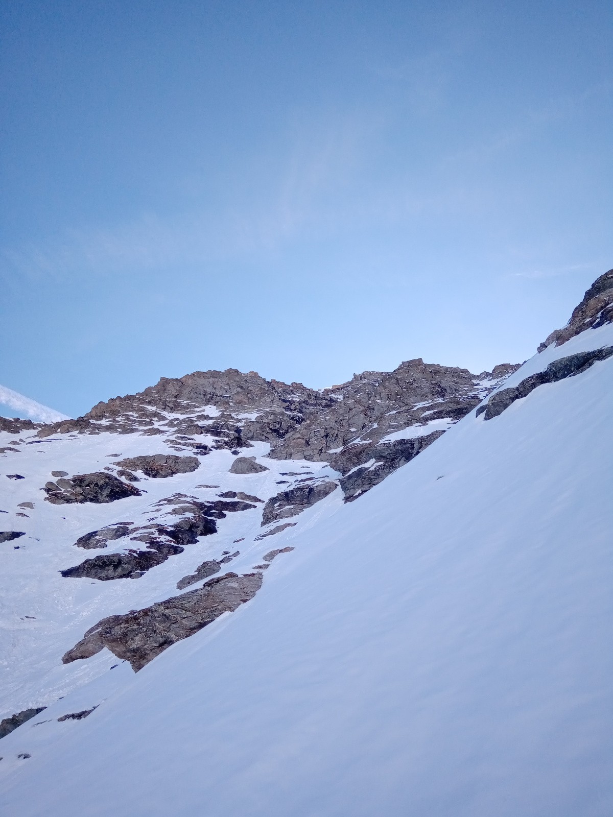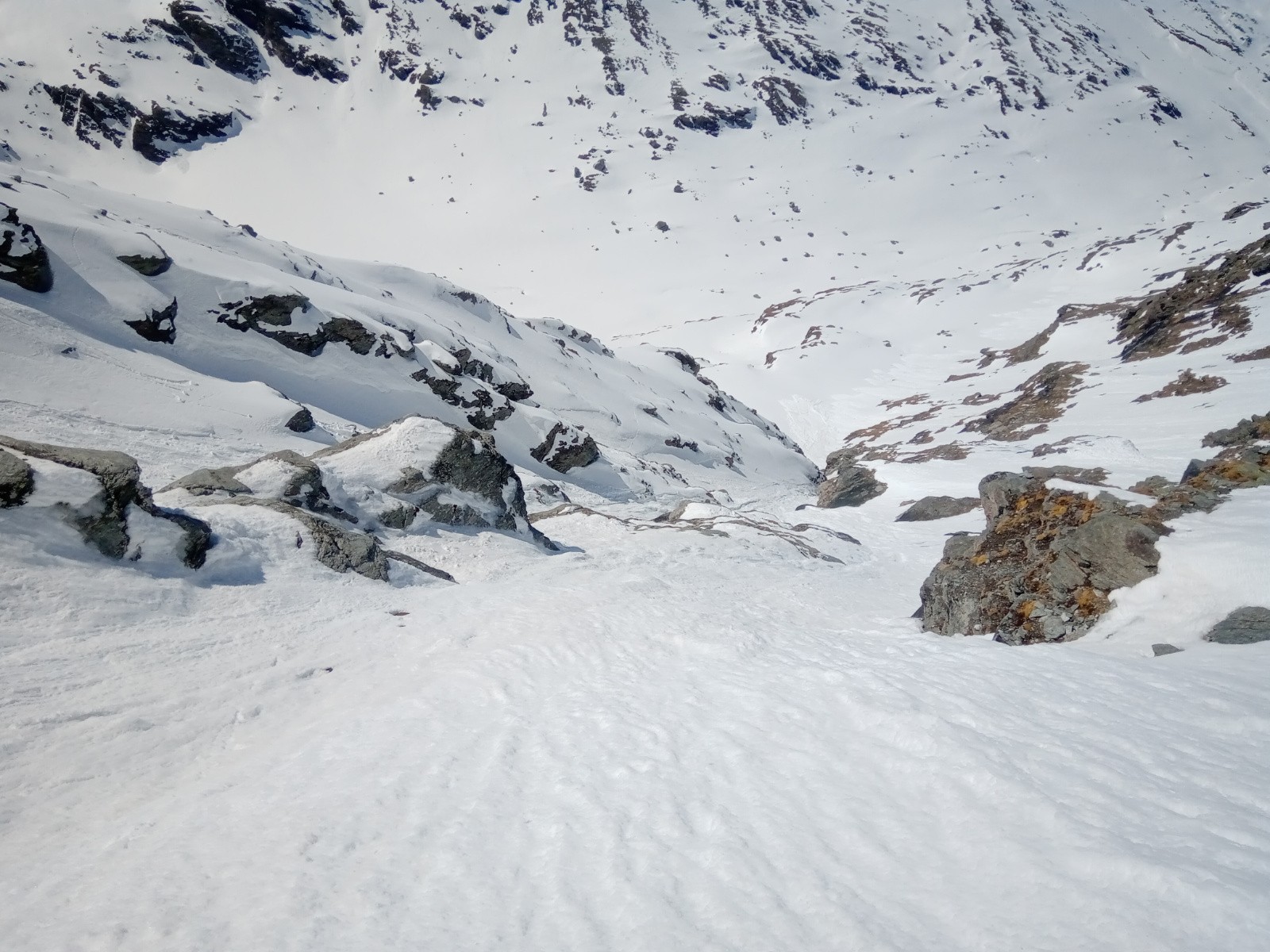 Descente pas en grand ski, mais je m'étais déjà fait à l'idée, le plaisir va plutôt venir du fait de se faufiler dans une face qui n'est pas en condition. Moi qui me croyais malin en me disant que le couloir emprunté en bas le matin était bien Ouest et donc chaufferai en dernier, c'est plutôt qu'il n'a pas encore vu le soleil oui ! Béton armé pour finir, tip top. Bonne transfo ensuite pour le socle, un peu de ski de fond mais pas méchant dans le vallon puis la petite remontée au collu.