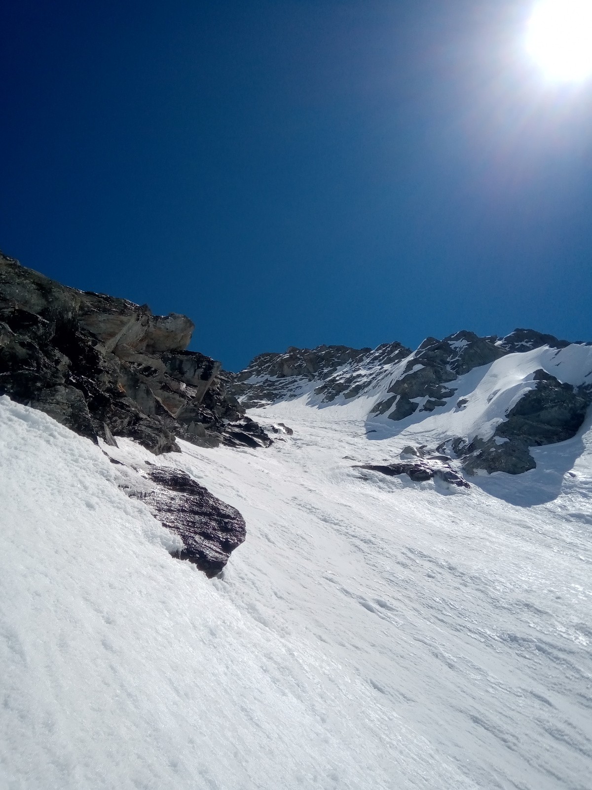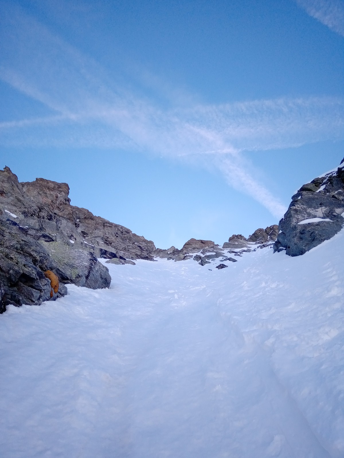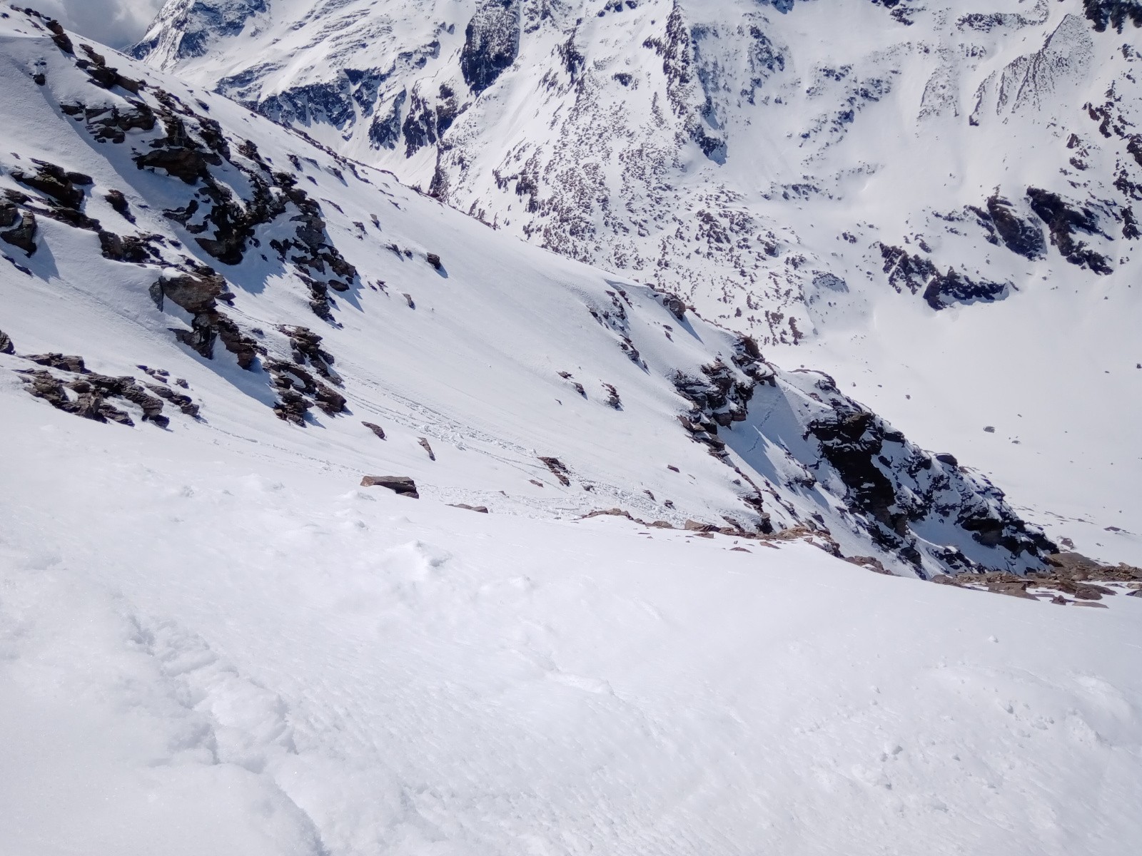 Descente pas en grand ski, mais je m'étais déjà fait à l'idée, le plaisir va plutôt venir du fait de se faufiler dans une face qui n'est pas en condition. Moi qui me croyais malin en me disant que le couloir emprunté en bas le matin était bien Ouest et donc chaufferai en dernier, c'est plutôt qu'il n'a pas encore vu le soleil oui ! Béton armé pour finir, tip top. Bonne transfo ensuite pour le socle, un peu de ski de fond mais pas méchant dans le vallon puis la petite remontée au collu.