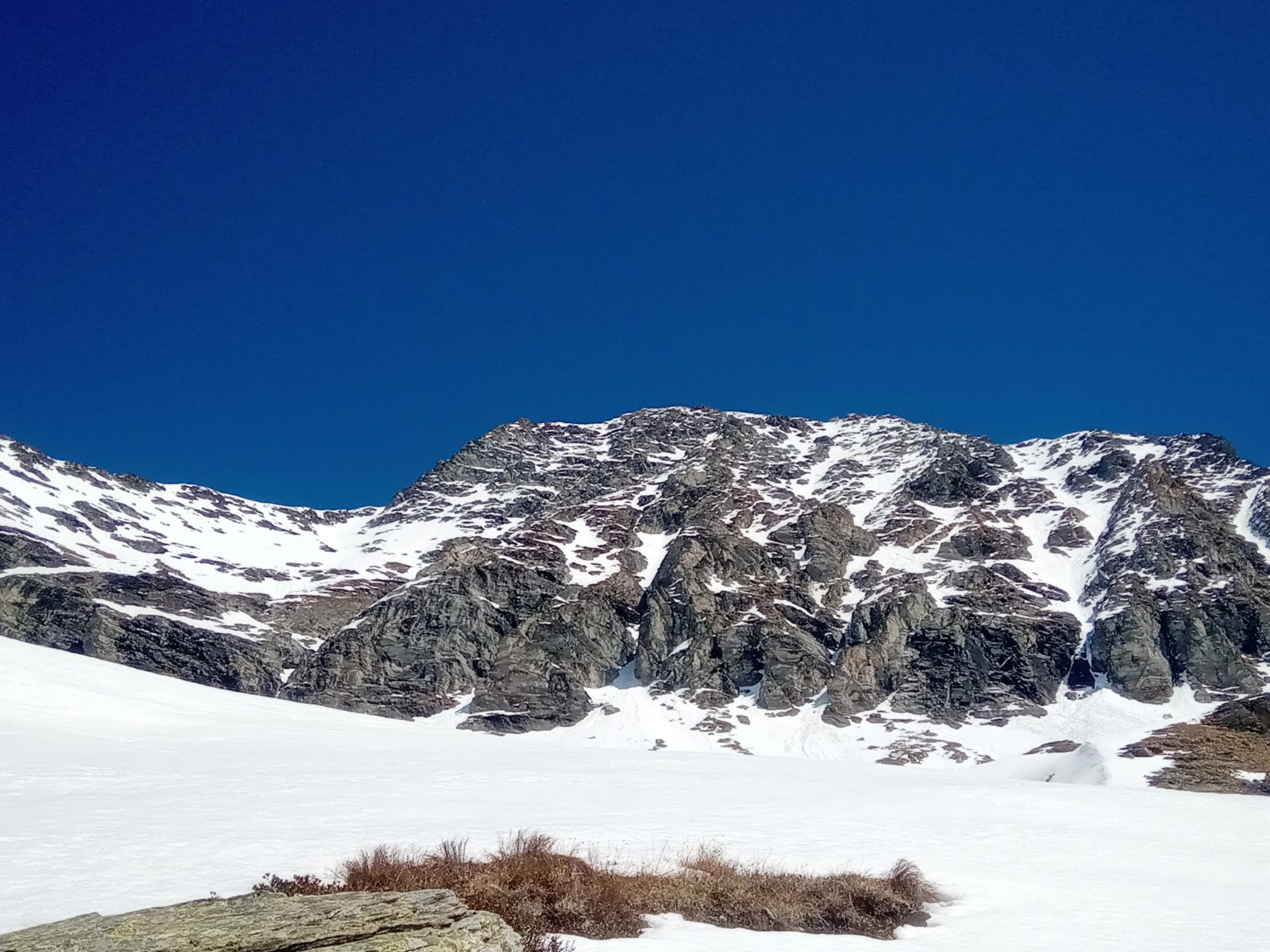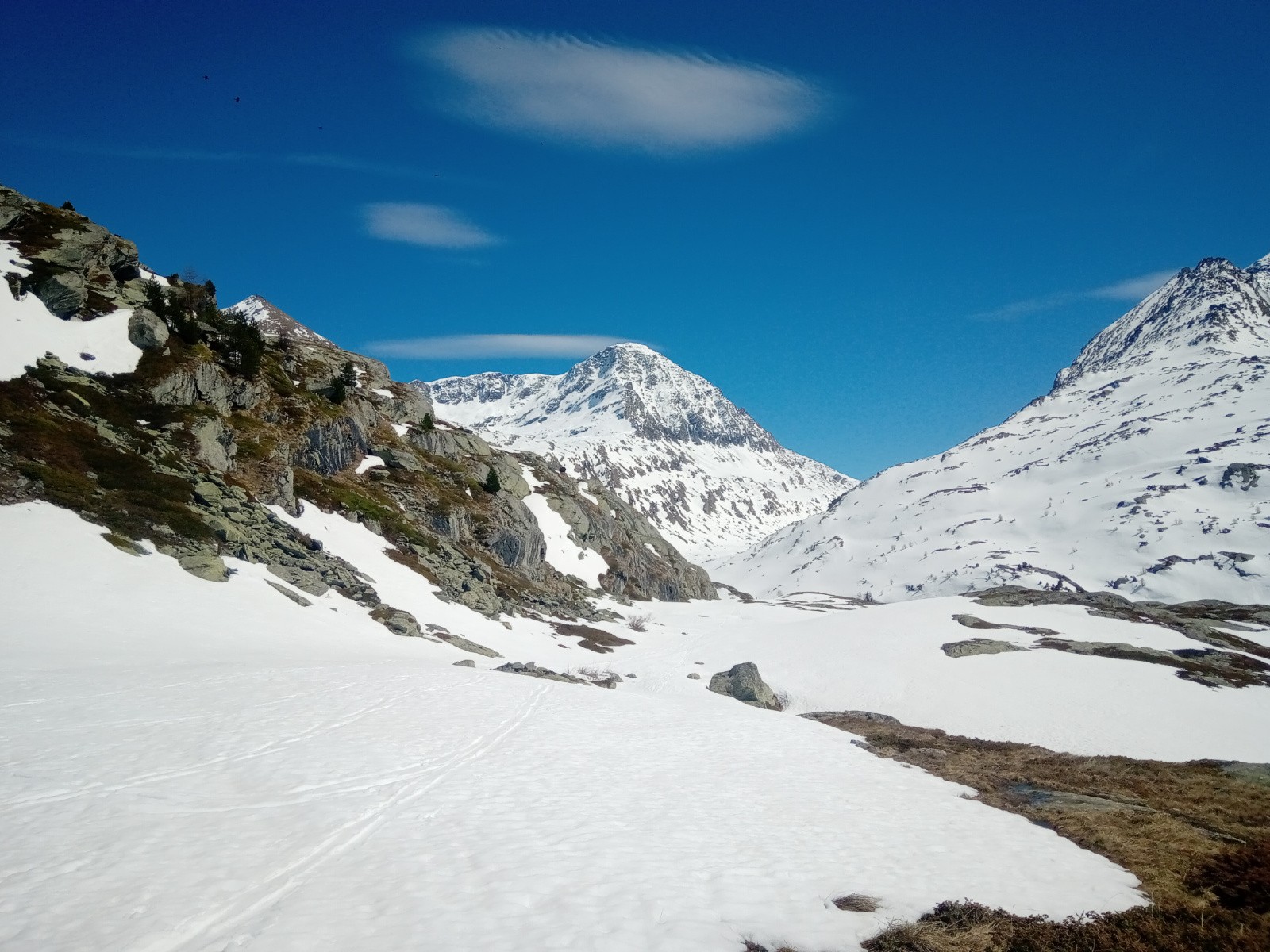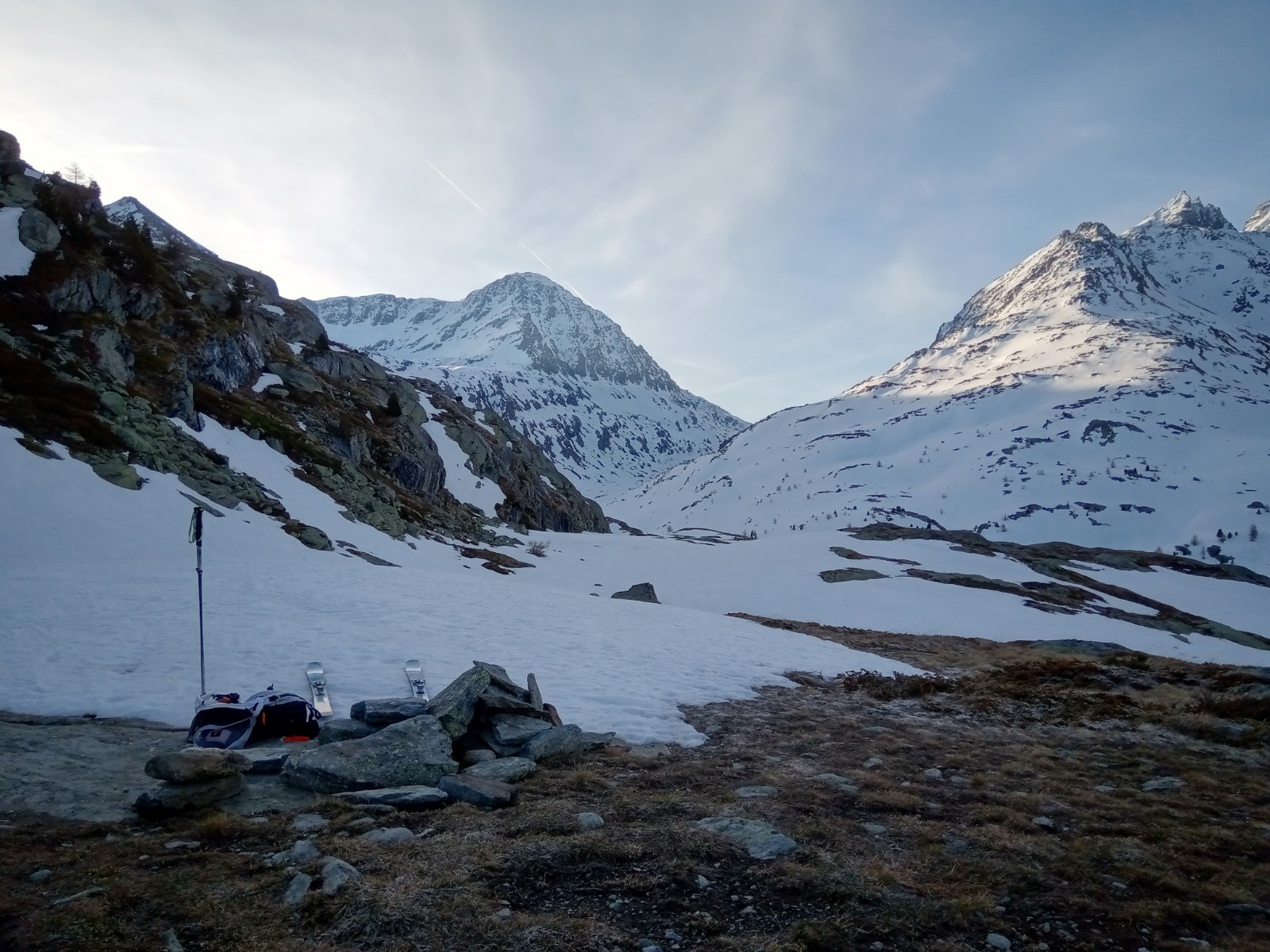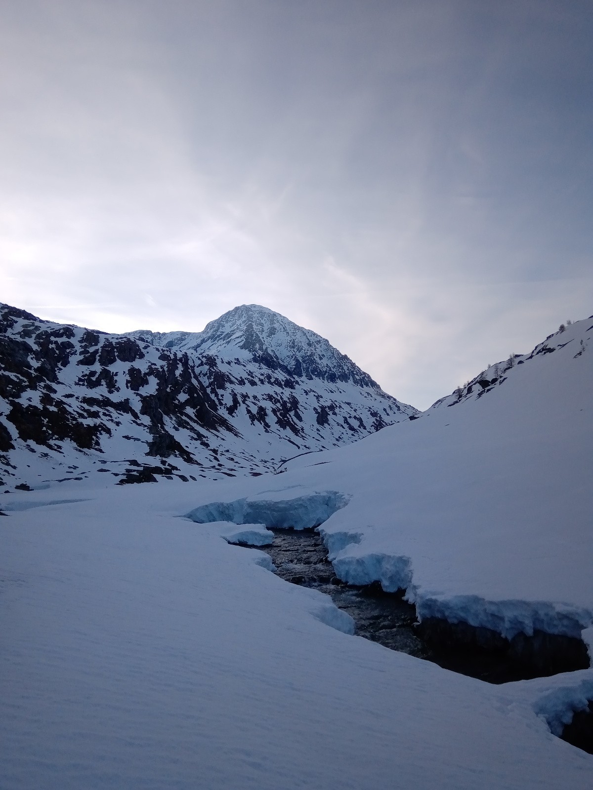 Descente pas en grand ski, mais je m'étais déjà fait à l'idée, le plaisir va plutôt venir du fait de se faufiler dans une face qui n'est pas en condition. Moi qui me croyais malin en me disant que le couloir emprunté en bas le matin était bien Ouest et donc chaufferai en dernier, c'est plutôt qu'il n'a pas encore vu le soleil oui ! Béton armé pour finir, tip top. Bonne transfo ensuite pour le socle, un peu de ski de fond mais pas méchant dans le vallon puis la petite remontée au collu.
