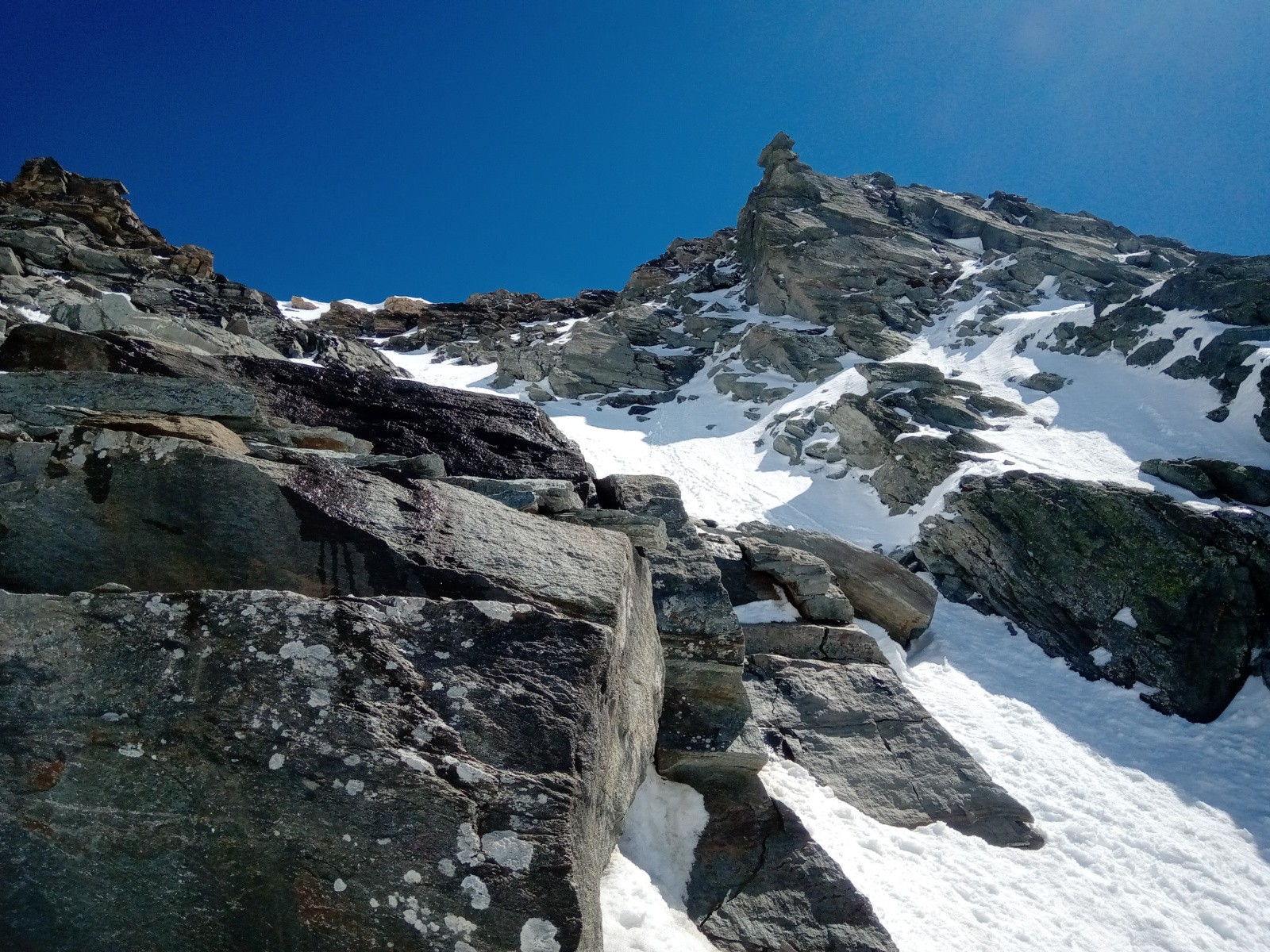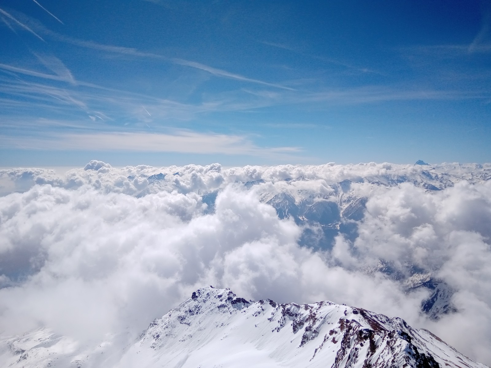 Pied de face, le couloir d'accès a son rocher bloqué bien déneigé, autant commencer à repérer un autre passage pour le retour, le couloir voisin main droite a l'air mieux, juste un petit dry à son sommet. Puis je reviens dans la ligne par une petite traversée et je repars vers le haut. À un moment je lève la tête de mes crampons et tient surprise le couloir se ferme complètement au-dessus par une pyramide rocheuse, c'est quoi ce bordel. Check sur la photo prise au chaussage ce matin, je suis pas dans la ligne en fait, je me suis laissé happer par un mauvais couloir. Bon, ça connectera bien en haut dans tous les cas. J'en sors et reviens dans le finish de la ligne par une traversée pour repérer comment passer le ressaut supérieur. Puis sommet nord, puis sommet sud. Il est... 11h. Pfff, le bebêt, aucune progression sur le timing, et pas aidé par le réveil plus tôt que prévu. En plus il y a du vent au sommet...