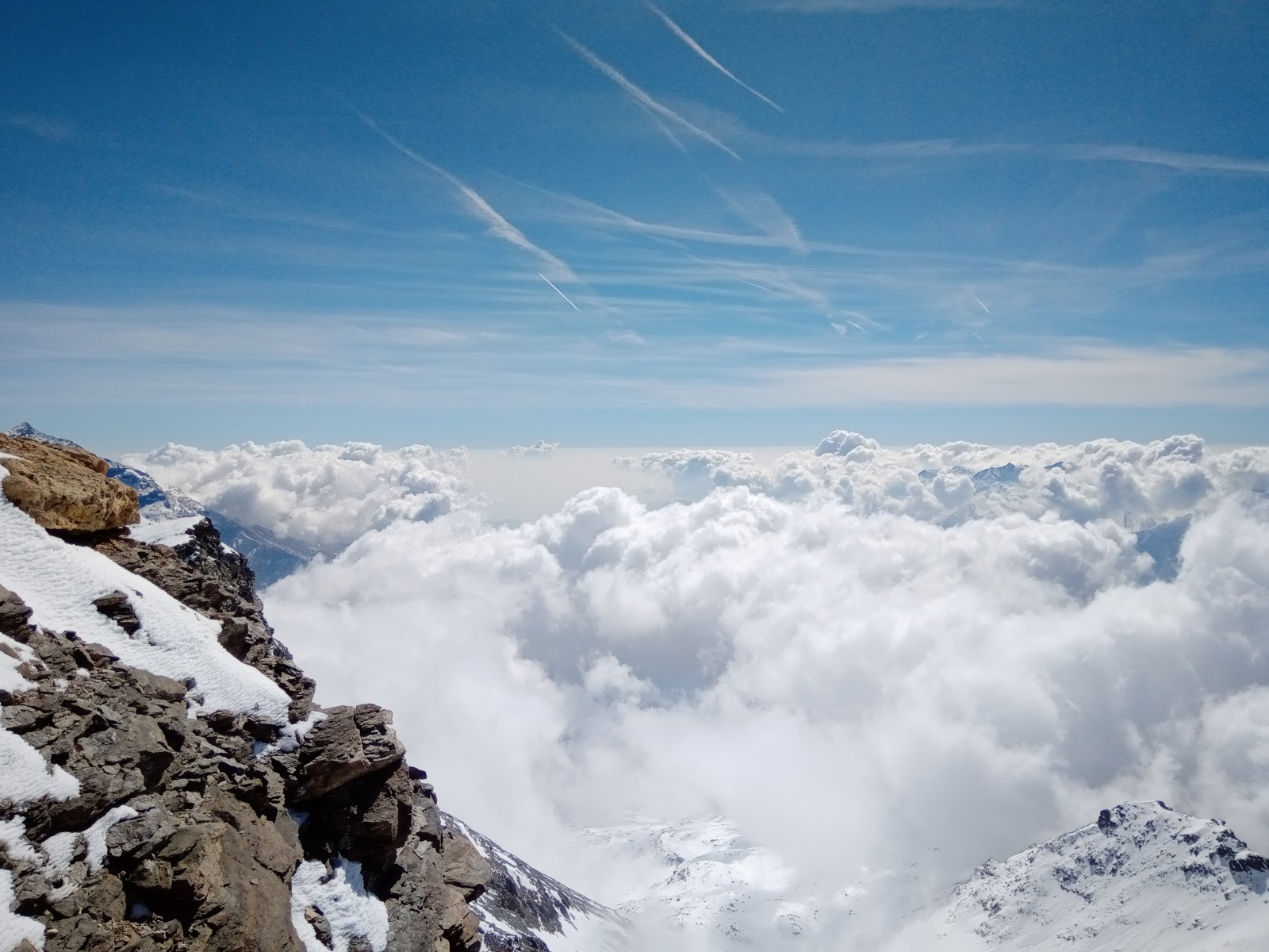 Descente quelques mètres dans les cailloux en sud pour trouver un spot ou pioncer un moment. D'abord 1h de bon dodo direct, cool ! Au bout de 2h je retourne au départ de la ligne, c'est béton, j'suis dans le vent, je m'assois encore un moment sur le sac, puis bon faut bien descendre un jour, de toute façon avec le vent je ne m'attends pas à ce que le haut décaille.