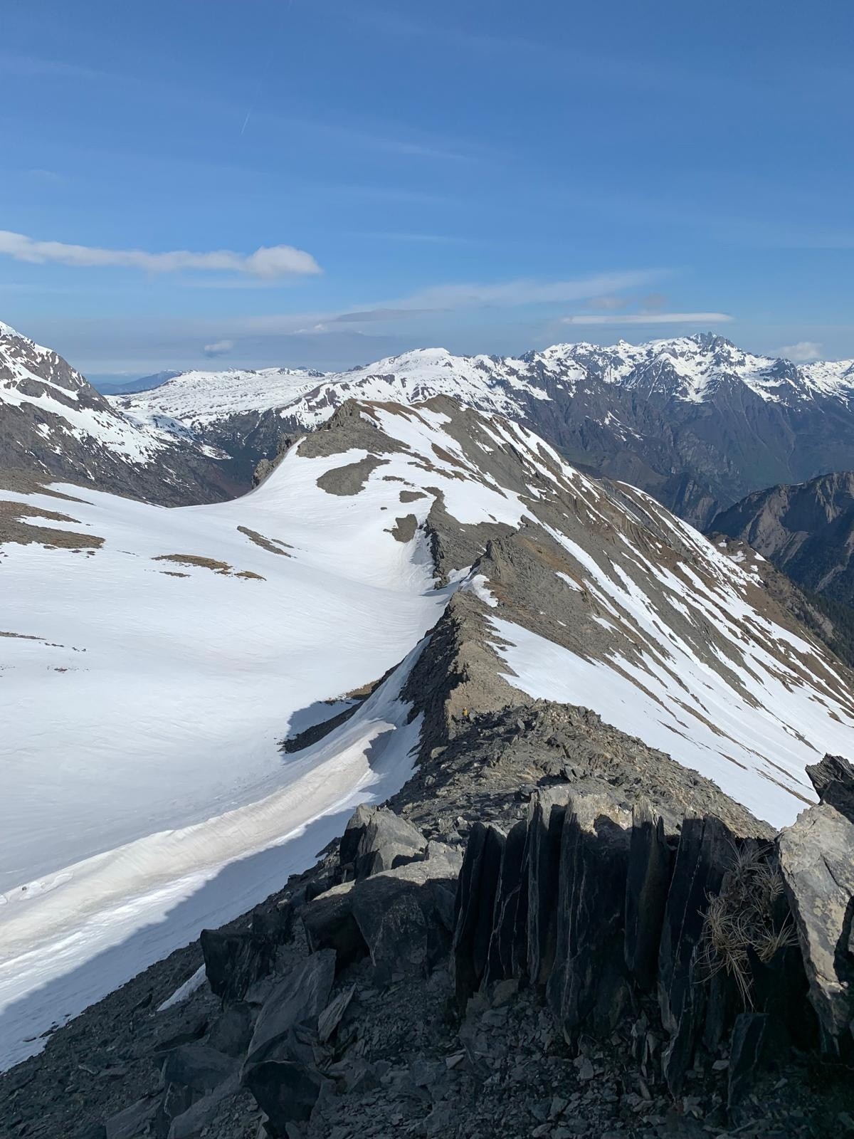 On monte jusqu'au Petit Renaud. On profite de la vue, observe le départ du couloir Nord. Enfin je jette un bref coup d'œil car c'est trop raide pour moi...et on s'engage dans une première descente en sud pour tester la moquette.