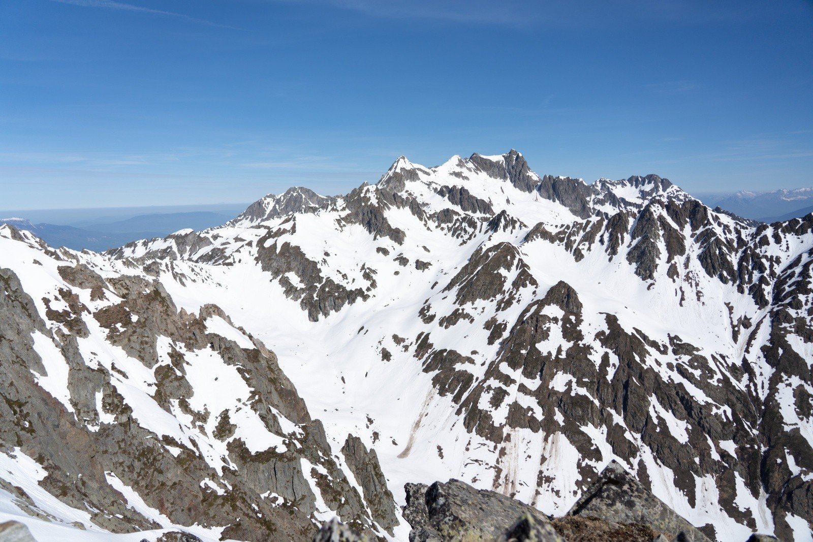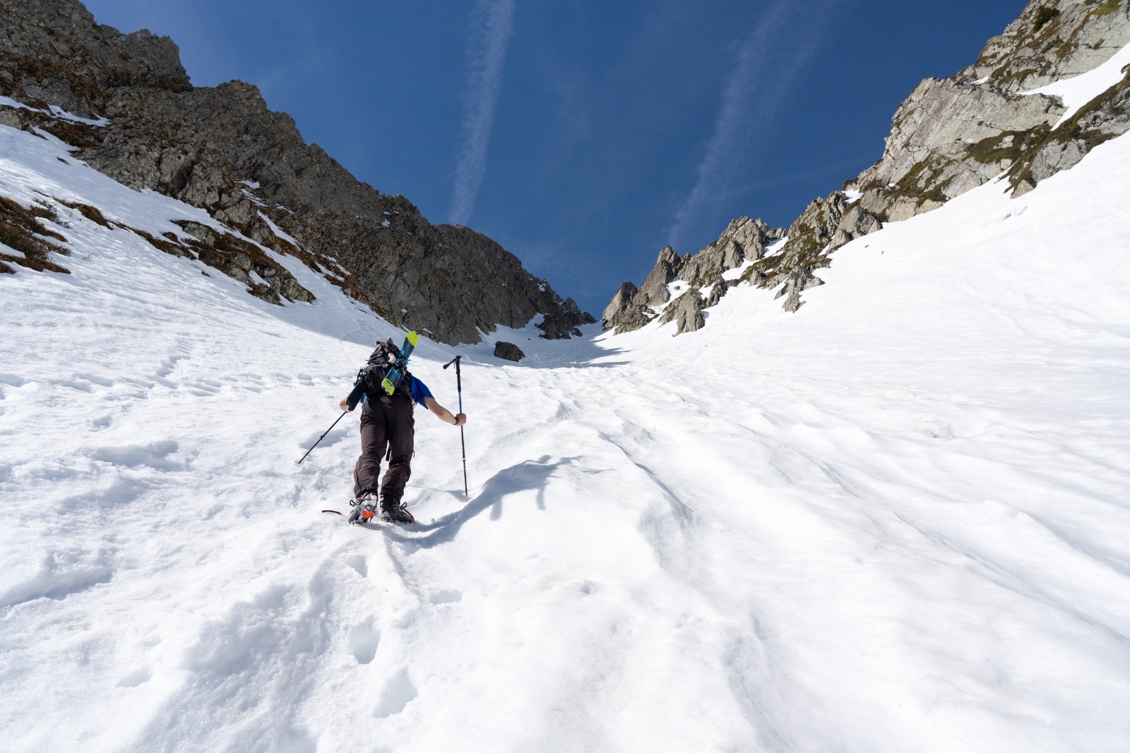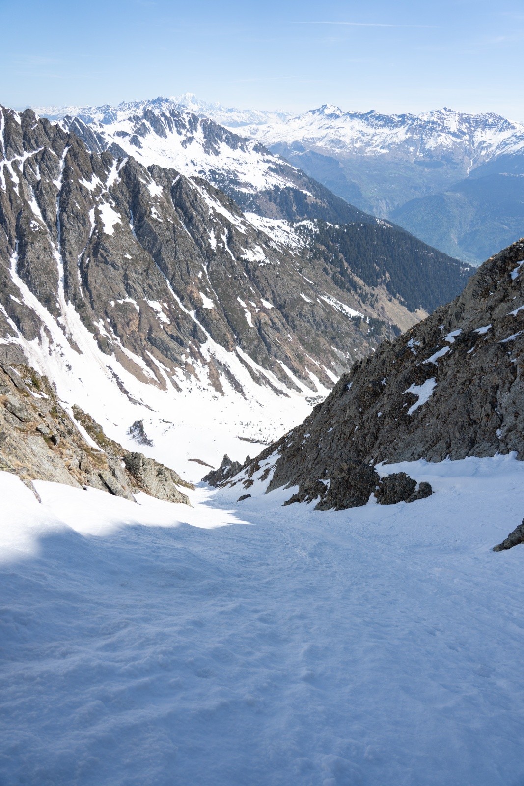 - Montée en neige molle (peu de regel) mais porteuse. Dans le cône de déjection ça partait déjà en neige de printemps avec les températures, on a vite mis les crampons à 2000m. Dès qu'on est revenus à l'ombre, neige bien dure.