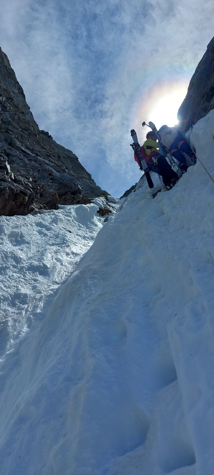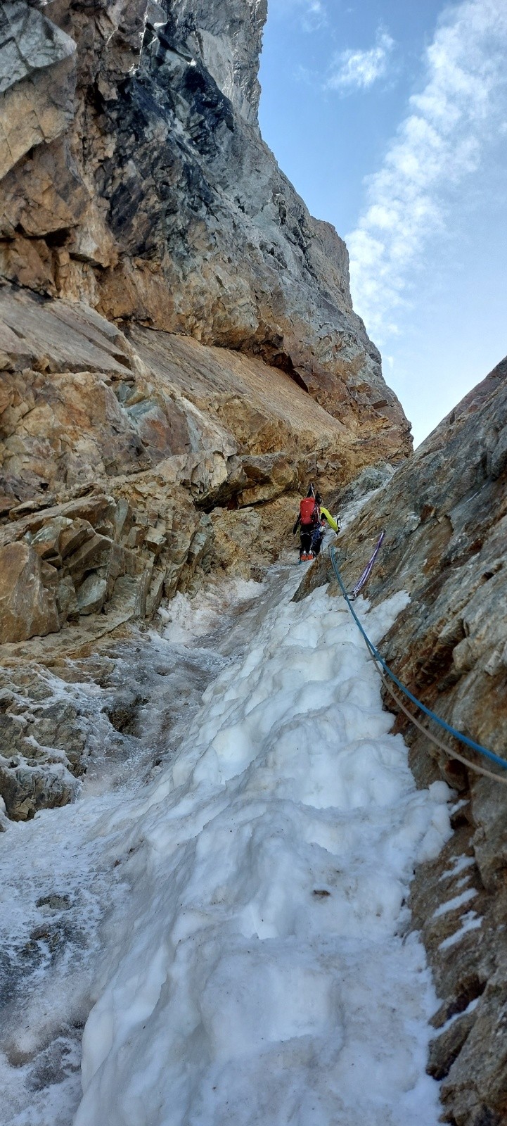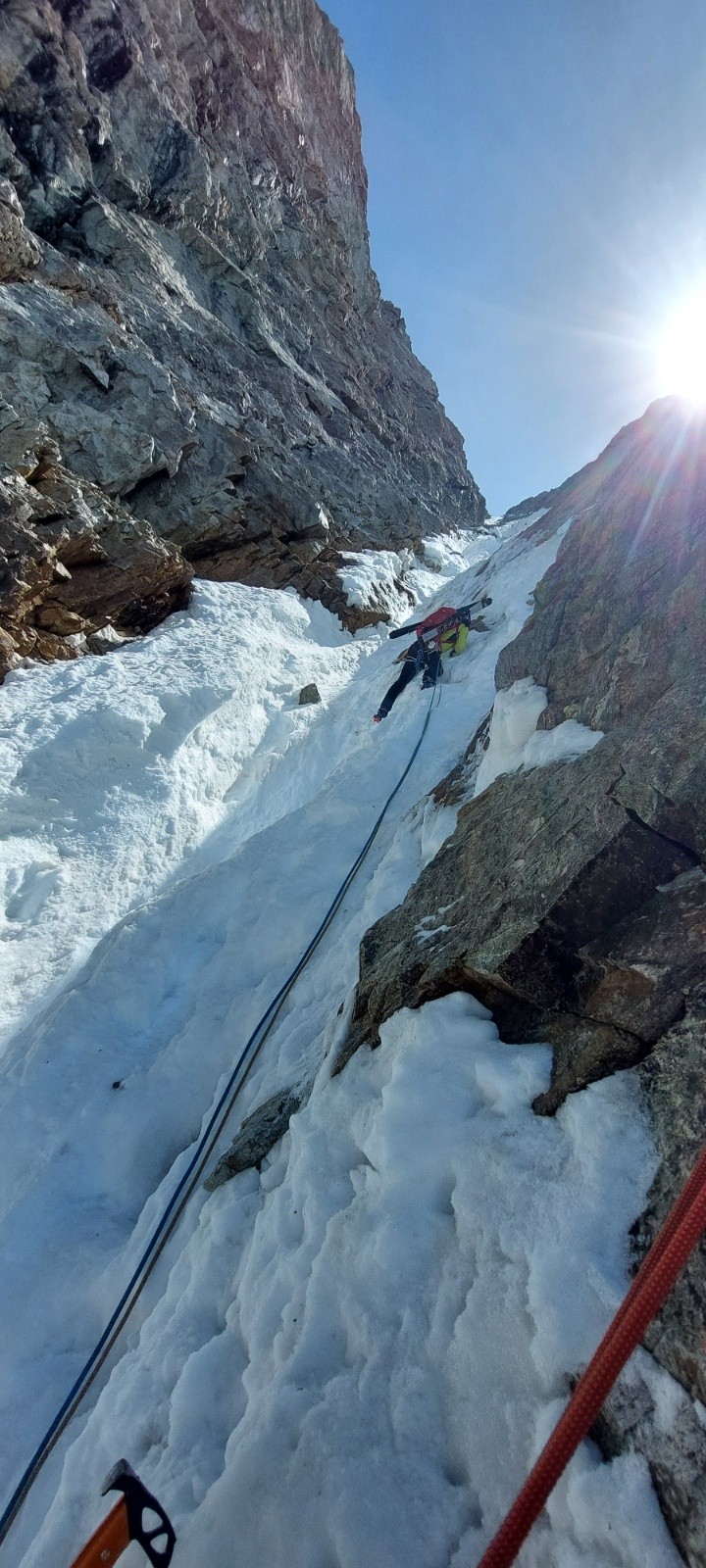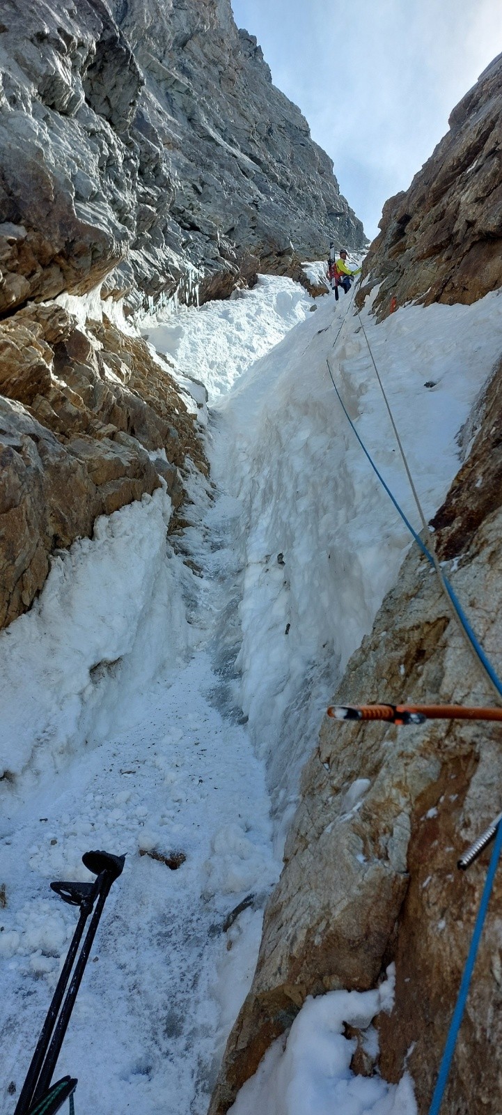 Attention c'est devenu une goulotte de glace cotation 3 au début puis un mixte avec tout qui bouge. nous avons tiré 4 longueurs plus 1 dans la neige. Les 2 premières se protègent, la 4e, il n y a plus rien, c est de la que la coulée est partie. On a du faire le relai sur ski. 5e et dernière longueur tranquille dans la neige.