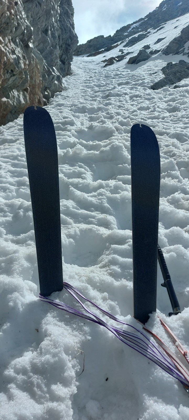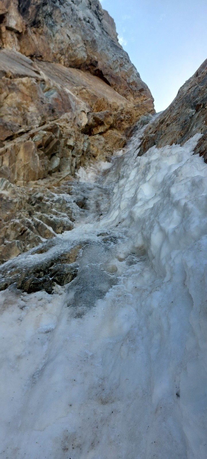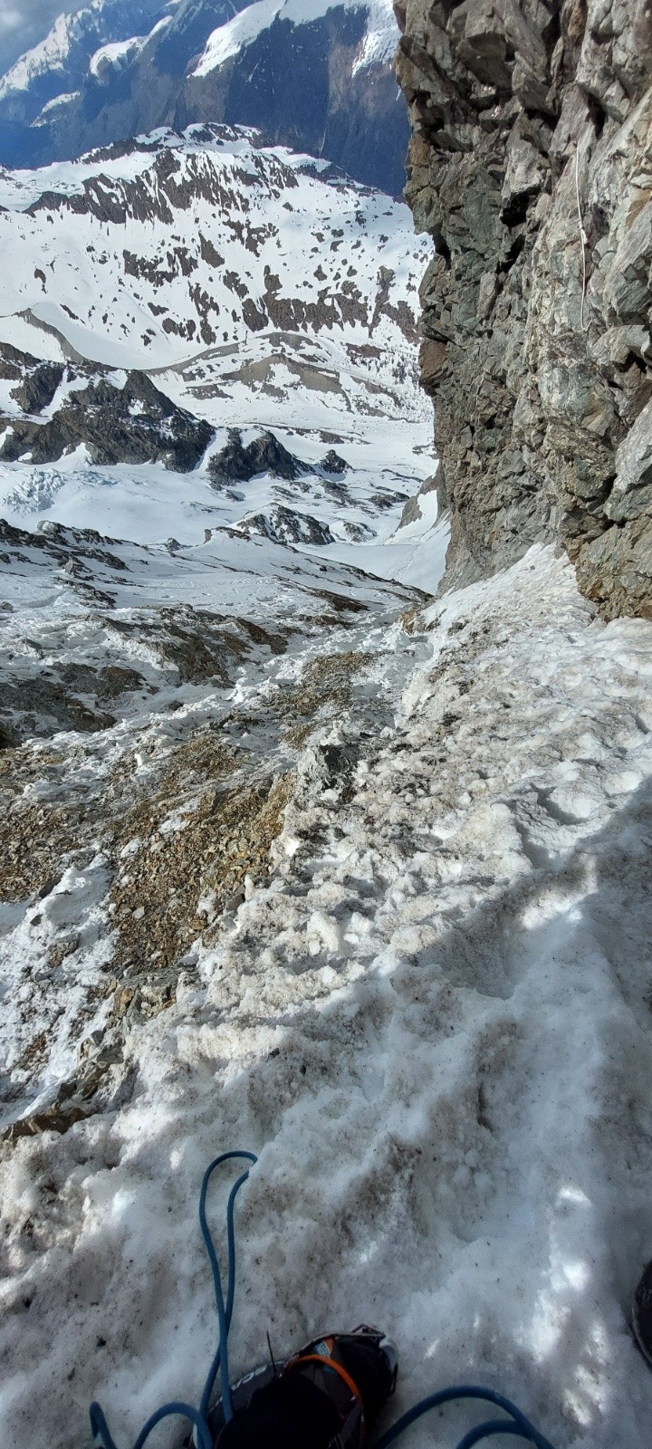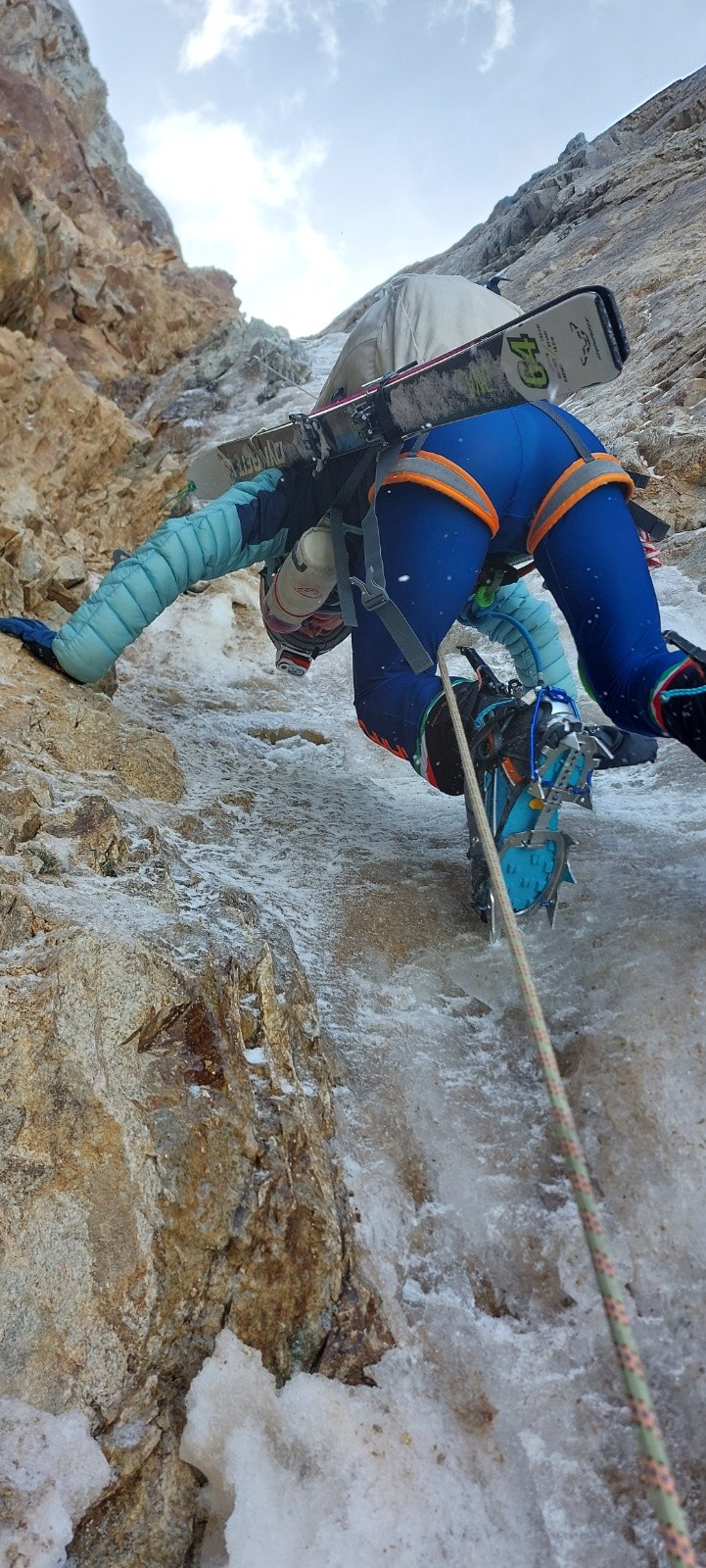 Attention c'est devenu une goulotte de glace cotation 3 au début puis un mixte avec tout qui bouge. nous avons tiré 4 longueurs plus 1 dans la neige. Les 2 premières se protègent, la 4e, il n y a plus rien, c est de la que la coulée est partie. On a du faire le relai sur ski. 5e et dernière longueur tranquille dans la neige.