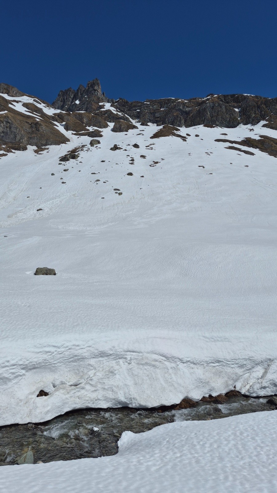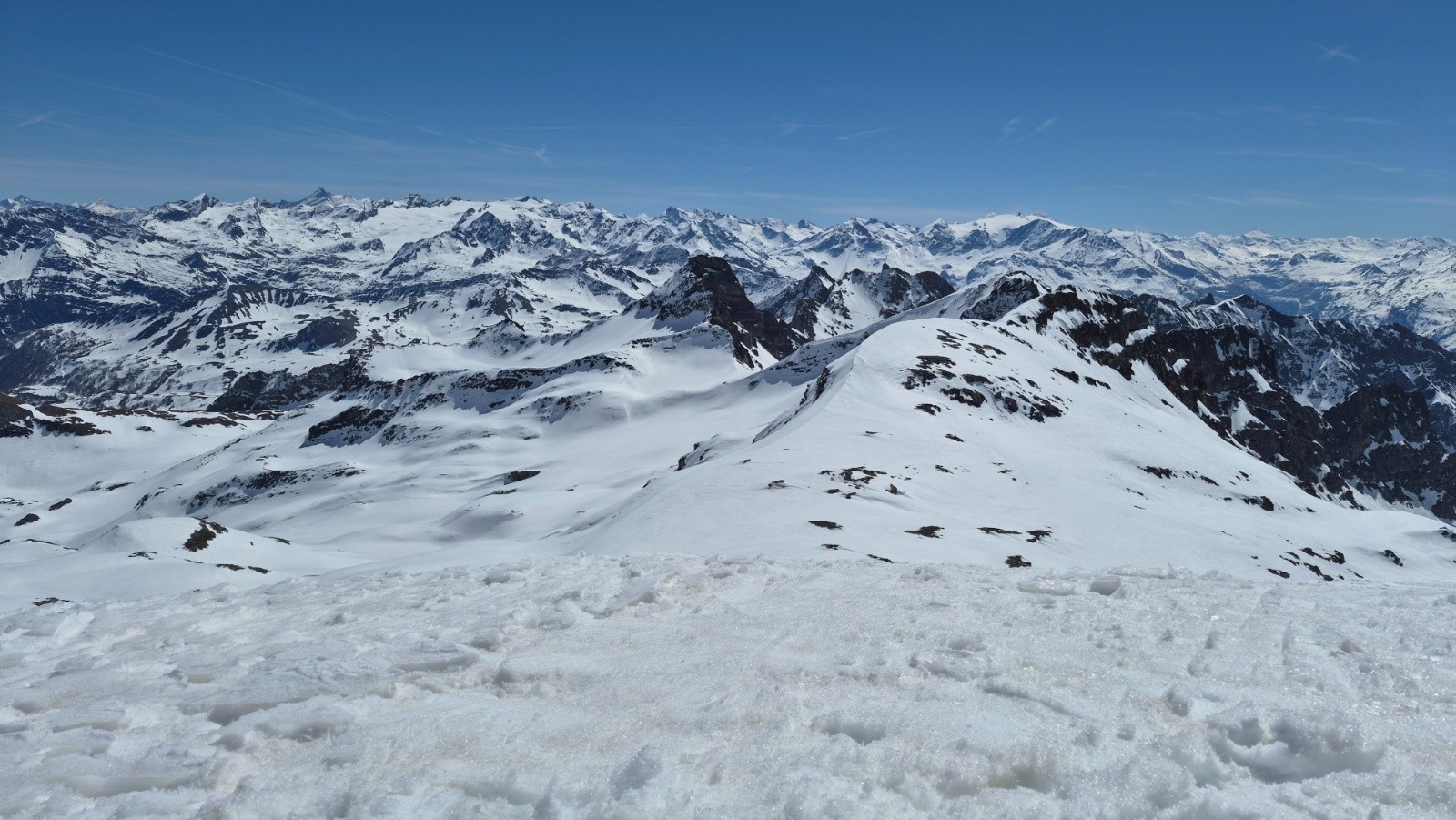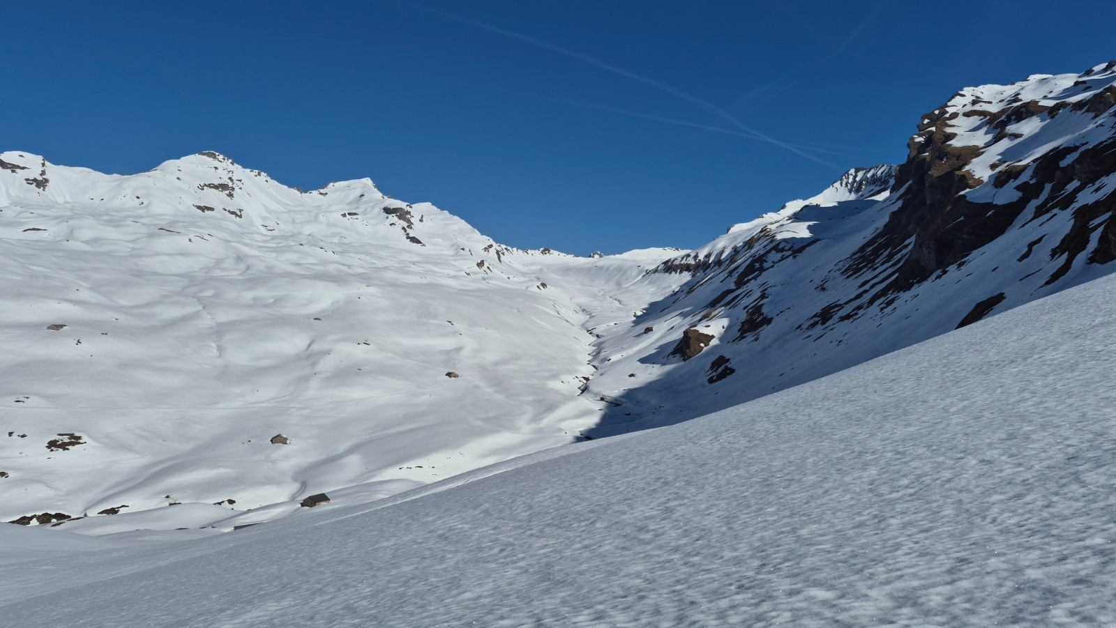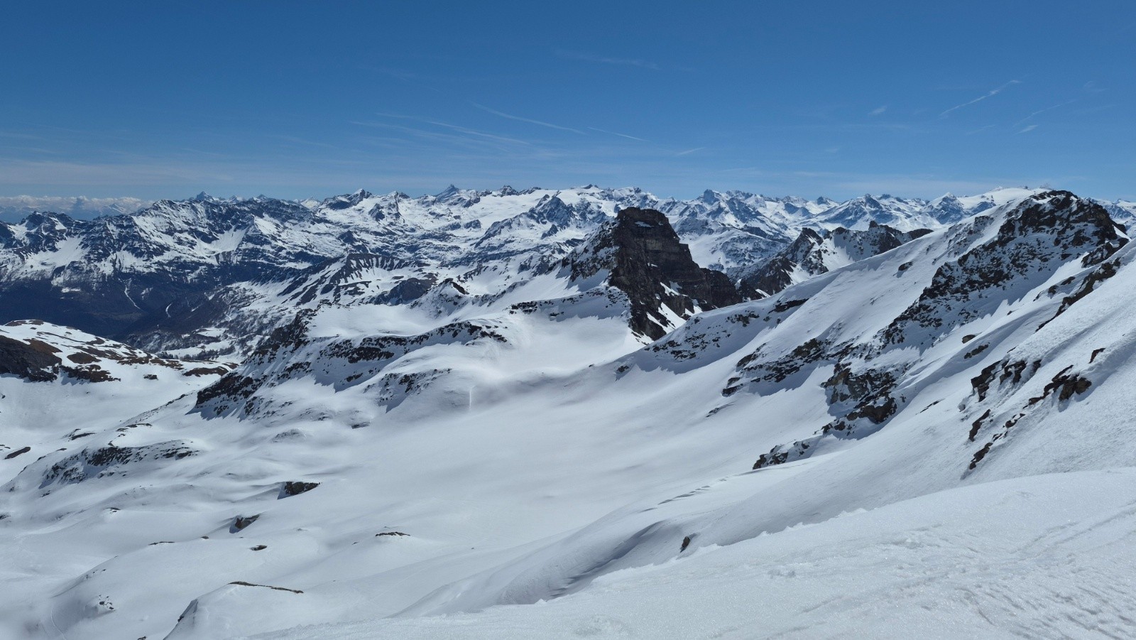 Itinéraire suivi : Depuis la voiture montée en suivant le chemin d'été, on a pu voir 3 bandes de Chamois qui descendaient dans le vallon. Nous avons suivi une trace dominant le torrent du Versoyen puis avons atteint le replat vers alt. 2050 m et le pont de Chézari sur le Versoyen. Ensuite nous avons choisi de remontée par le vallon du Lac des Rousses jusqu'au Col des Rousses (2851m). Nous avons ensuite basculé côté Italien (petite descente), et en traversée ascendante vers le N-NW, atteindre le col des Veis, puis le sommet. Descente par le vallon du Méchandeur pour rejoindre le pont de Chézari et remonter jusqu'à 2150m avant la descente finale en passant par les chalets de "Veis de Nastase".