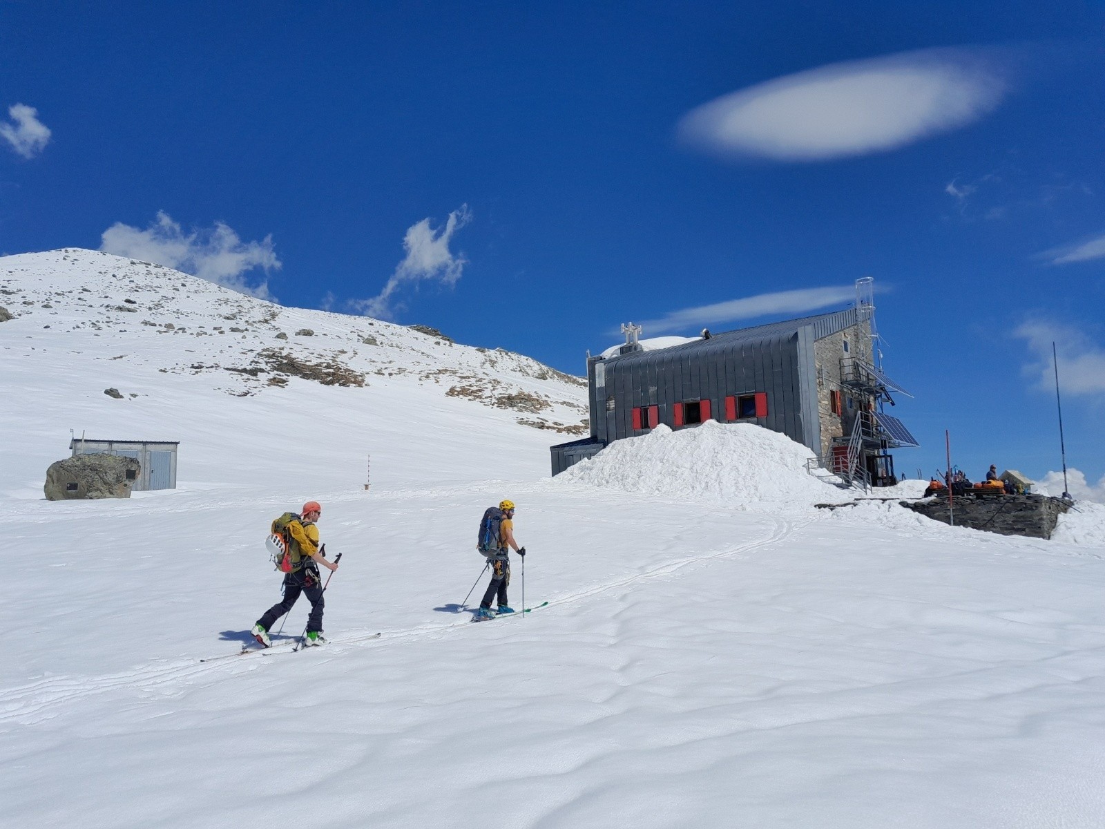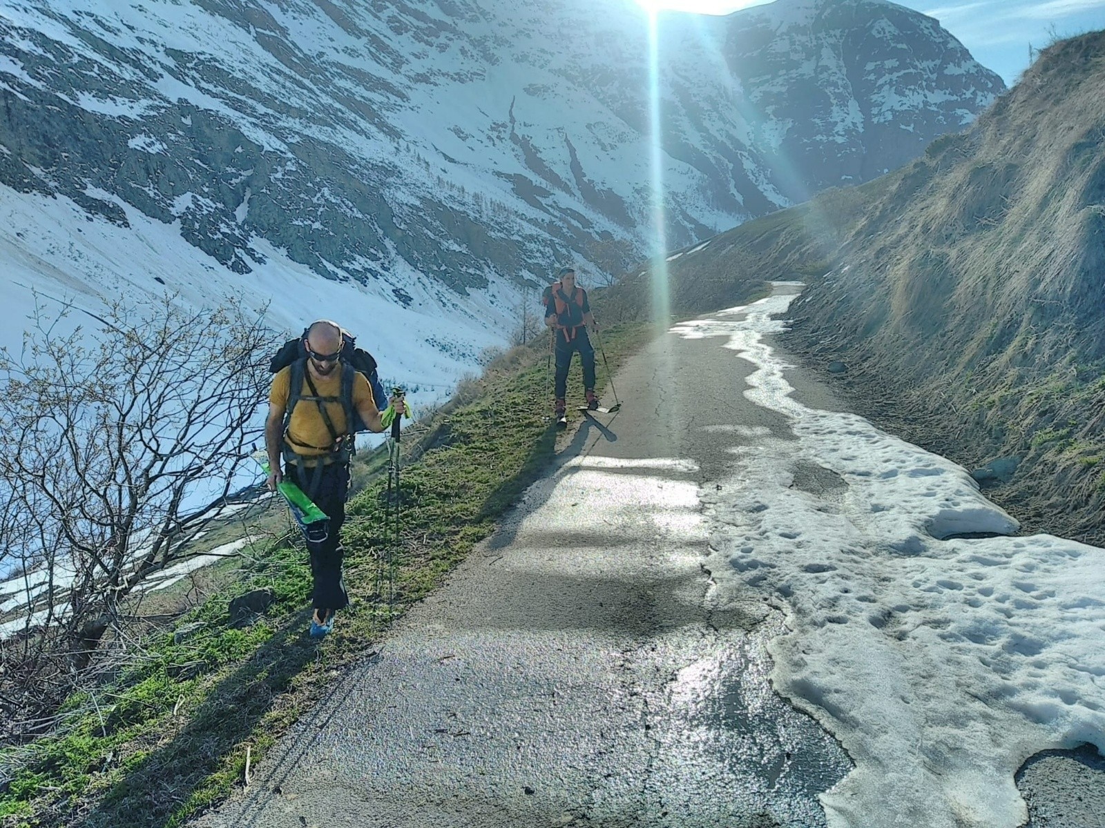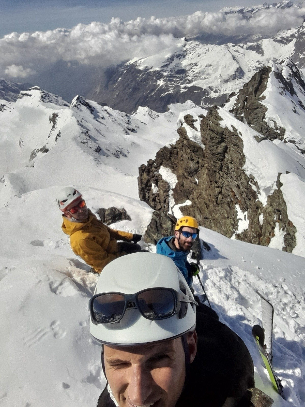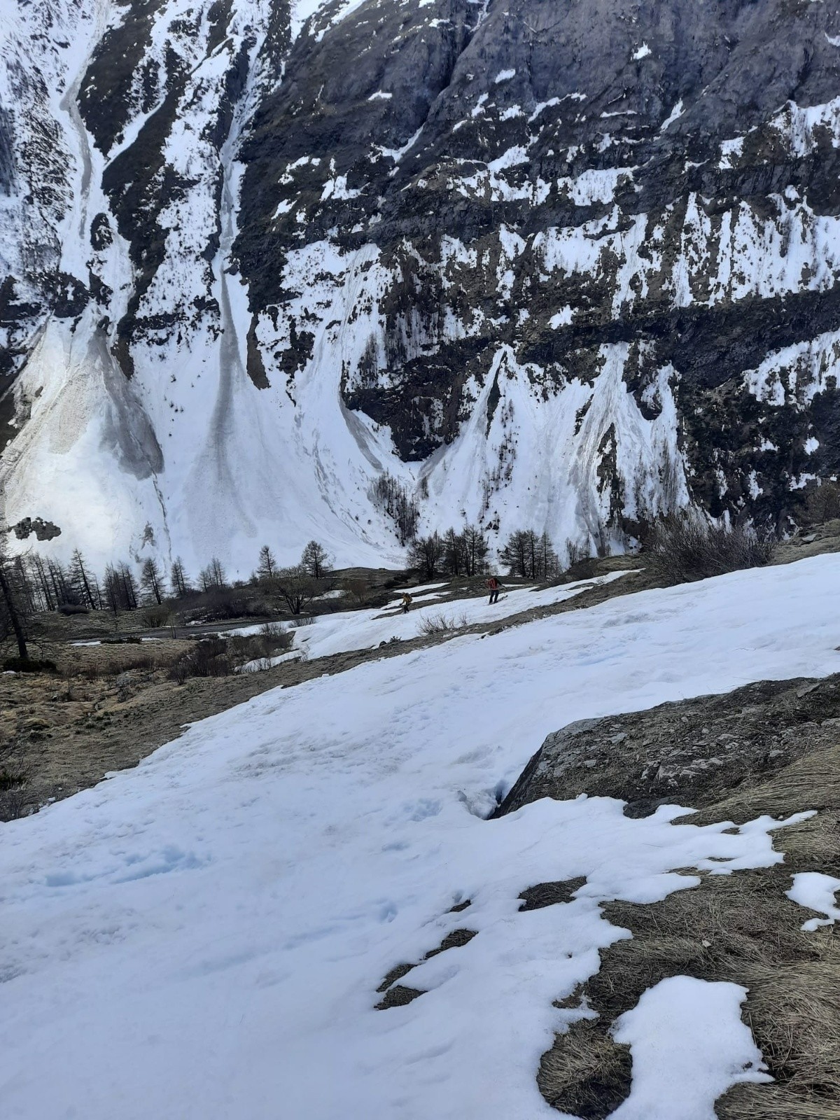 Conditions nivo et activité avalancheuse : Conditions bien printanières, avec un regel nocturne limité (oubli des couteaux finalement sans conséquence), anciennes coulées de purge tout au long de l'itinéraire