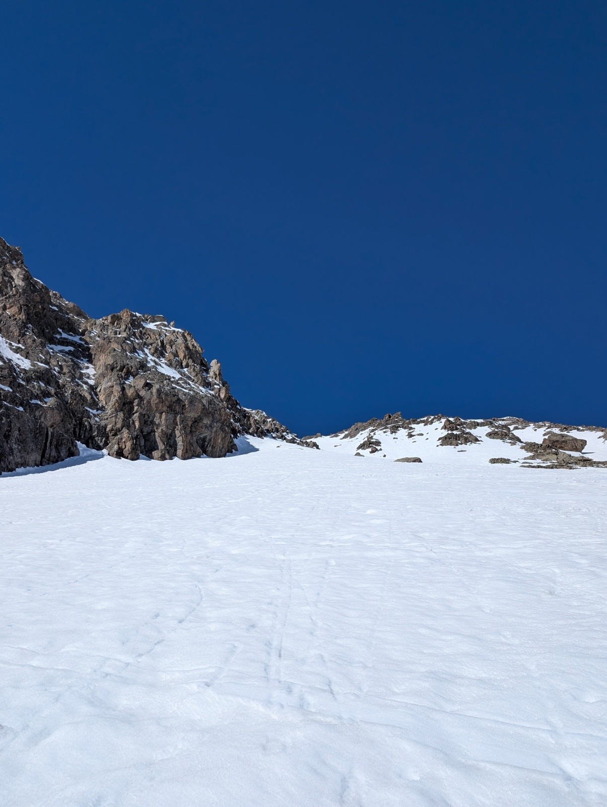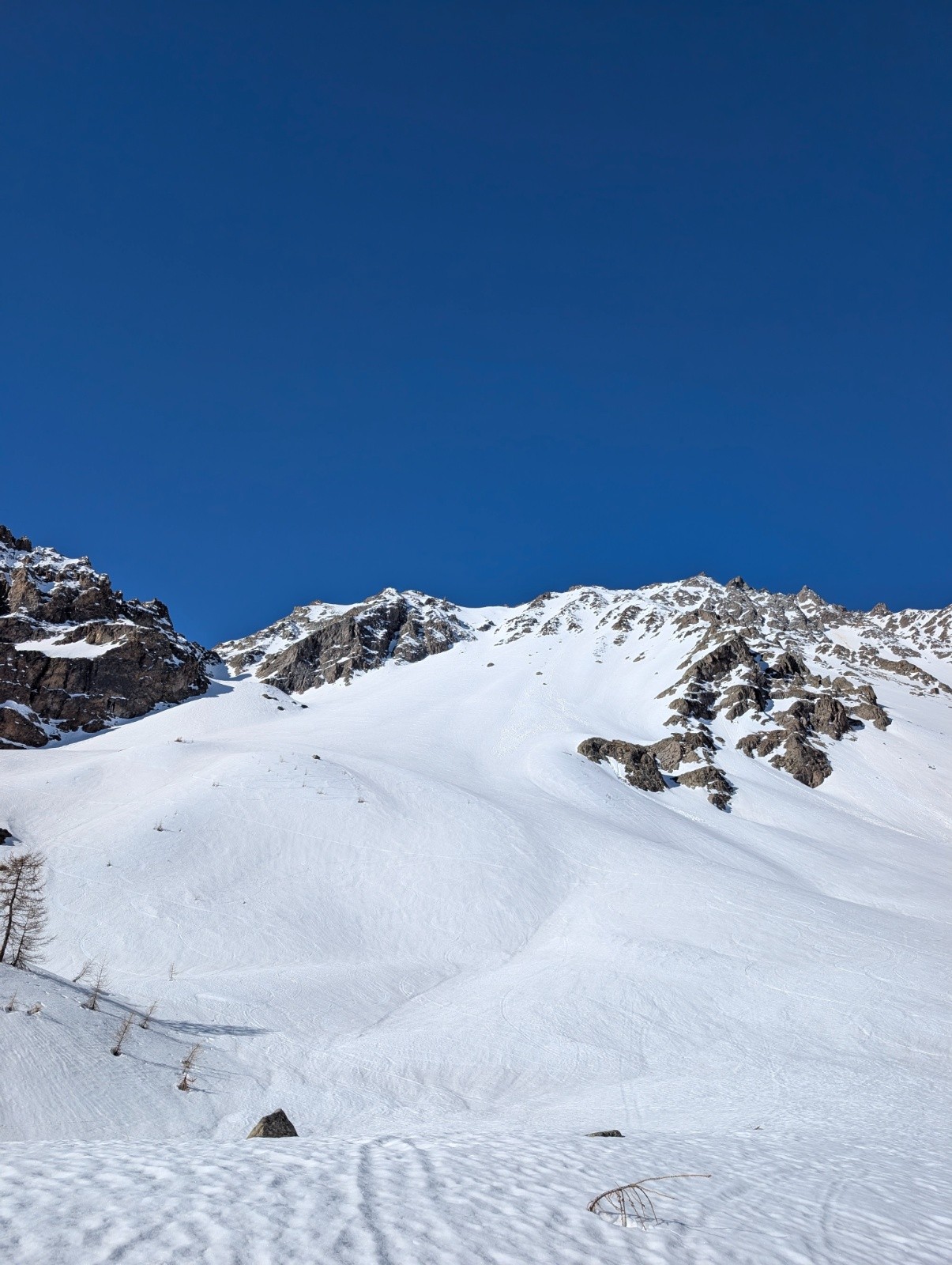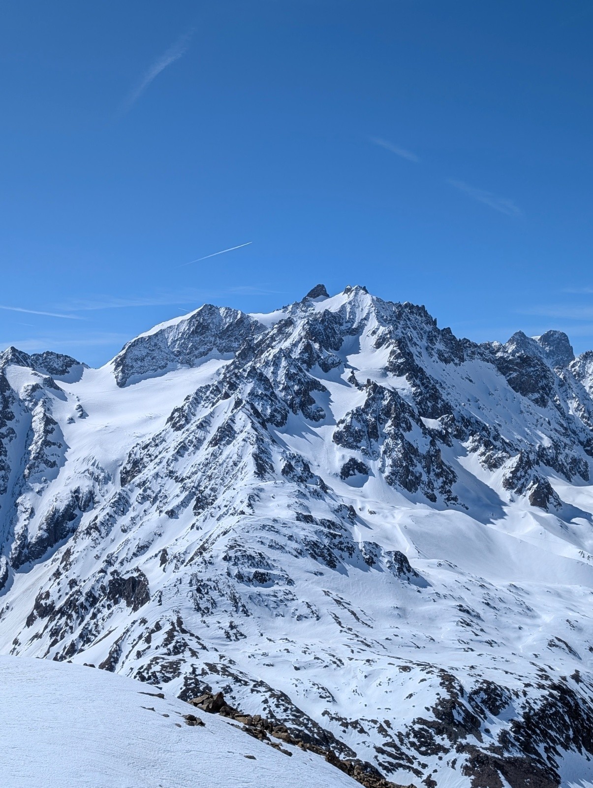 Conditions pour le ski : neige de printemps au top,un petit regel ,a l'ombre mais au soleil ça se transforme déjà à 9 , au pied de la face j'ai préféré mettre les couteaux car parfois ça glissé avec la neige humide .
