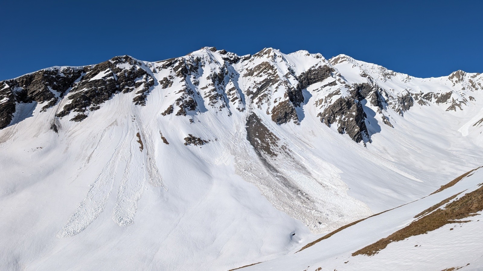 Conditions nivo et activité avalancheuse : une immense coulée sous le sommet. Attention peut être dans les pentes les plus raides sous l’aiguille.