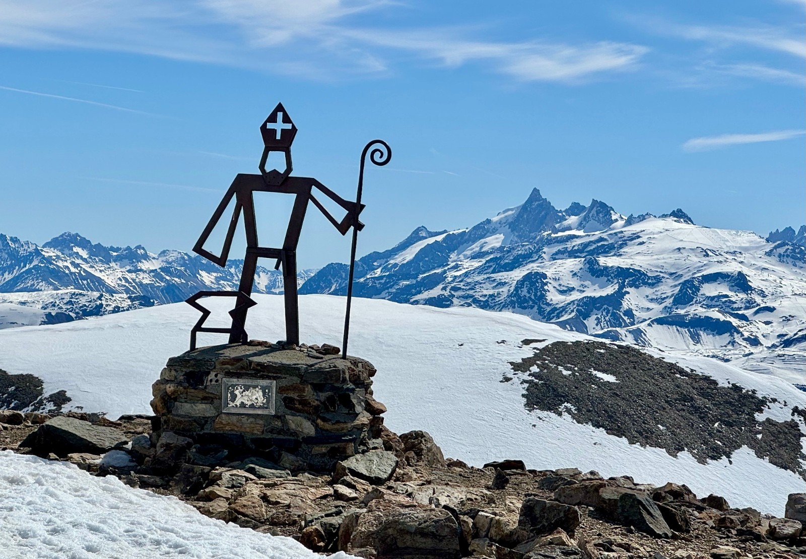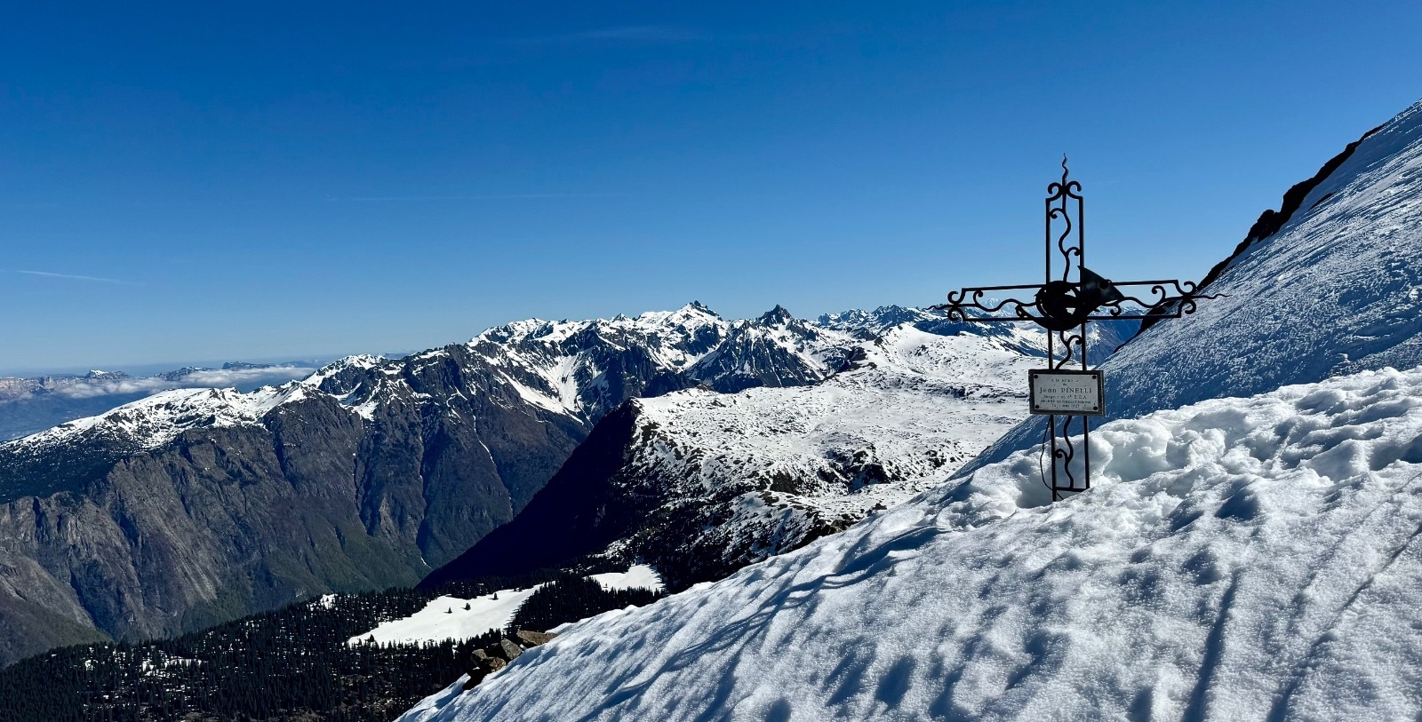 Départ du parking d'hiver : un panneau annonce une circulation interdite au-dessus jusqu'au 31 mai.. A suivre.. Très bon regel, chaussage rapide vers 1700. Montée jusqu'en dessous le Pas de la Mine tranquille, crampons pour sortir au Pas. Au-dessus, plutôt que de redescendre un peu pour gagner la combe de l'Emay, je choisis de rester sur l'arête du Petit Taillefer et garde les crabes aux pieds : une bien jolie ballade panoramique me conduit via la Croix du Sergent Pinelli et le Petit Taillefer au col du Grand Van. Dernière pente bien dure (as usual) puis le sommet où St Eloi est toujours présent.