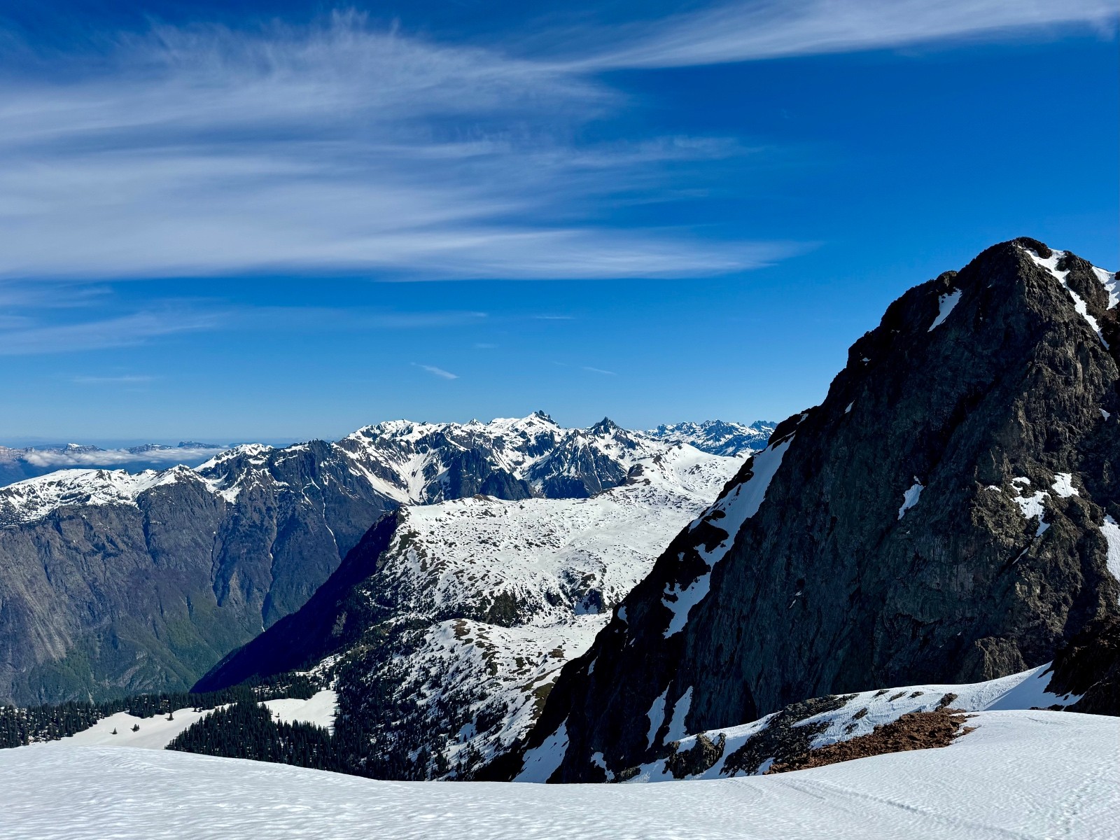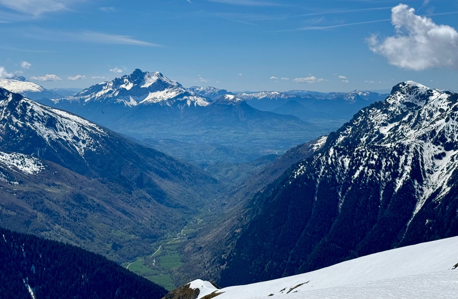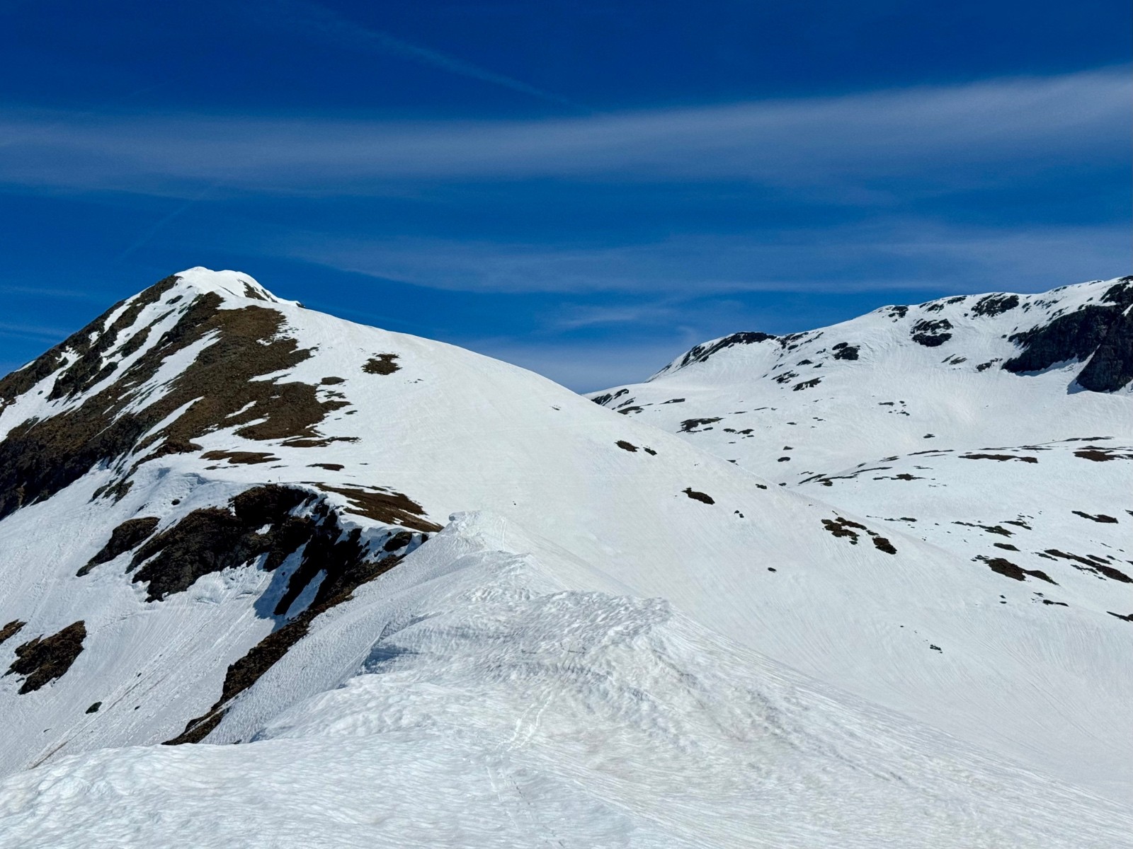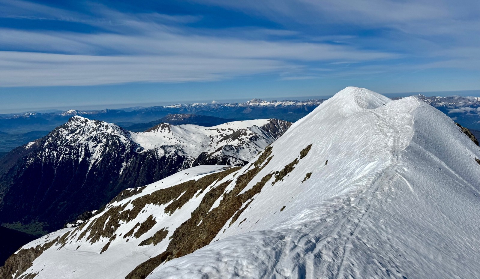 Première descente de la combe de l'Emay bien ferme encore sur le haut puis devenant agréable. Les zones lisses (peu nombreuses) sont un régal ! Repeautage pour regagner le Pas de la Mine : l'idée de le descendre à skis (ou de remettre les crampons) ne m'emballe guère. Ce sera donc un retour par l'Arête de Brouffier et le Pas de la Vache. Encore très panoramique, une bonne idée malgré les 2/3 déchaussages. D'ici une semaine cela ne passera plus vraiment à skis.. Du coup je peaute une troisième fois au lac de Brouffier pour remonter sur "l'altisurface". La neige y est encore bien bonne et ce sera le cas jusqu'au déchaussage à 1660. Le retour à la voiture ne prend alors guère de temps.