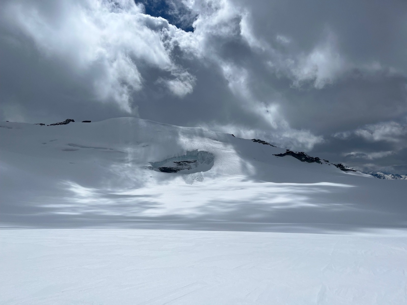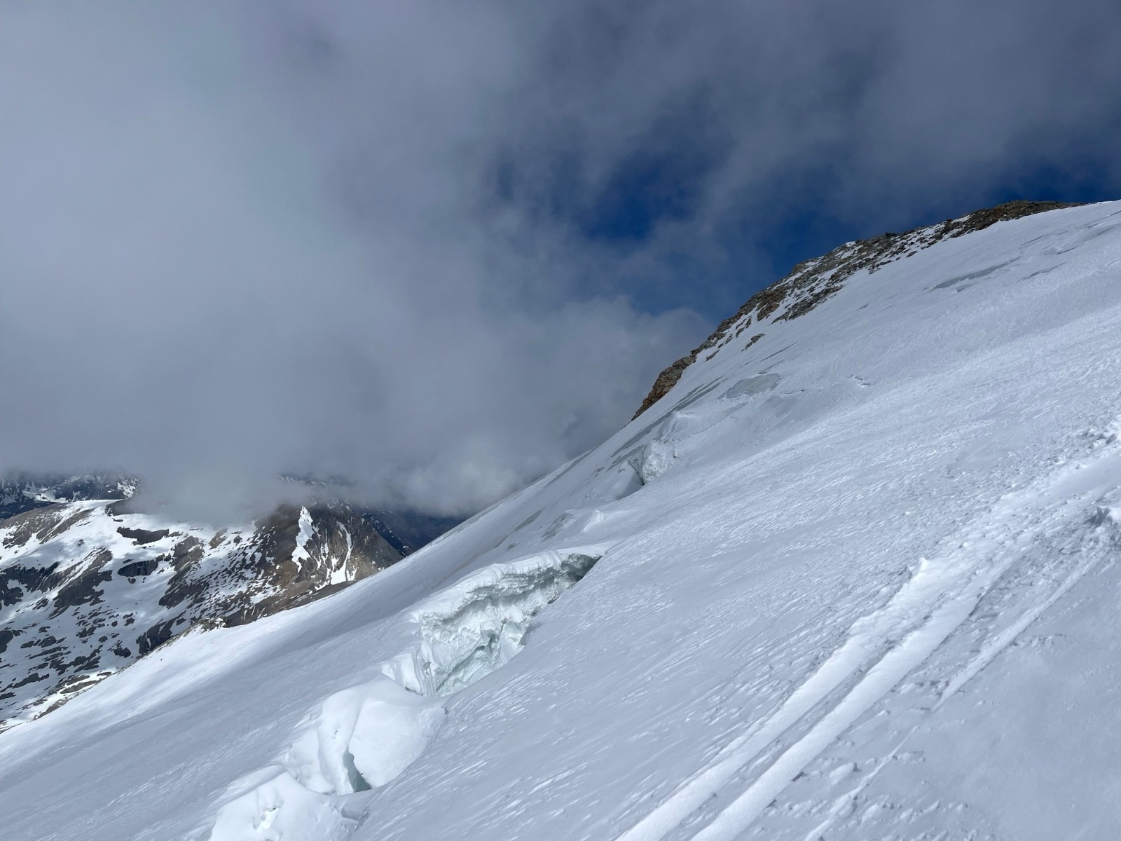 Descente pas fofolle, mais au moins on y voyait. Quelques rencontres furtives avec des crevasses.