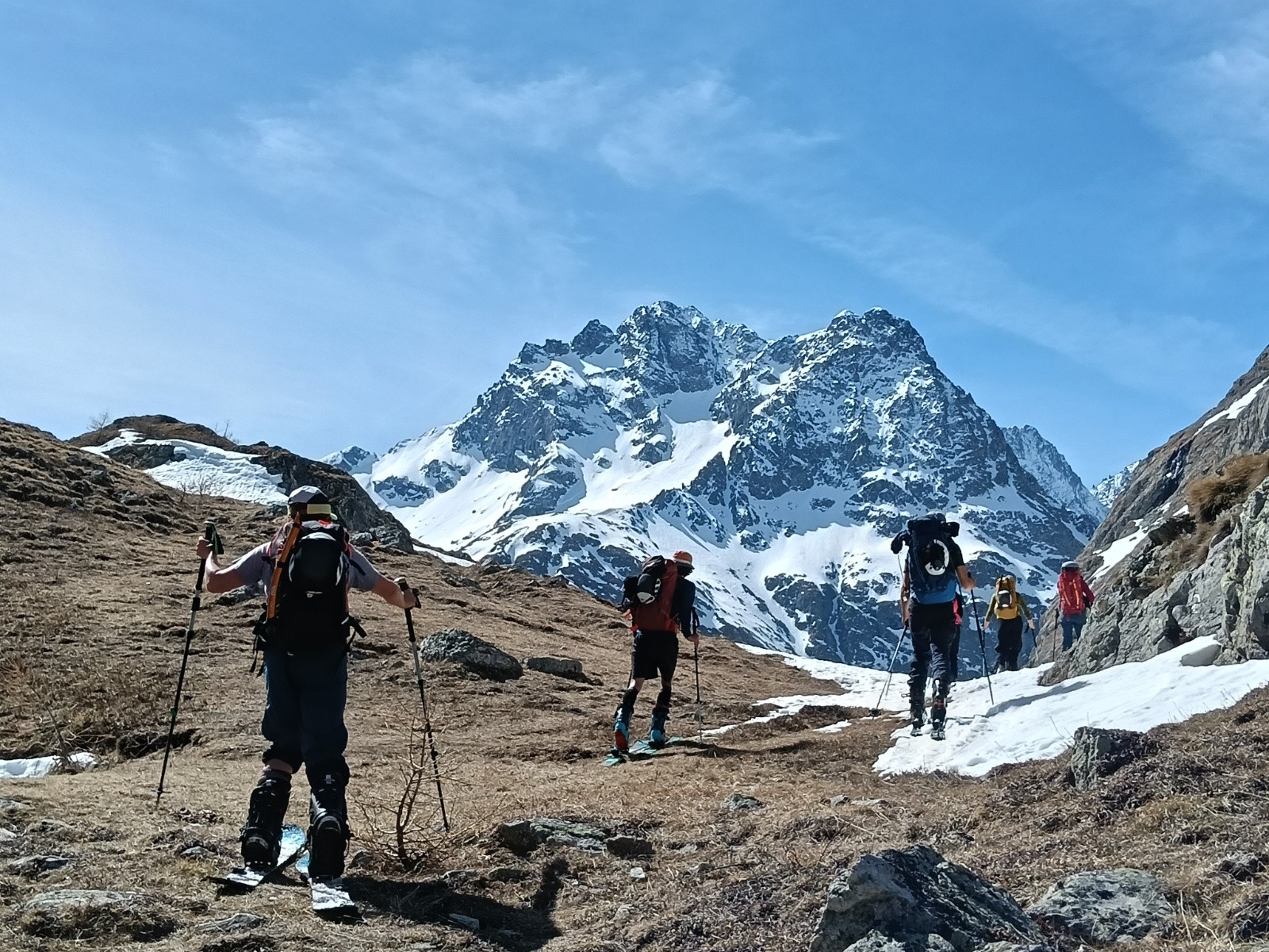 Itinéraire suivi : le plan original était la tour de la Meije, mais en montant au refuge du lac de Pavé on nous a dit que le serret de savon n'est pas dans les meilleurs conditions, et le refuge a confirme ça. Donc, changement du plan, on fait la tour de la Grande Ruine. En fait, c'est presque pareil, 3 cols pas si facils, beaucoup des crampons, presque pas de ski, et un sommet pour le troisième jour. Donc, la deuxième journée commence avec le col de la Grande Ruine, qui est bien et pas trop compliqué. Après avoir passé le col il faut tourner a droite et marcher un peu avec des crampons, avant de descendre la neige glacée a ski. La montée au pied du col de la Casse Déserte est assez directe, mais le col est intéressant. Il y a un corde fixe au milieu, mais âpres quelques tentatives on a pris le petit couloir a gauche, parce que le milieu fait peur, le roche tient pas du tout et il y a beaucoup qui tombe. A gauche, il y avait comme 2 mètres de merde, ou les cailloux sont pas du tout stables est c'est pas agreable de monter. Apres il y a un relais et on peut assurer les autres. Mais il y a plus de neige que a la droite et donc ça marche. Les deux sont possible. Bilan: C'est le Col de Casse Gueule. Comme on est des étrangers, on est assez fier de ce jeu des mots. La descente du col de Casse Déserte est assez raide, et on nous a dit qu'il y a deux relais, mais on les n'a pas trouvé. Si on veut on peut faire un relais avec des skis. On arrive assez tard pour le col de la Neige, est la neige est horrible. C'est un combat d'y monter. Au col, il faut marcher un peu a gauche pour pouvoir descendre au refuge de Adéle Planchard. La troisième journée on mont a la Grande Ruine. On prend le couloir au milieu pour monter, la vue est incroyable, on prend des fotos, on parle avec des Espagnols d'Asturias, et on descende. Comme il y a du monde dans le couloir, on prend le "couloir caché" un peu plus bas. Il est moins raide (je trouve) et pas trop exposé. On est tôt, la neige est dure et ça descend bien (aussi bien pour monter). Après, on peut finalement skier. C'est la première fois dans 3 jours de pouvoir profiter, la neige est assez dure mais âpres le refuge c'est la neige de printemps. Les derniers kilomètres sont plats et ça prend du temps. Le compte rendu: C'est pas un tour pour les splitboarders, et il n'y a pas des cols faciles aux Écrins