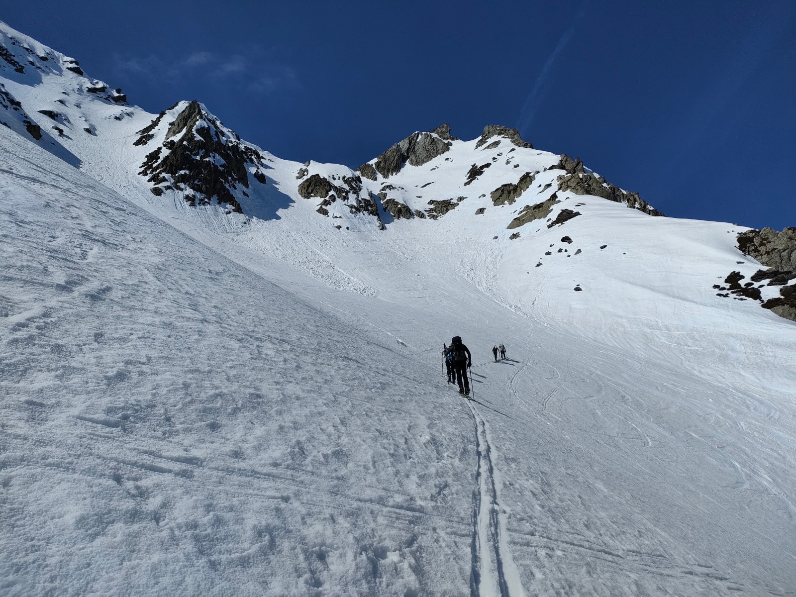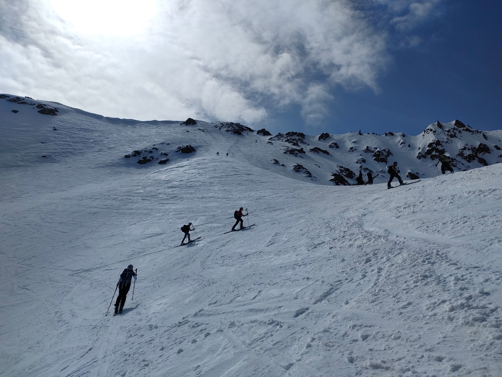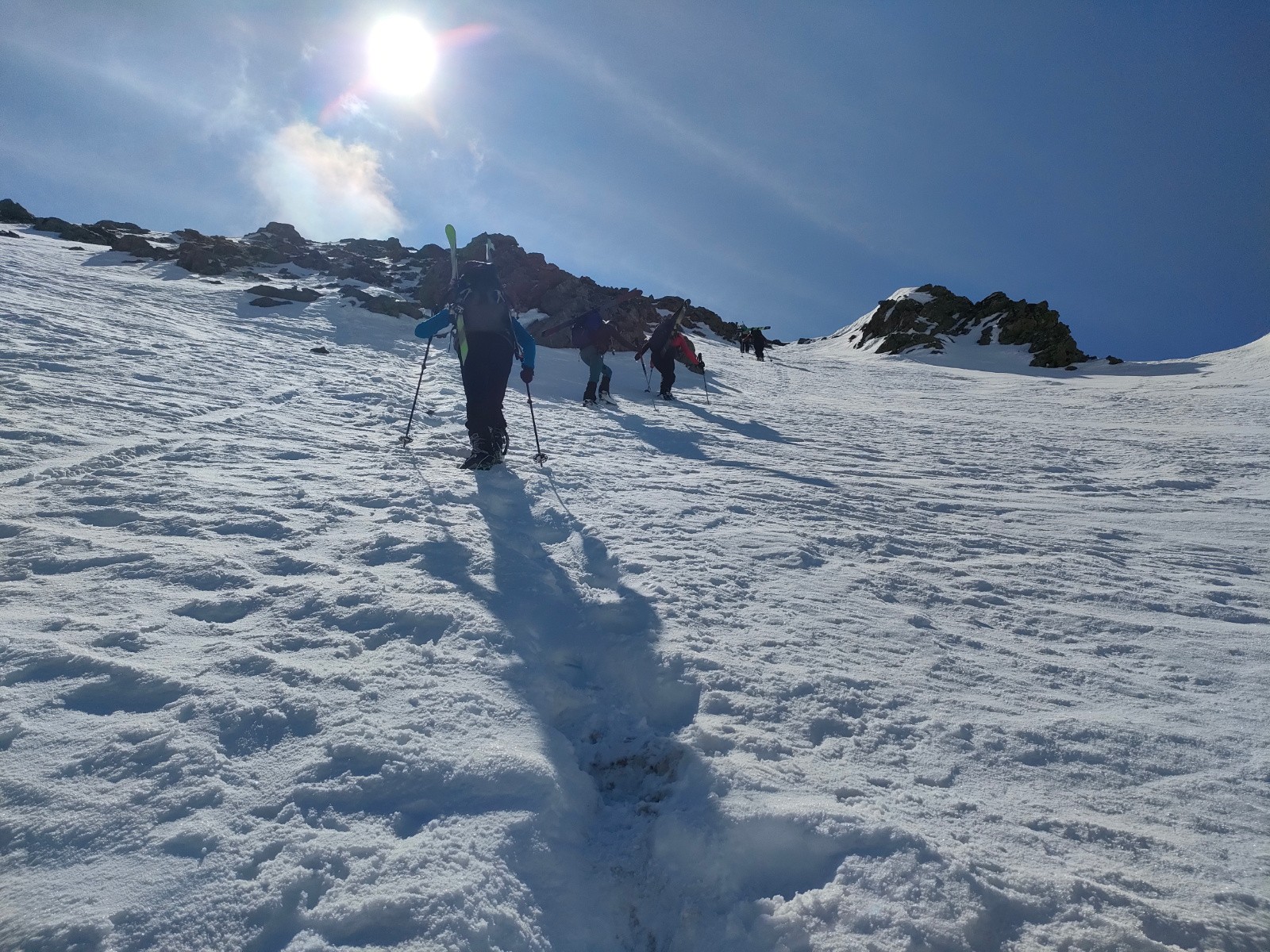 Le soleil est désormais Roi et nous accueille à la sortie de la pente aussi aimablement qu'un four thermostat 200°C accueille son poulet rôti. Pour parfaire la cuisson, on se graisse de crème solaire tous pour 2h de montée. Le groupe évolue rapidement dans ce nouveau passage, la neige commence à décailler, ça promet pour la descente. Au loin les forêts de basse montagne d'un beau vert foncé contrastent magnifiquement avec cette vallée blanche qui refuse encore un peu, de retirer sa robe d'hiver.