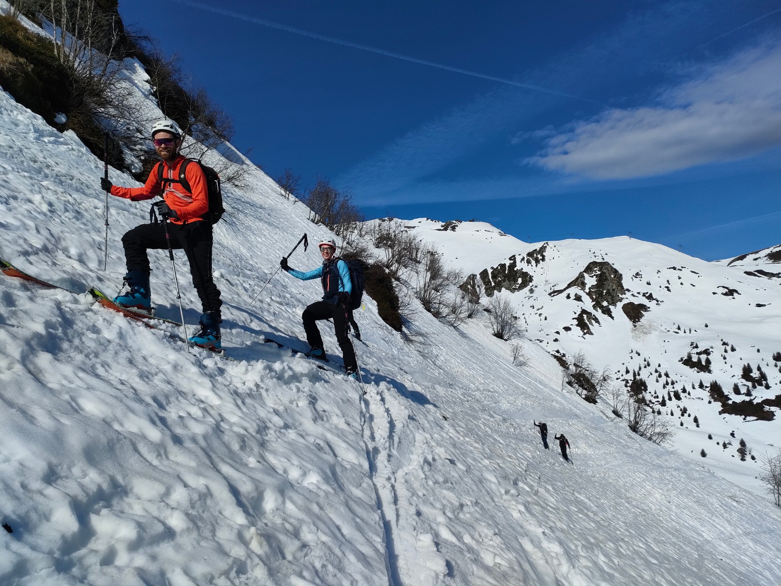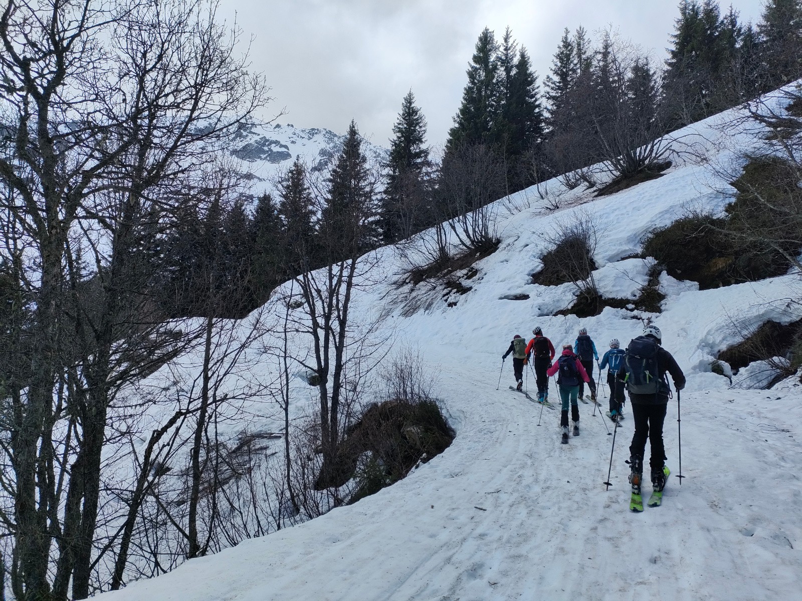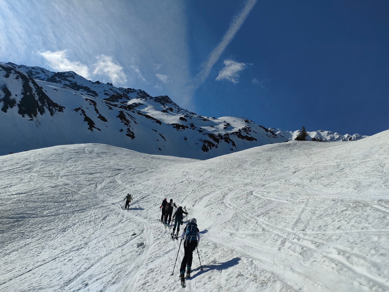 Le soleil est désormais Roi et nous accueille à la sortie de la pente aussi aimablement qu'un four thermostat 200°C accueille son poulet rôti. Pour parfaire la cuisson, on se graisse de crème solaire tous pour 2h de montée. Le groupe évolue rapidement dans ce nouveau passage, la neige commence à décailler, ça promet pour la descente. Au loin les forêts de basse montagne d'un beau vert foncé contrastent magnifiquement avec cette vallée blanche qui refuse encore un peu, de retirer sa robe d'hiver.