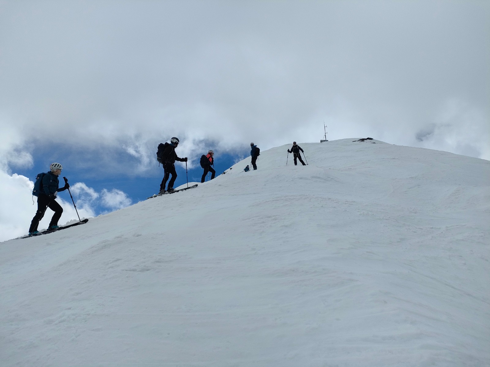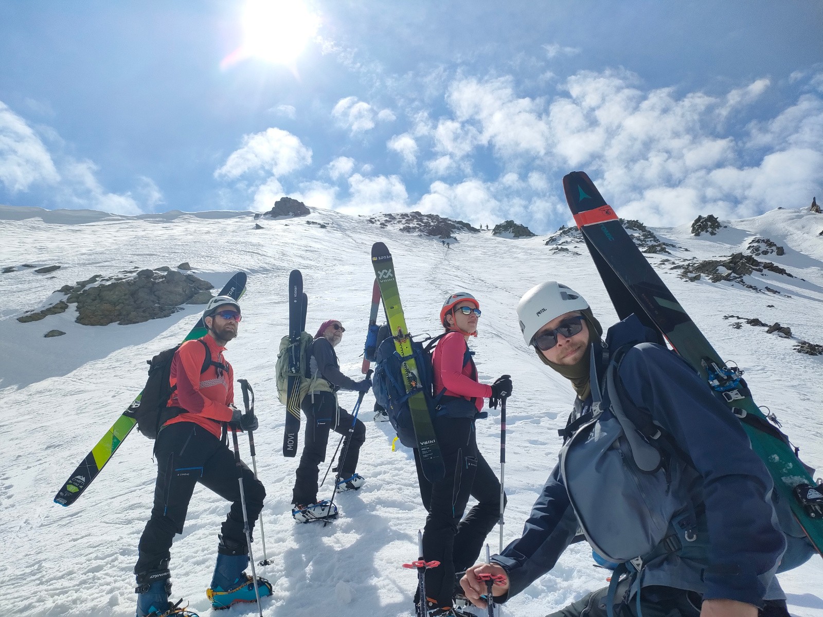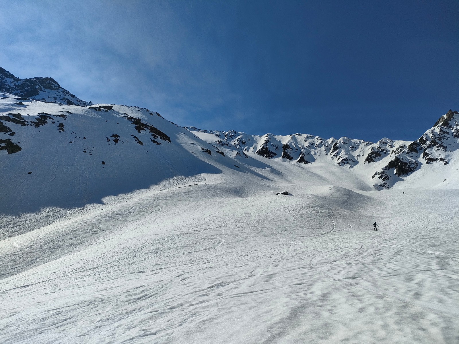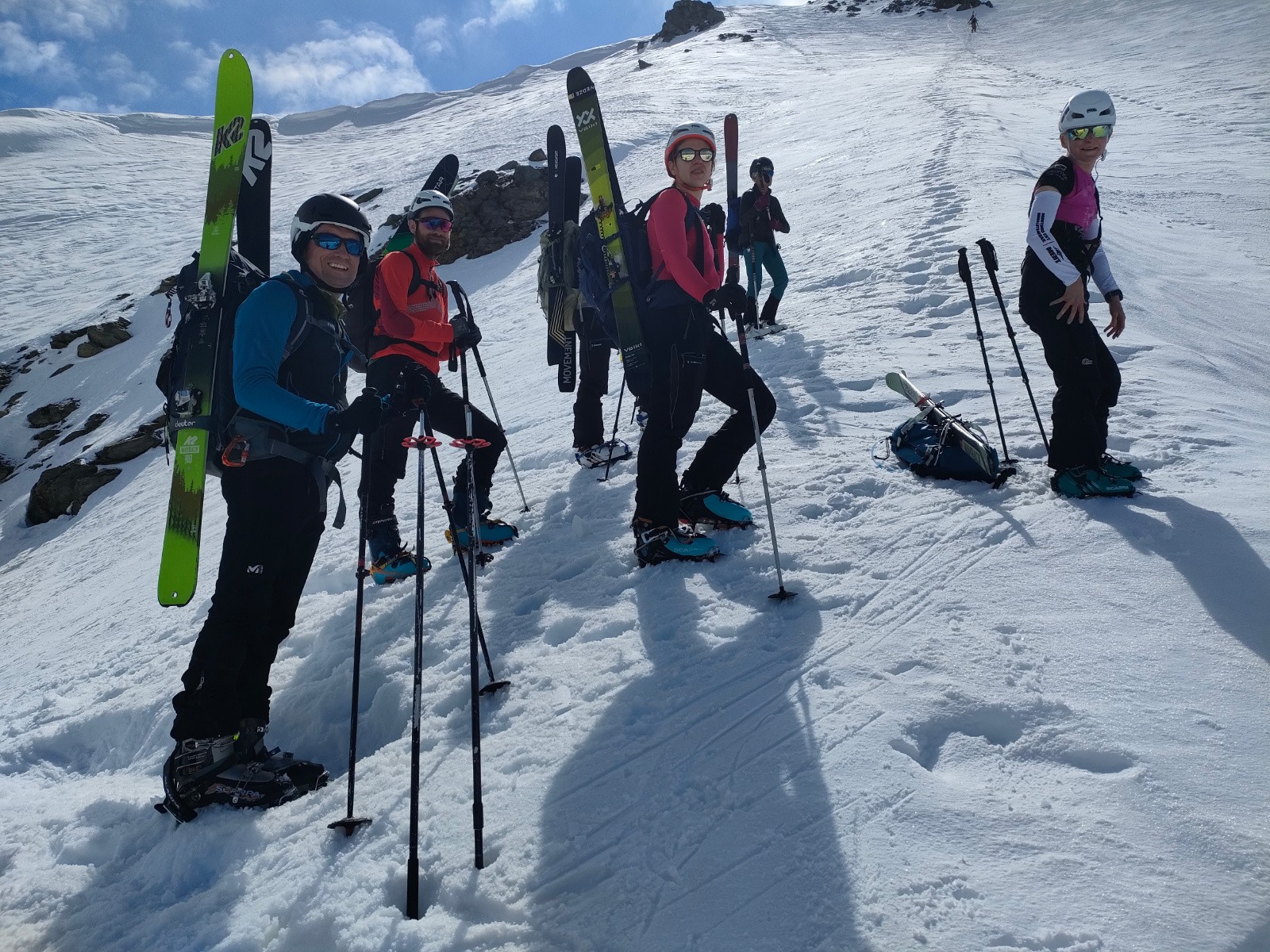 Mais, en montagne comme dans le Parti Communiste, on ne reste jamais longtemps au sommet, c'est l'heure de la descente qui s'annonce ! Là c'est hors de question de refaire la même erreur que hier, je verrouille les fix avant pour la partie raide. Et malgré une appréhension initiale, le groupe s'en sortira très bien sur cette partie technique. Les virages sautés seront tous couronnés de succès cette fois pour ma part (ouf enfin). Passés cette phase, c'est une neige printanière absolument fabuleuse qui nous attend toute la suite de la descente, de la moquette de perlinpinpin, un pur bonheur, sûrement une, sinon la, meilleure descente de ma vie. Les sourires sont de sortie chez tout le monde. On continuera ainsi à descendre jusqu'en bas en profitant un maximum, la neige s'alourdissant de manière limitée.