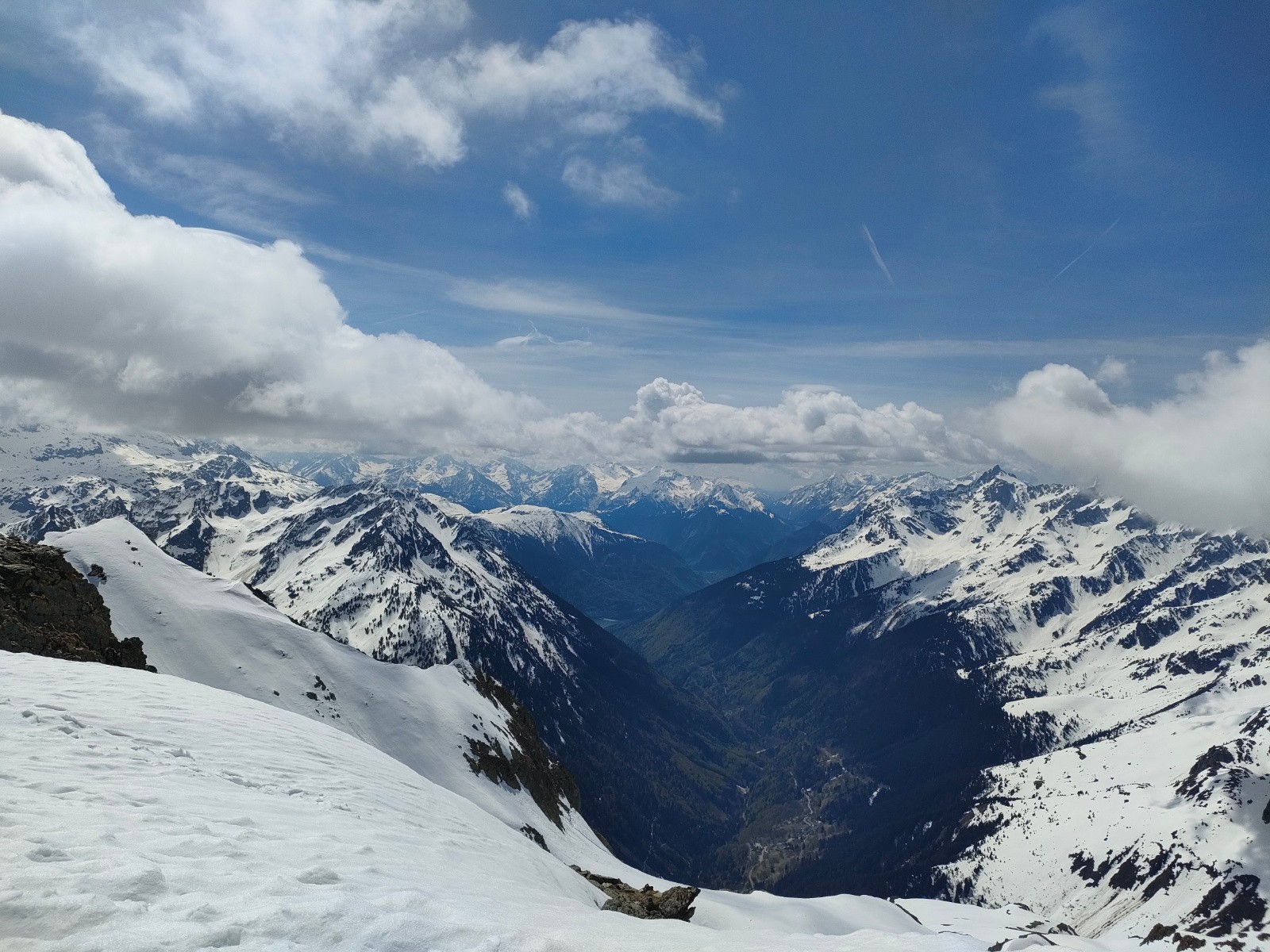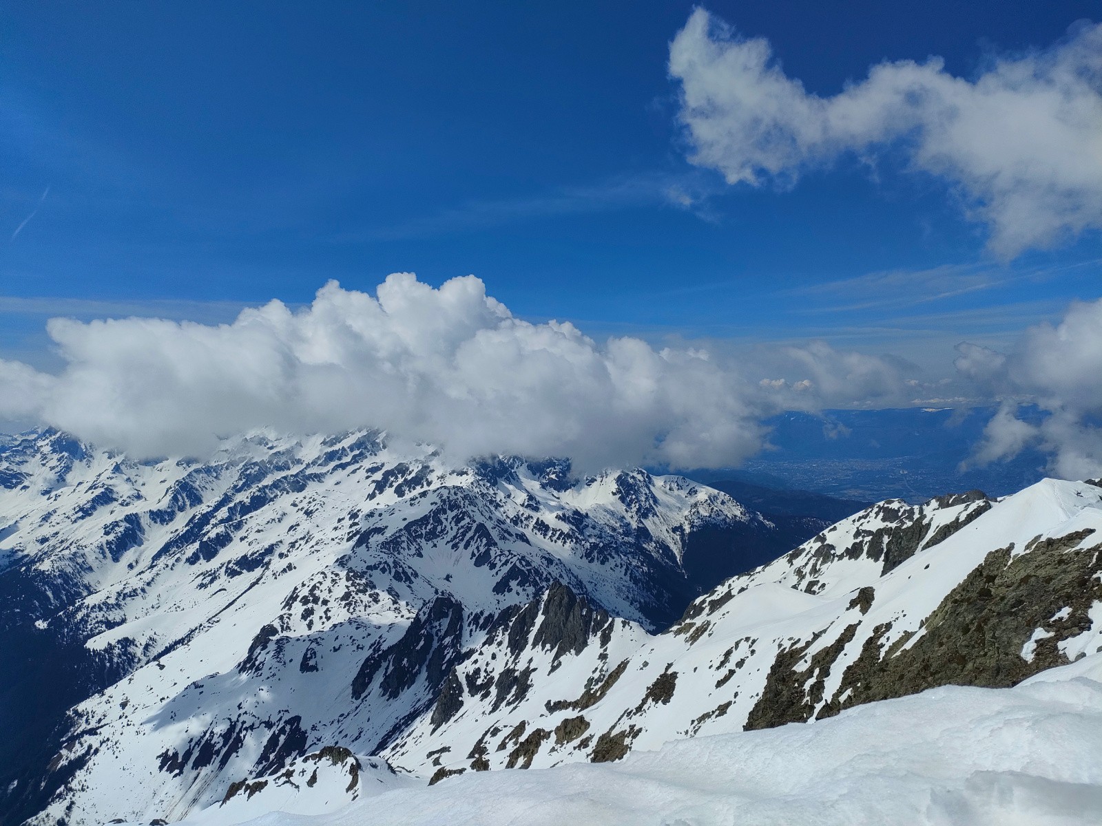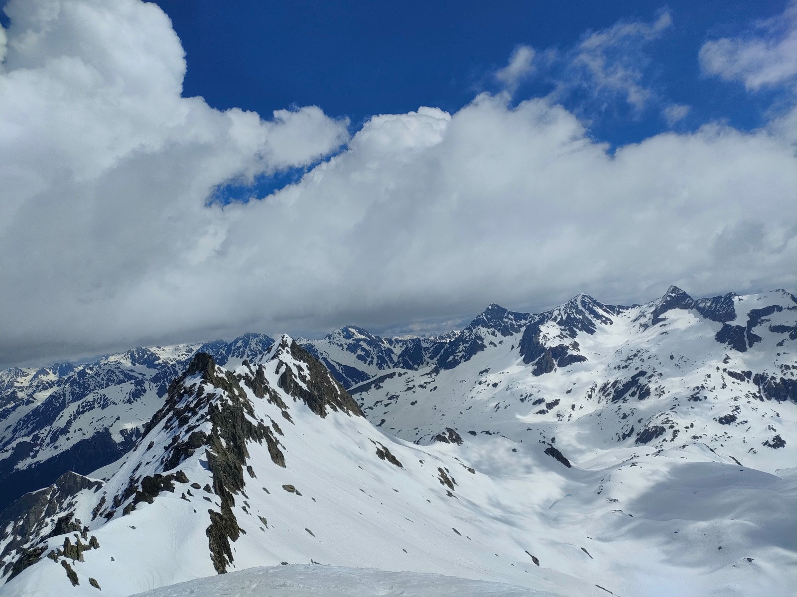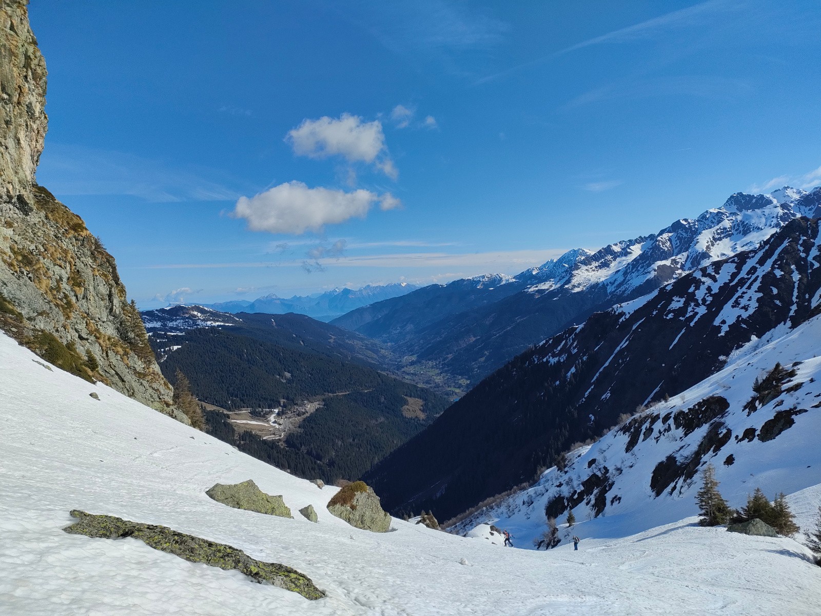 Mais, en montagne comme dans le Parti Communiste, on ne reste jamais longtemps au sommet, c'est l'heure de la descente qui s'annonce ! Là c'est hors de question de refaire la même erreur que hier, je verrouille les fix avant pour la partie raide. Et malgré une appréhension initiale, le groupe s'en sortira très bien sur cette partie technique. Les virages sautés seront tous couronnés de succès cette fois pour ma part (ouf enfin). Passés cette phase, c'est une neige printanière absolument fabuleuse qui nous attend toute la suite de la descente, de la moquette de perlinpinpin, un pur bonheur, sûrement une, sinon la, meilleure descente de ma vie. Les sourires sont de sortie chez tout le monde. On continuera ainsi à descendre jusqu'en bas en profitant un maximum, la neige s'alourdissant de manière limitée.