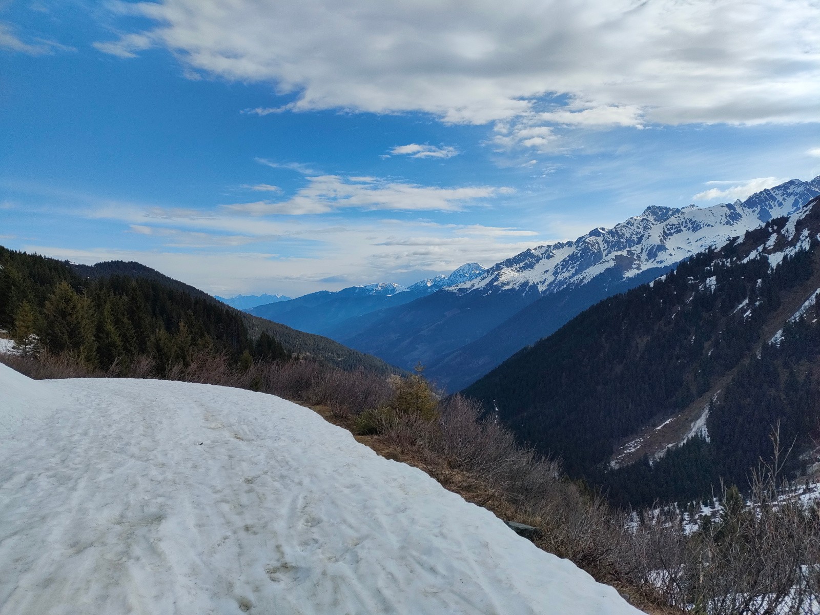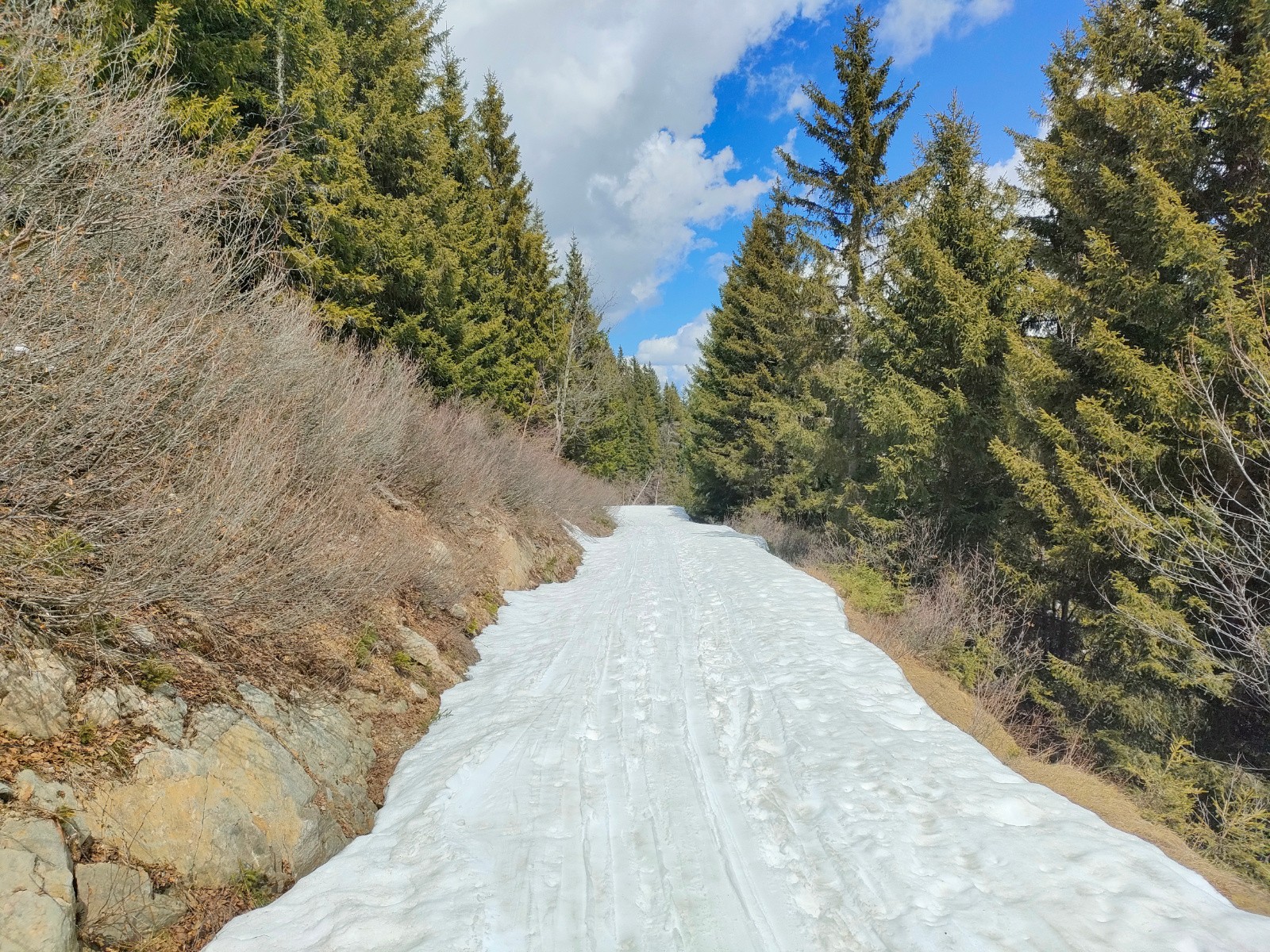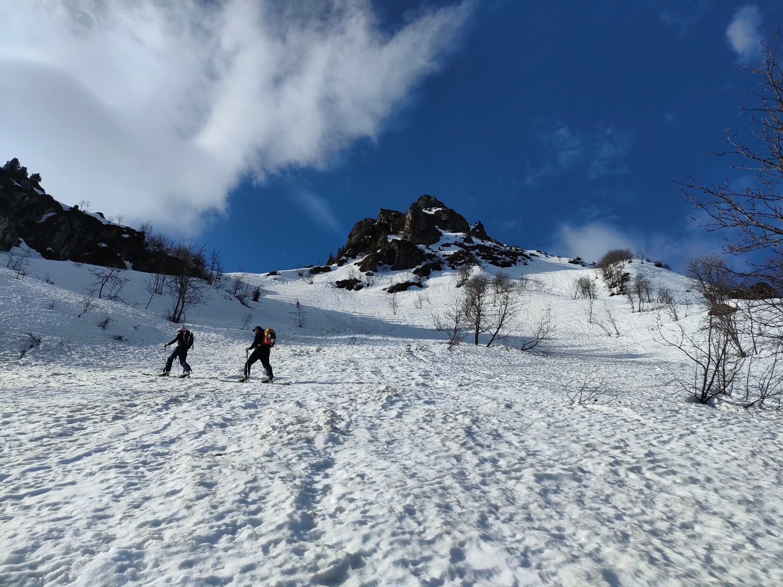 Sur les dernières longueurs de la piste des Vallons du Pra, la neige devient intermittente, l'hiver est bientôt parti à cette altitude, j'en suis tout triste... La où de nombreux membres du groupe renoncent, acceptent de céder au printemps en déchaussant honteusement, Nicole et moi, on ne lâchera pas l'affaire ! Et tant pis pour les semelles sur les cailloux on tiendra le front jusqu'àu bout.