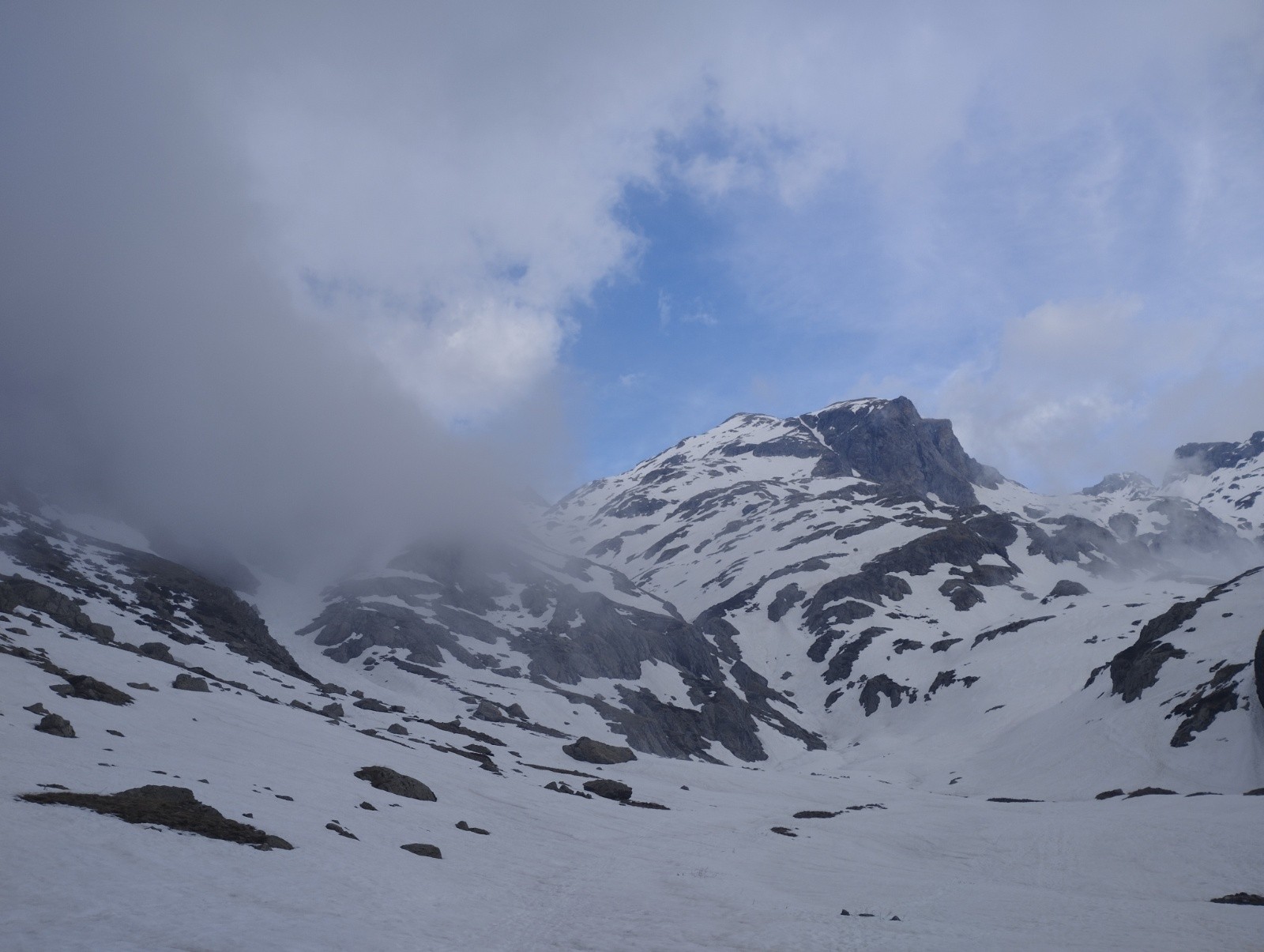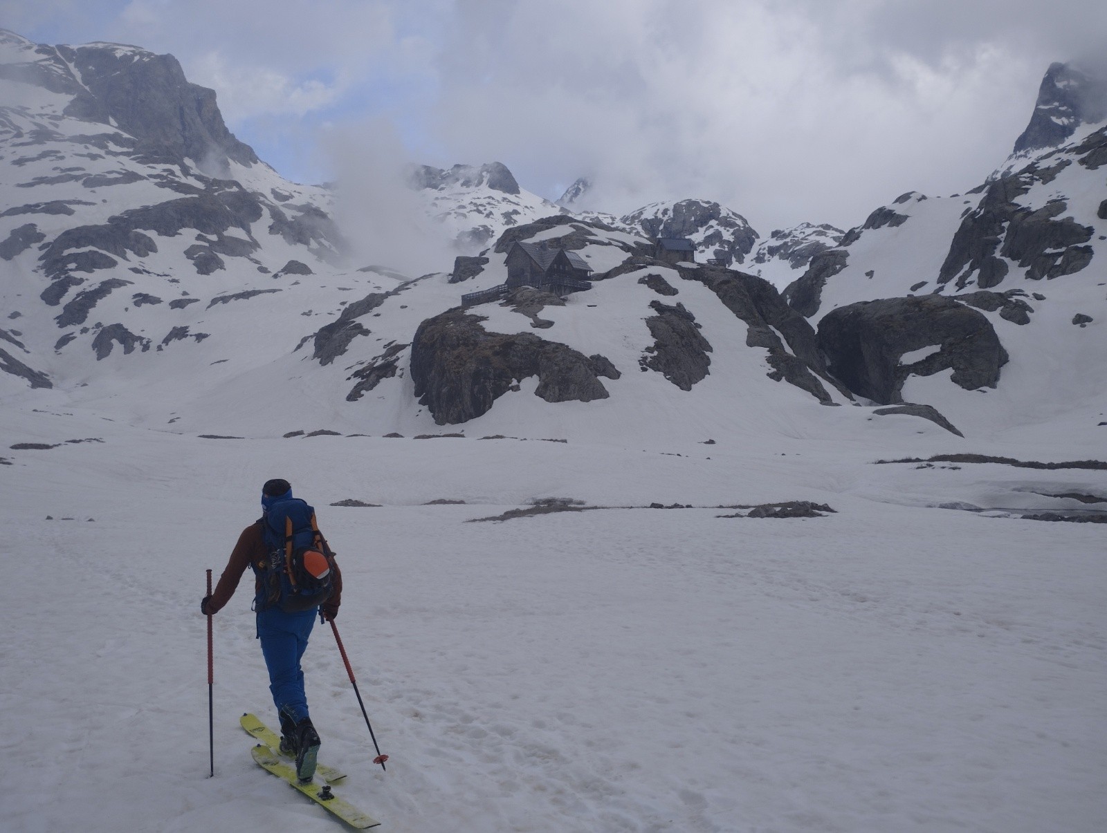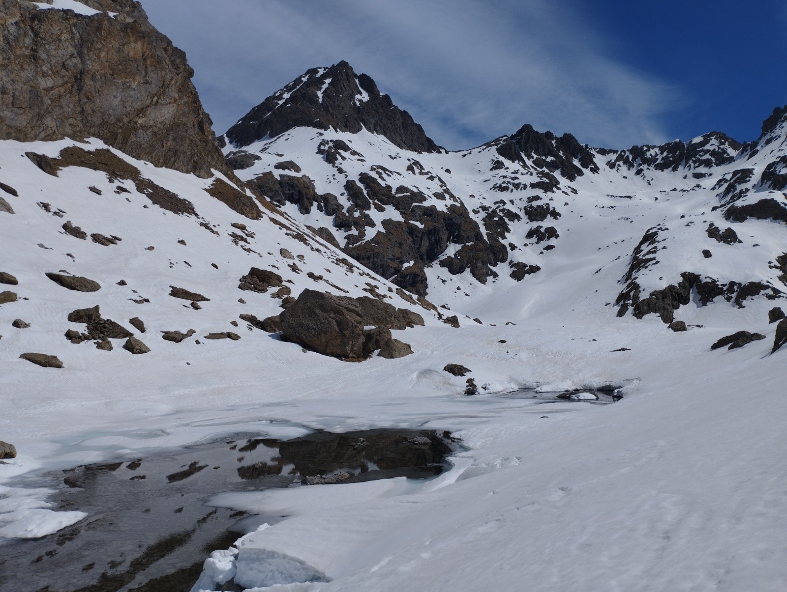 Début de descente vers 11h20, on aura attendu en vain un peu de décaillage mais c'est encore trop tôt aujourd'hui (la veille il fallait descendre à 10h....). Descente dans les vallons avec quelques bons passages en neige en cours de transfo (il aurait fallu descendre 1h plus tard pour une transfo homogène). Repeautage au dessus du refuge pour une remontée caniculaire à la Baisse Niré à faire couler une bielle. On arrive à la Baisse, ça commence à se bâcher. La neige est ici bien transformée. Belle descente sur le Lac Autier. On arrive à skier un peu au dessous du Lac. Retour à Pieds à traversant quelques névés au départ.