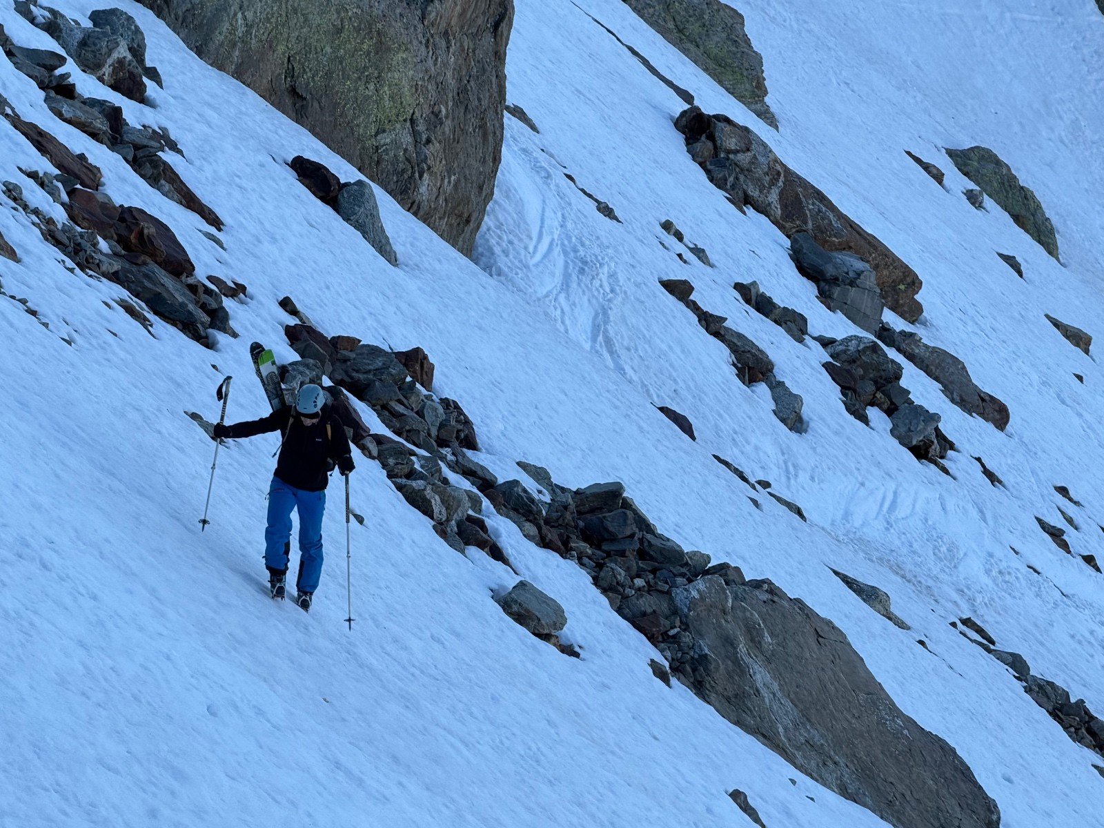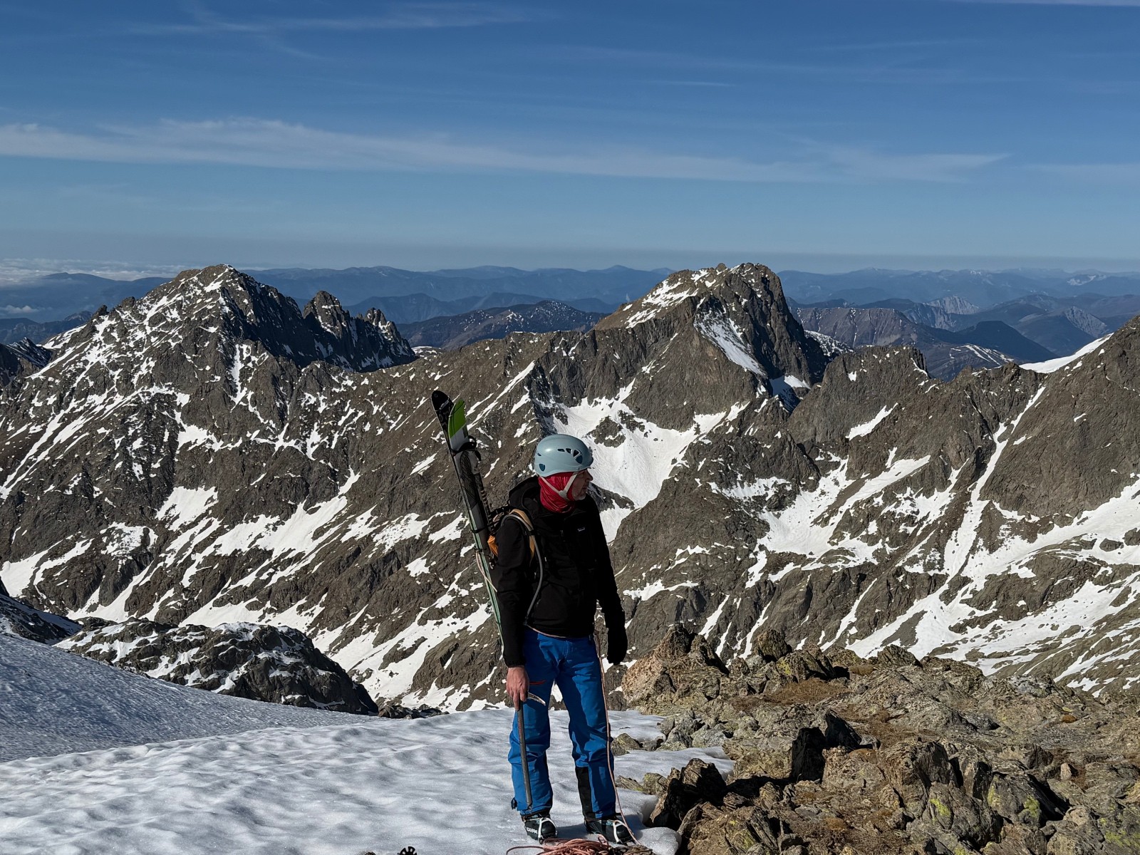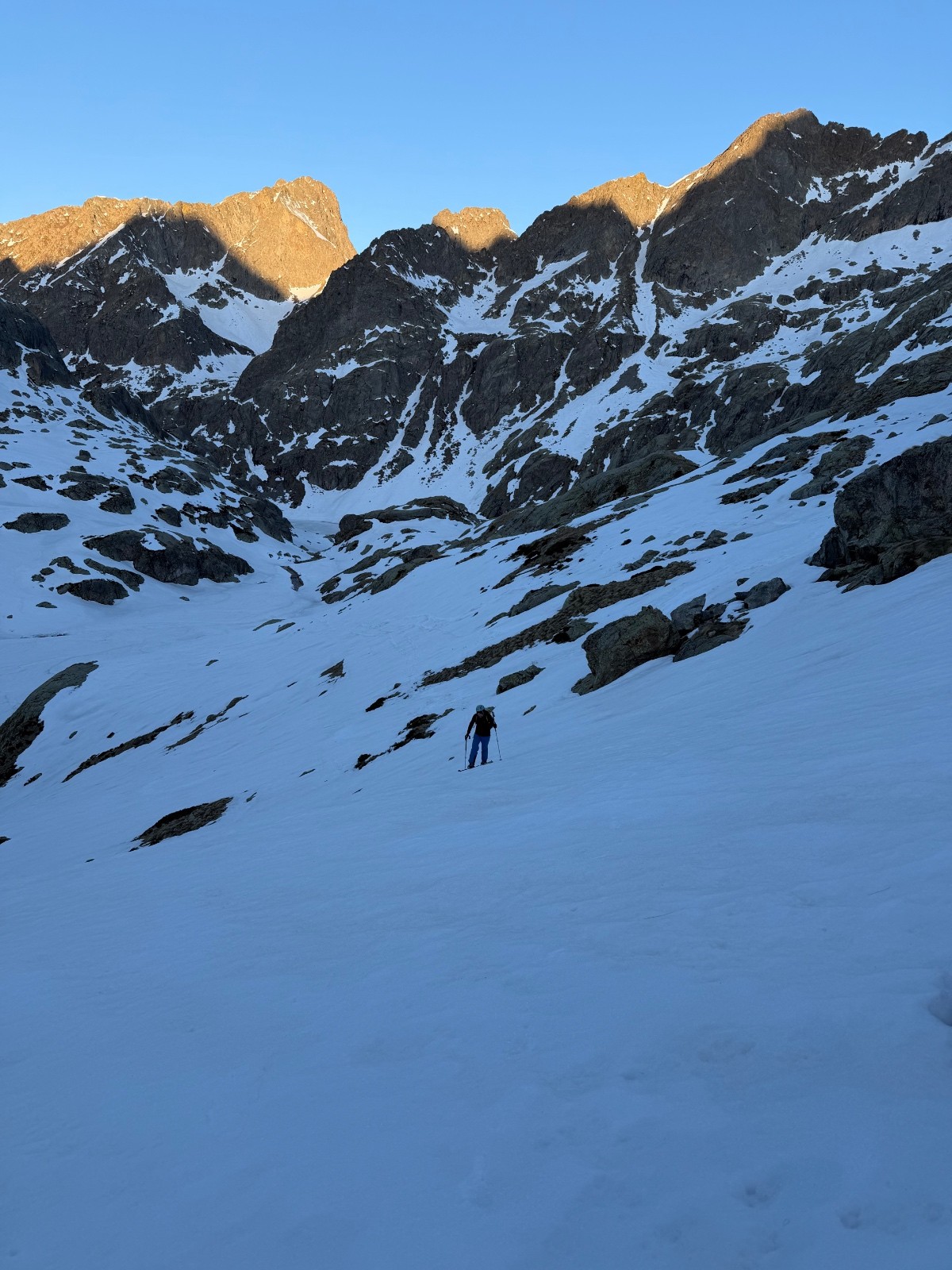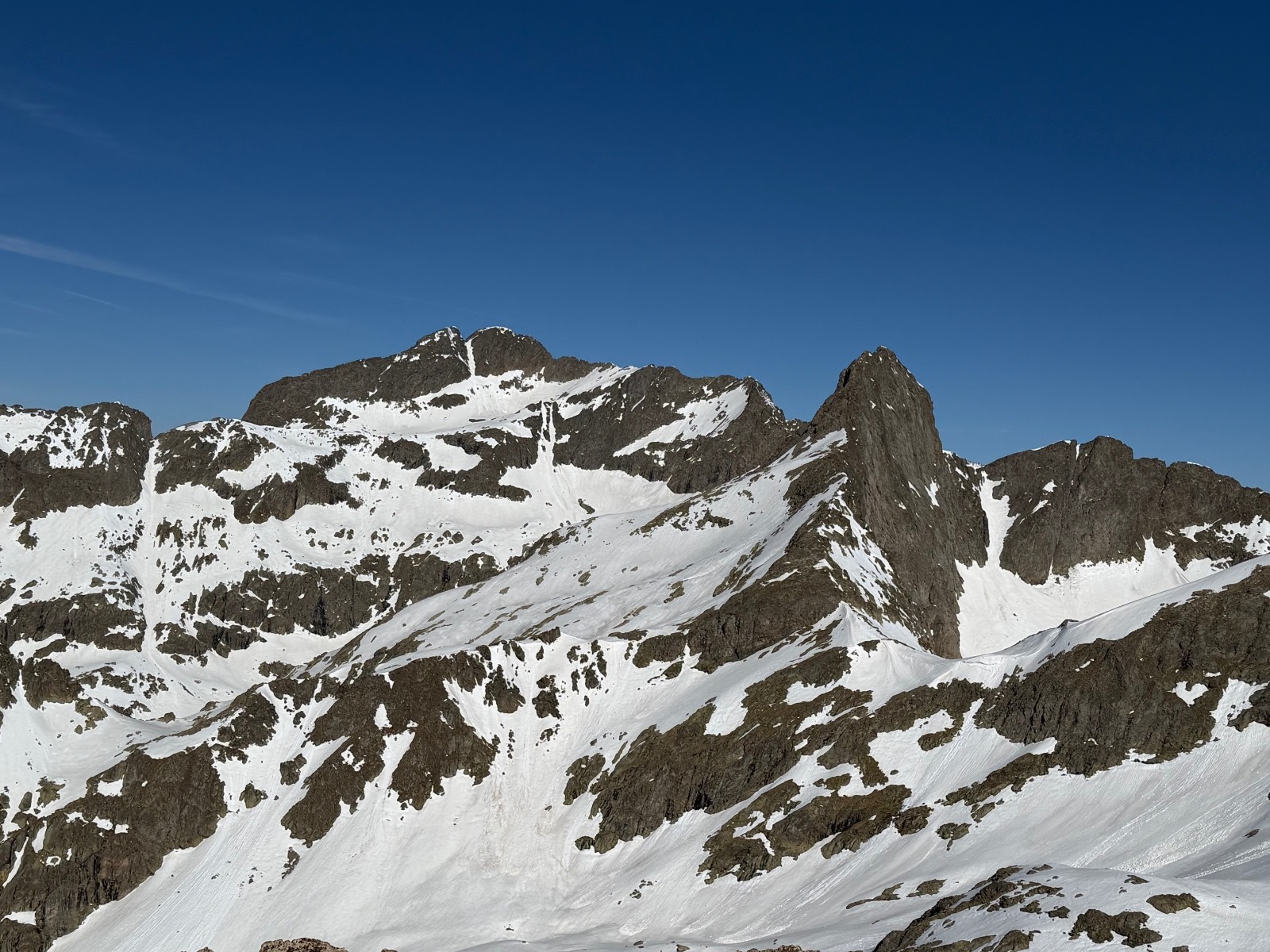 Départ Lundi 6h20, grand beau, regel béton. Peut-être même trop. On arrive au pied du couloir Asquaciatti tracé avec de belles marches sécurisantes mais en neige béton. On troque les couteaux pour les crampons (que Laurent ne quittera plus jusqu'au sommet) Le couloir n'est pas très raide sauf sur la fin où la neige est encore un peu plus dure pour mettre un peu plus d'ambiance. Belle sortie au soleil qui réchauffe. Ne reste plus que 150-200 m pour rallier le sommet qui est en partie dégarni. Visite au couloir SE du Clapier bien rempli mais encore trop dur à cette heure.