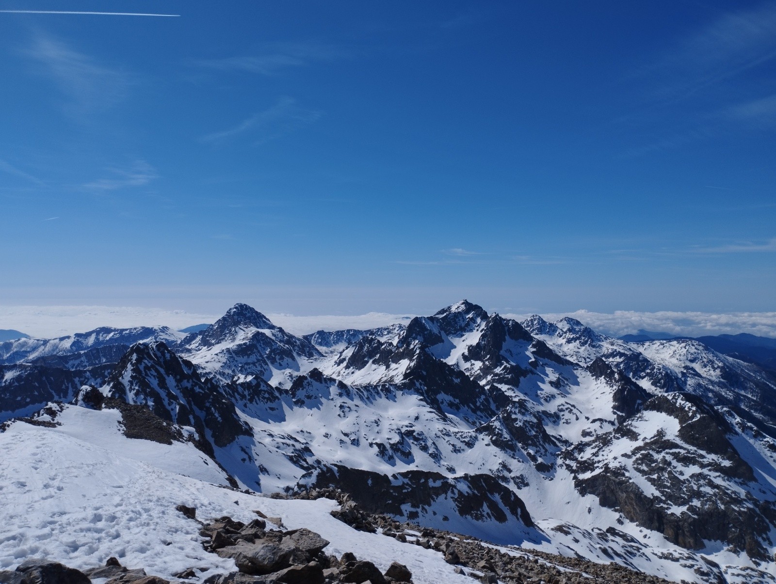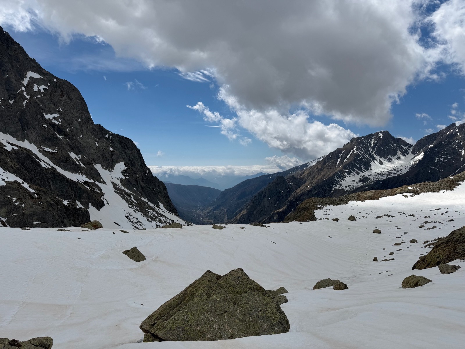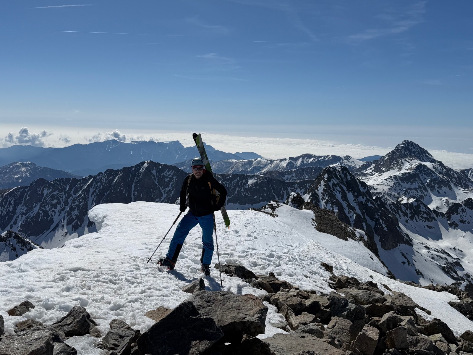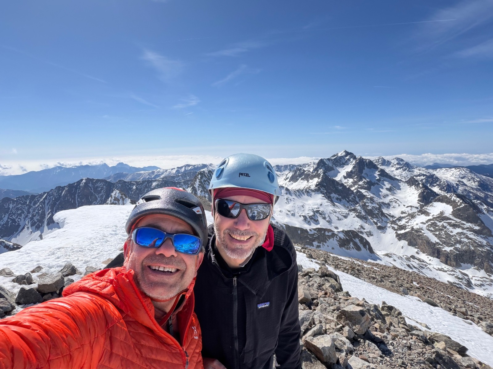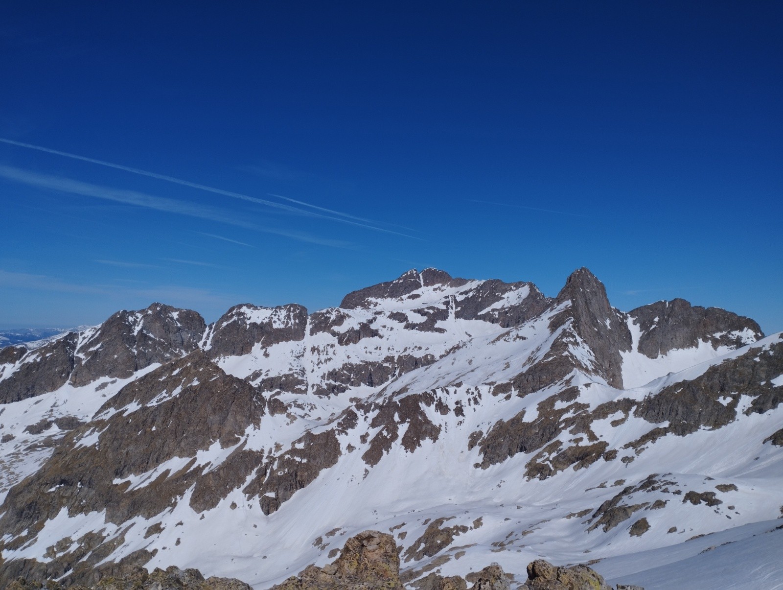 Départ Lundi 6h20, grand beau, regel béton. Peut-être même trop. On arrive au pied du couloir Asquaciatti tracé avec de belles marches sécurisantes mais en neige béton. On troque les couteaux pour les crampons (que Laurent ne quittera plus jusqu'au sommet) Le couloir n'est pas très raide sauf sur la fin où la neige est encore un peu plus dure pour mettre un peu plus d'ambiance. Belle sortie au soleil qui réchauffe. Ne reste plus que 150-200 m pour rallier le sommet qui est en partie dégarni. Visite au couloir SE du Clapier bien rempli mais encore trop dur à cette heure.