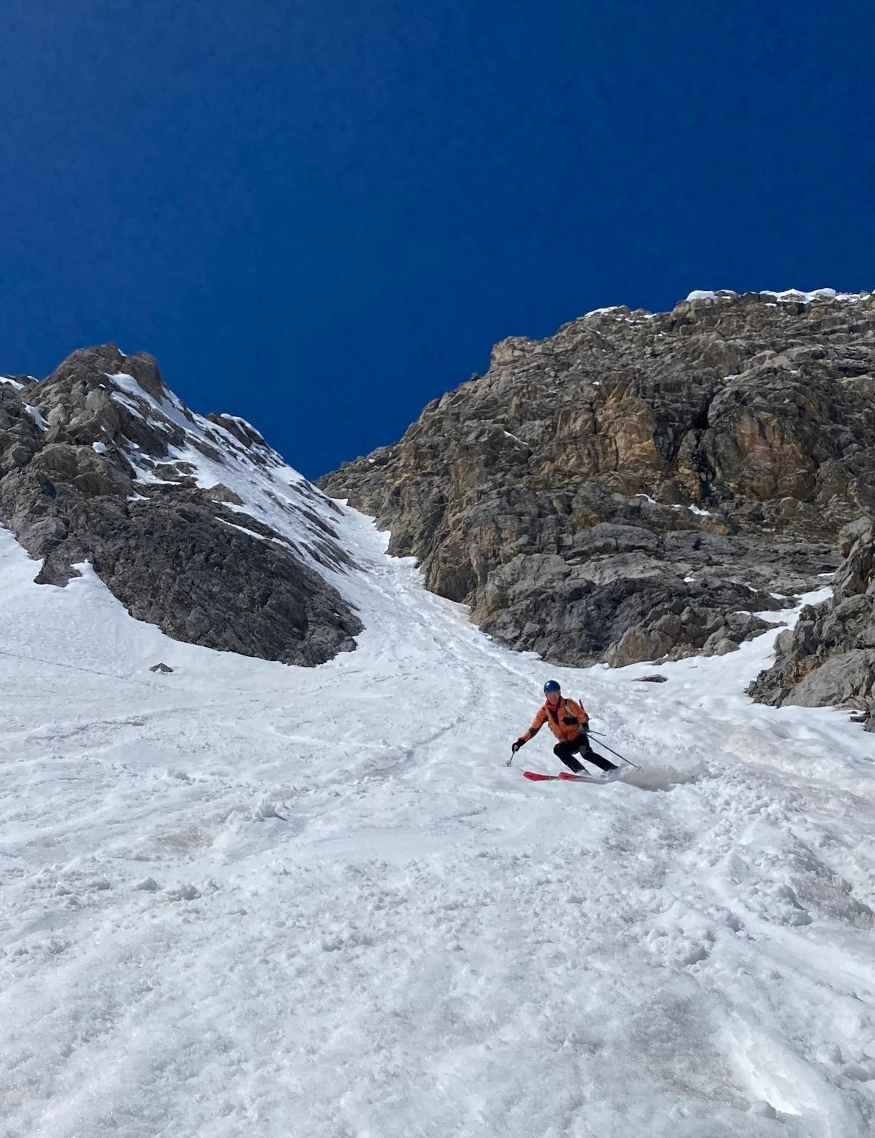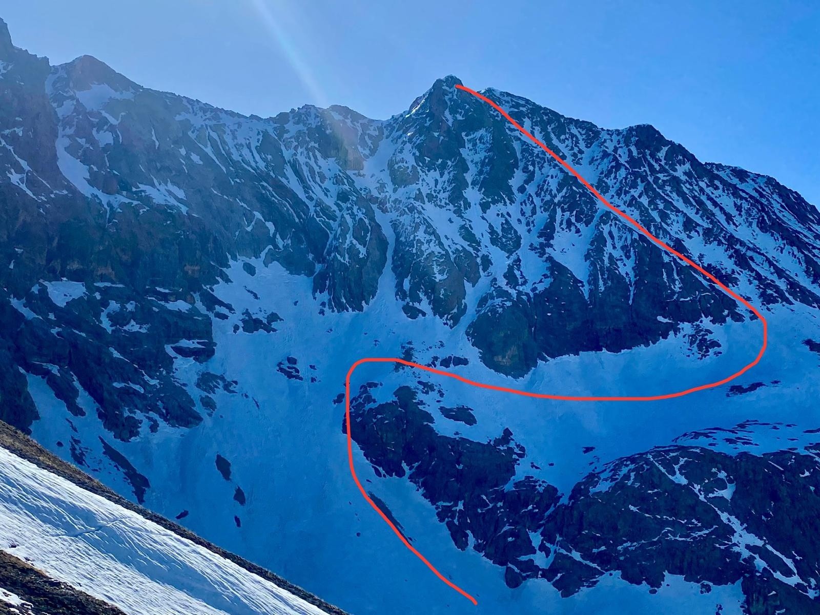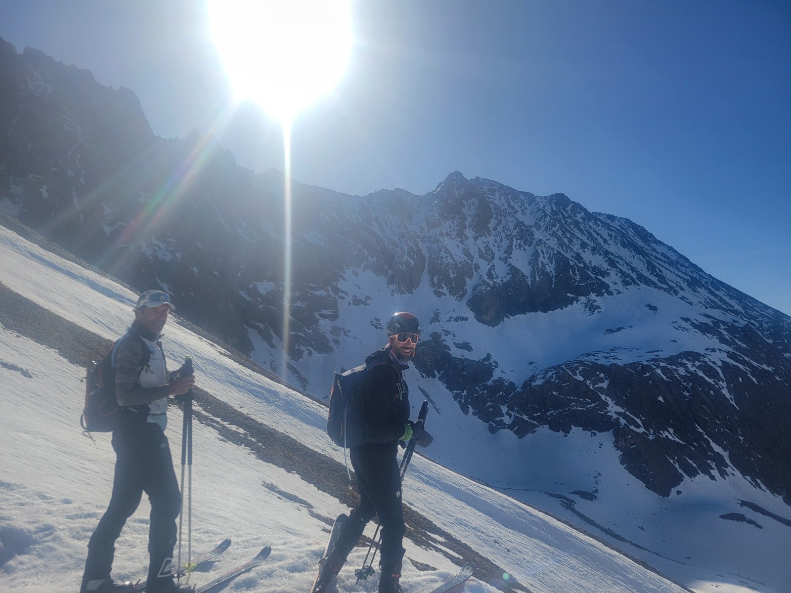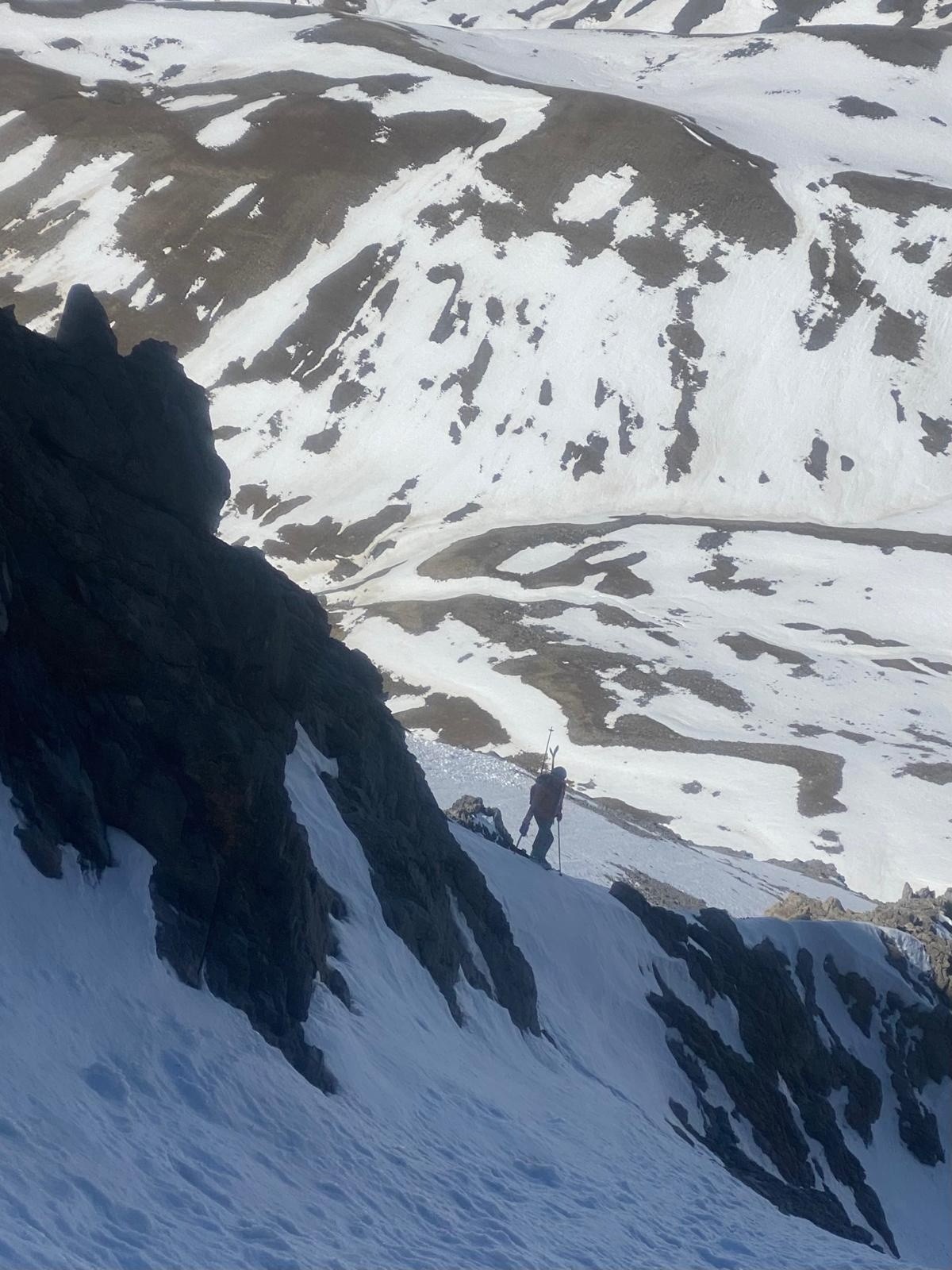 Du sommet sud 3174m, on est descendu en ski 50° jusqu'à la brèche sous laquelle juste à gauche en descendant se dévoile le couloir Est , rectiligne, belle ambiance, en neige un peu ramollie mais pas trop vers 11h, descendre jusqu'au pied du couloir vers 2600m dans le vallon des Hugues , au sud du col des Ugousses, col que l'on remonte tranquille sauvage au soleil ! ;