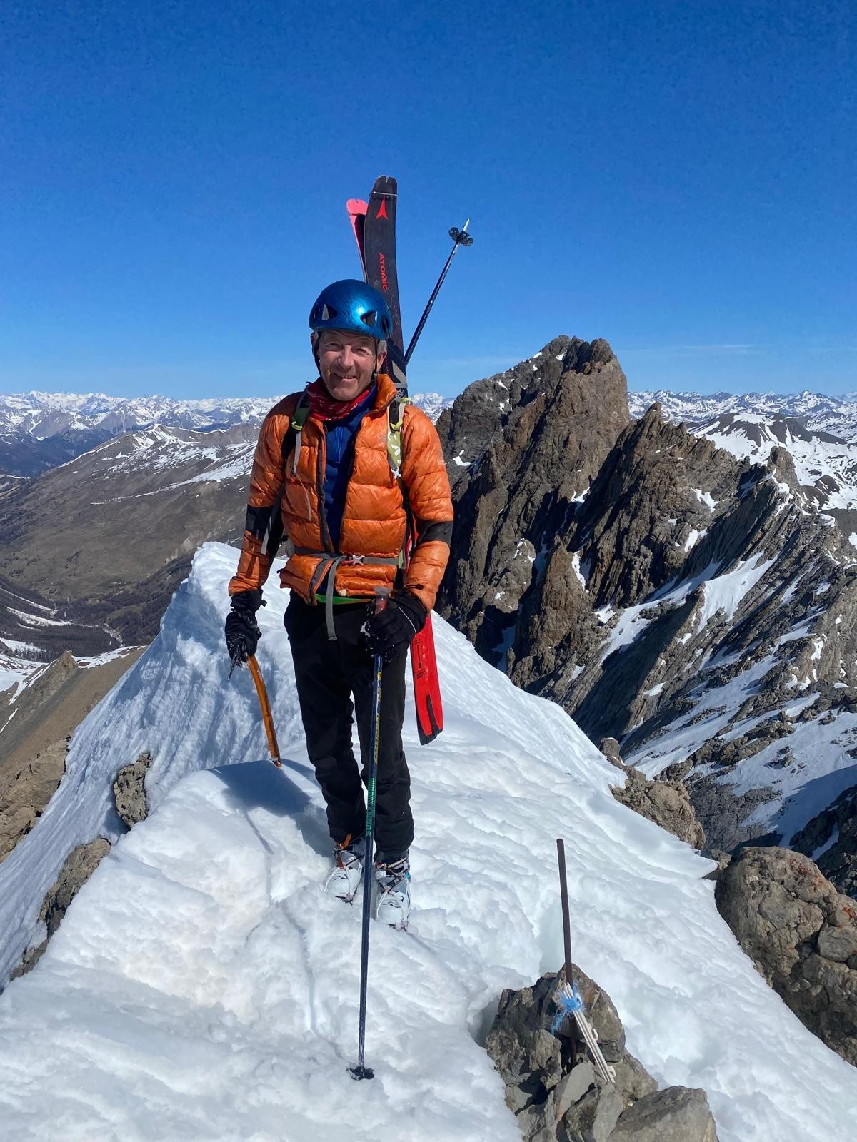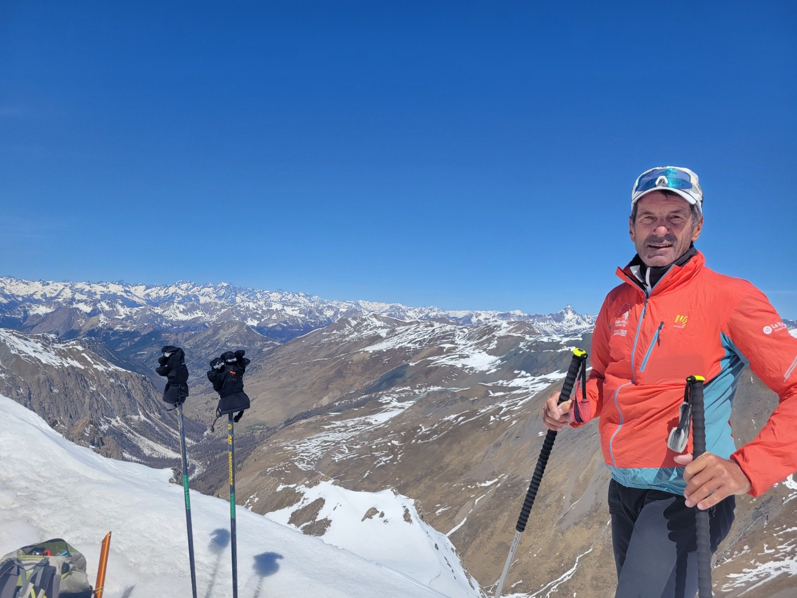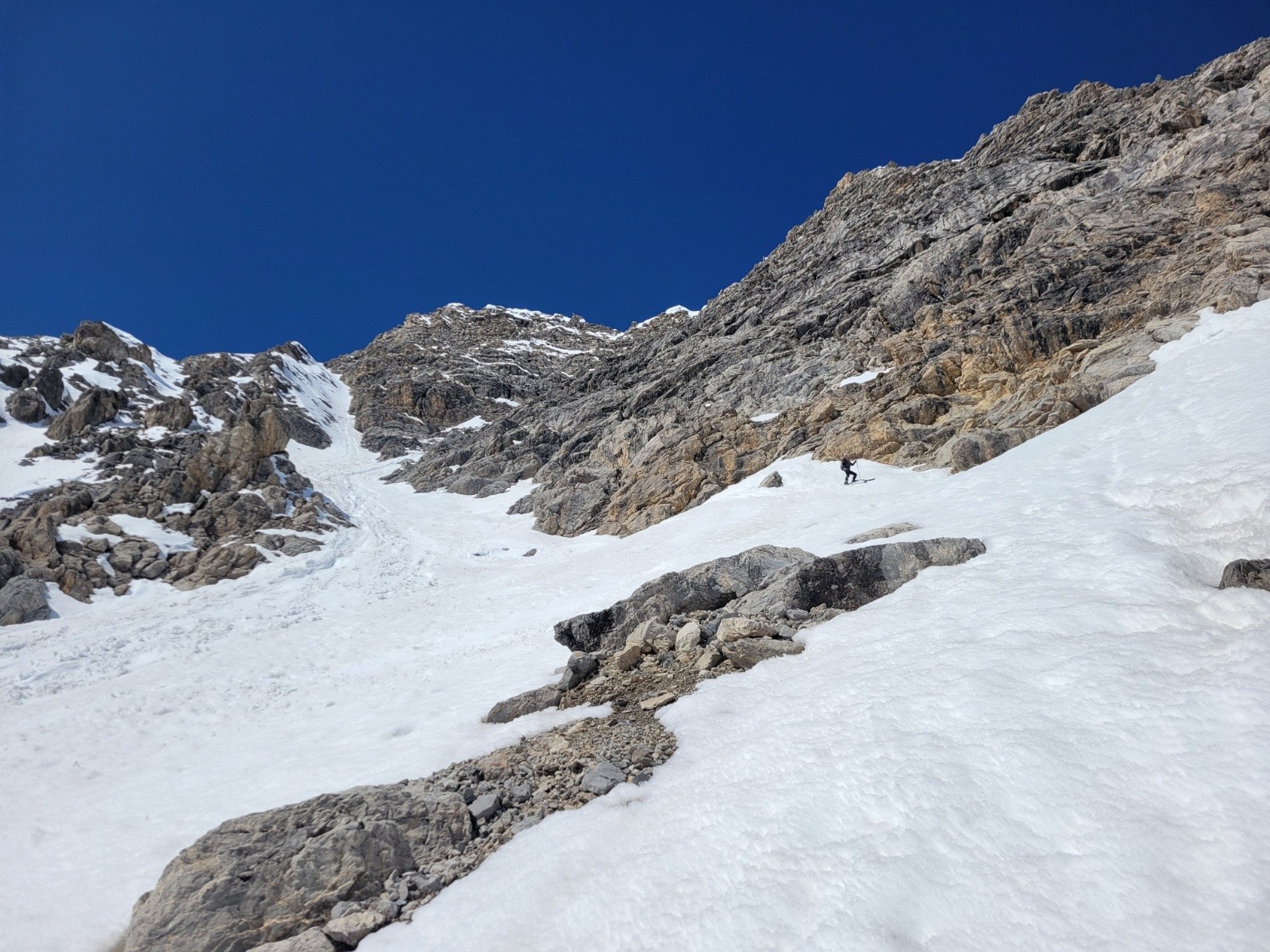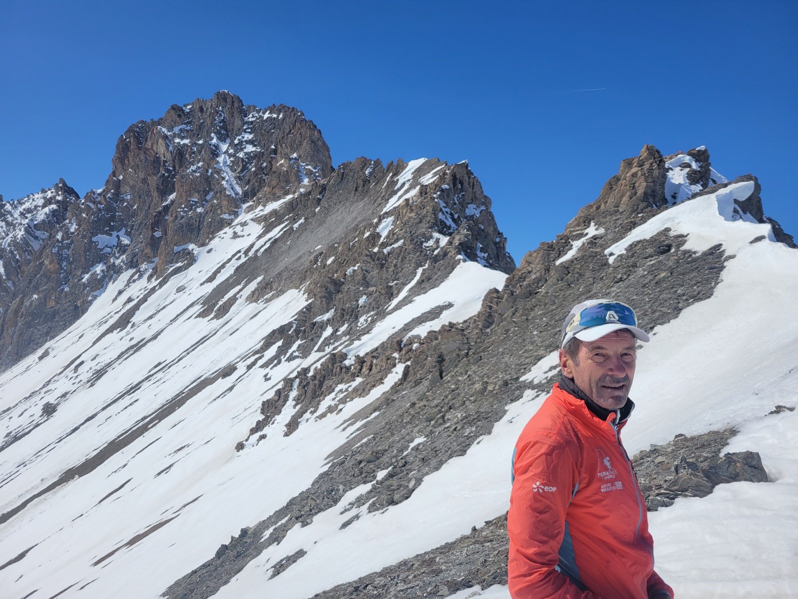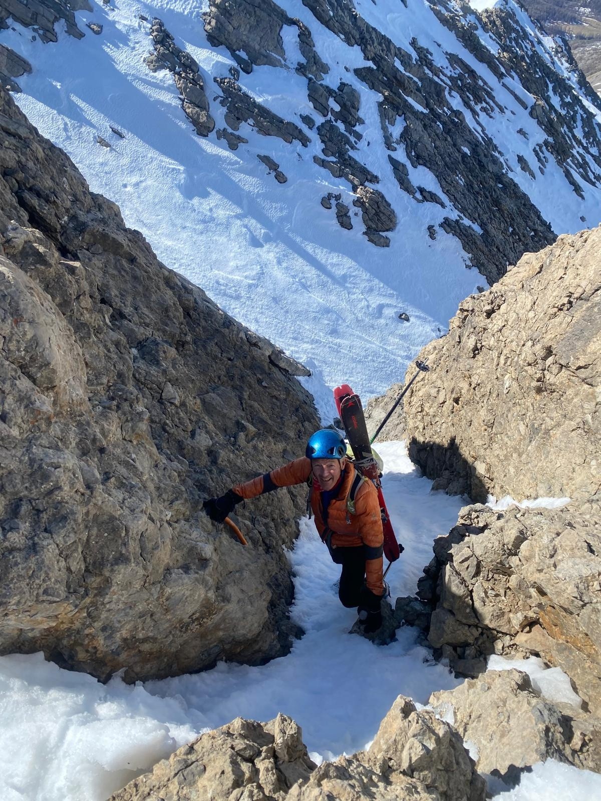 Du sommet sud 3174m, on est descendu en ski 50° jusqu'à la brèche sous laquelle juste à gauche en descendant se dévoile le couloir Est , rectiligne, belle ambiance, en neige un peu ramollie mais pas trop vers 11h, descendre jusqu'au pied du couloir vers 2600m dans le vallon des Hugues , au sud du col des Ugousses, col que l'on remonte tranquille sauvage au soleil ! ;