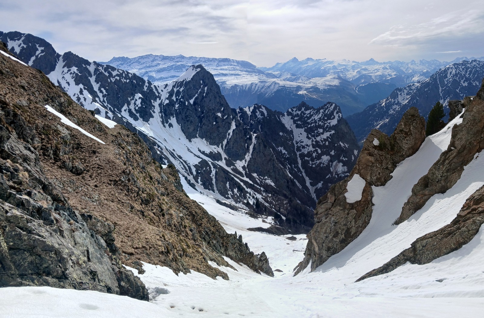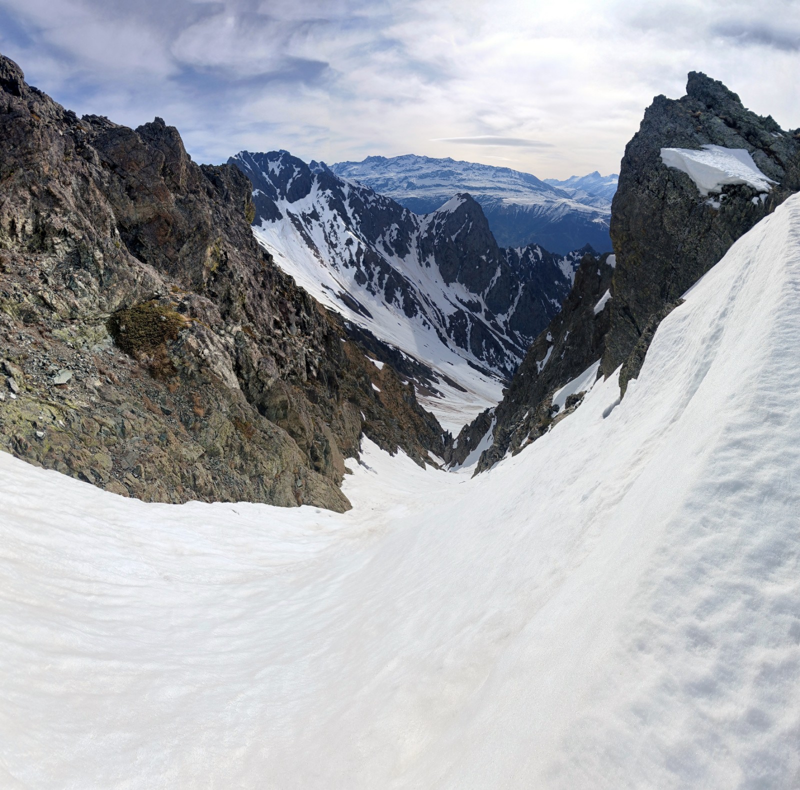 Montée E col de la Petite Vaudaine: moquette épaisse ou soupe, pénible à tracer, j'ai visée les zones enherbées pour monter à pied, couloir final en neige transformée assez dure
