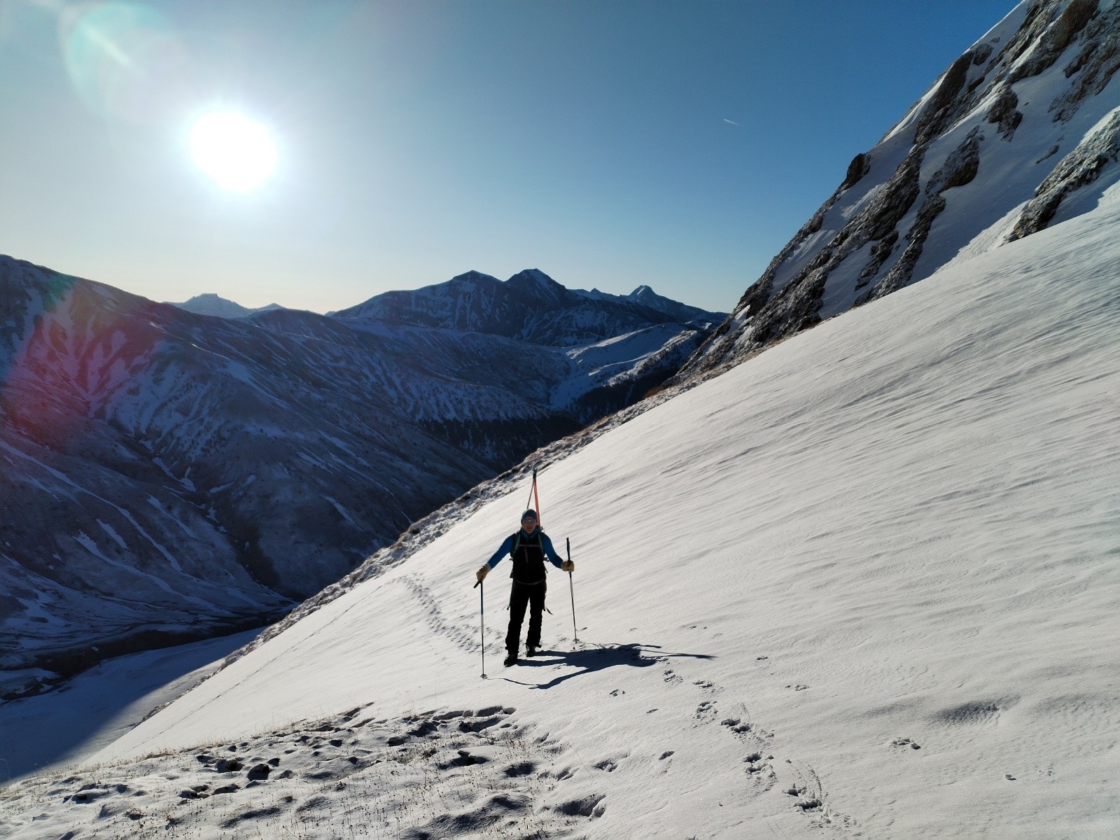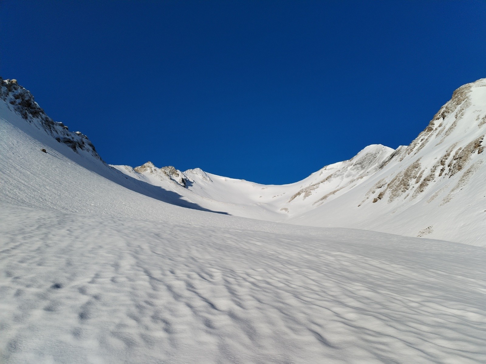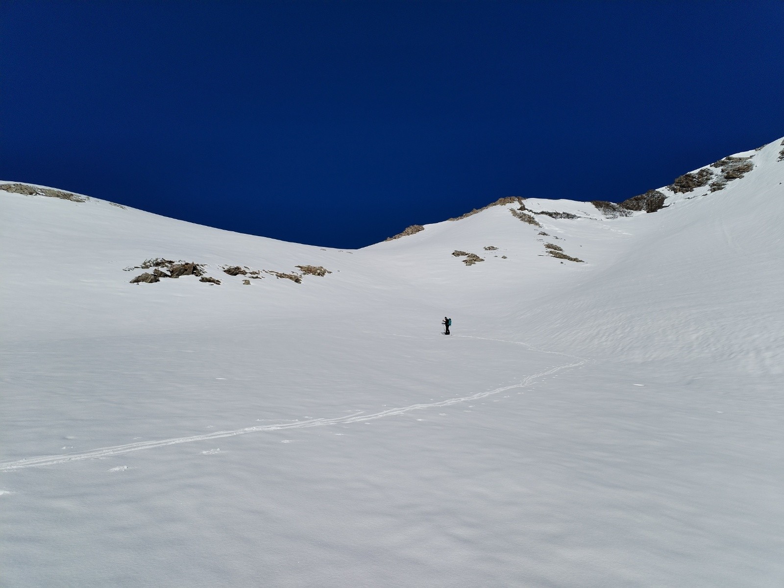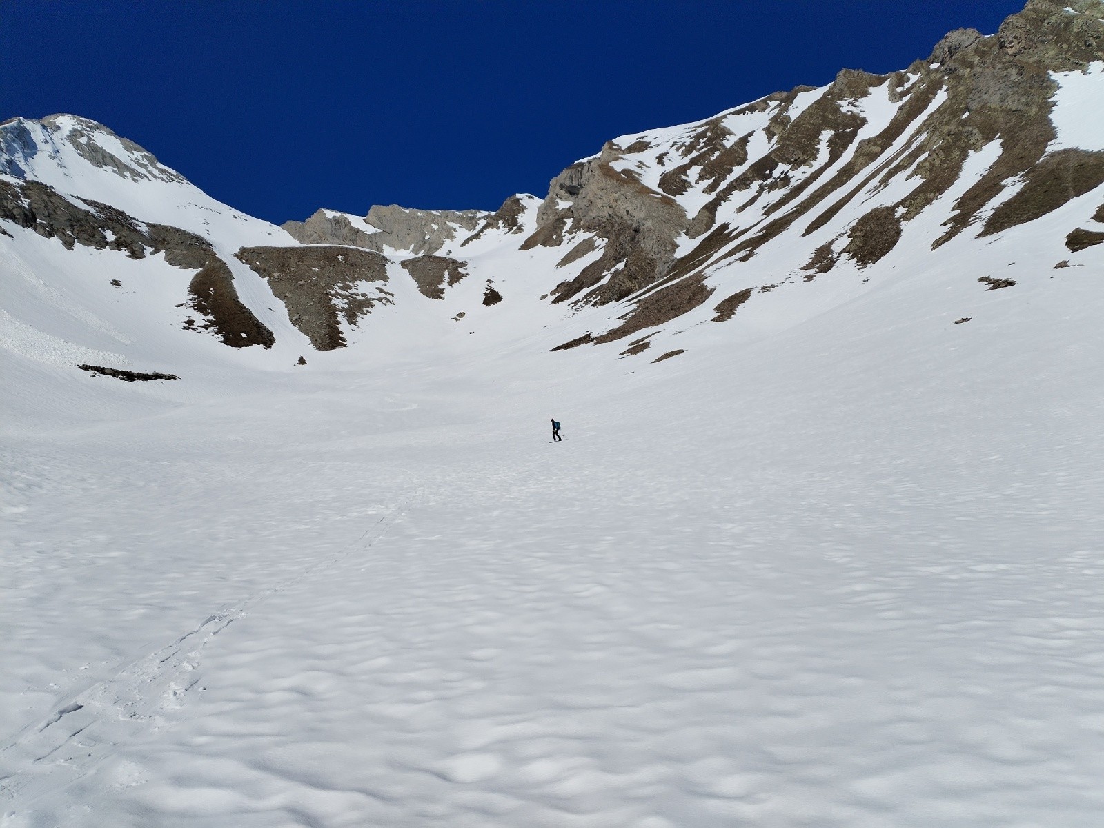 Conditions nivo et activité avalancheuse : RAS, il y a juste assez de neige, des plaques de terre présentes un peu partout en exposition sud à descente, le vallon Nord est bien rempli, la descente est raide, il faut attendre qu'elle décaille. 10h pour nous.