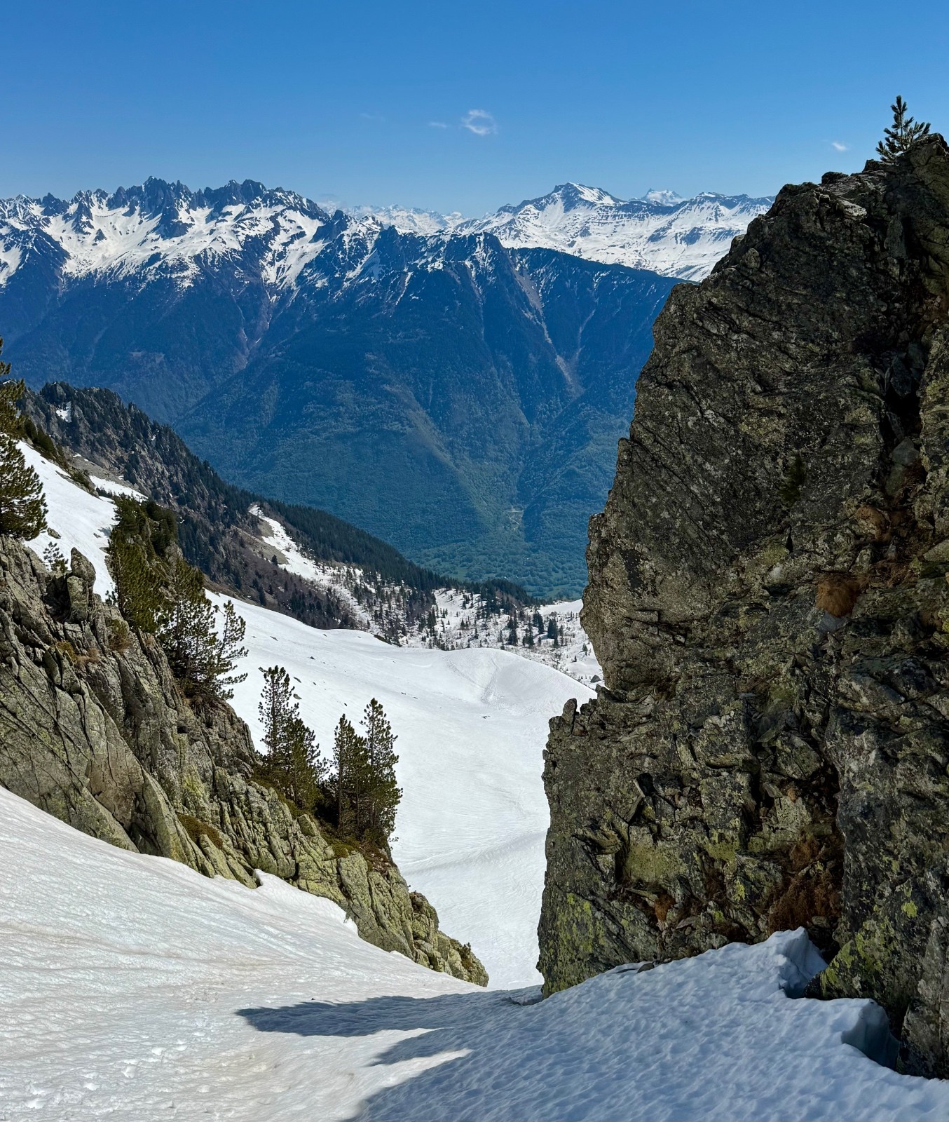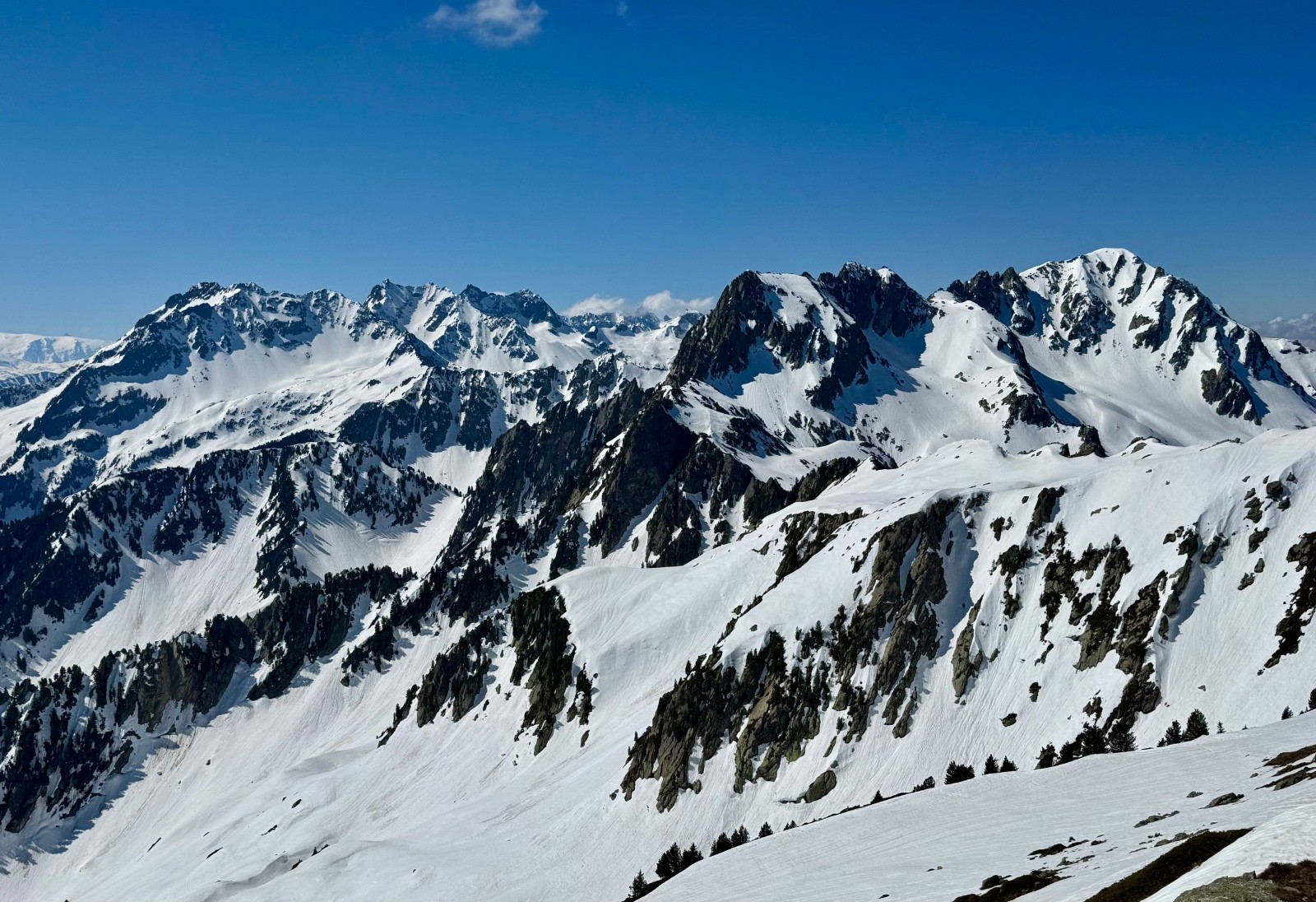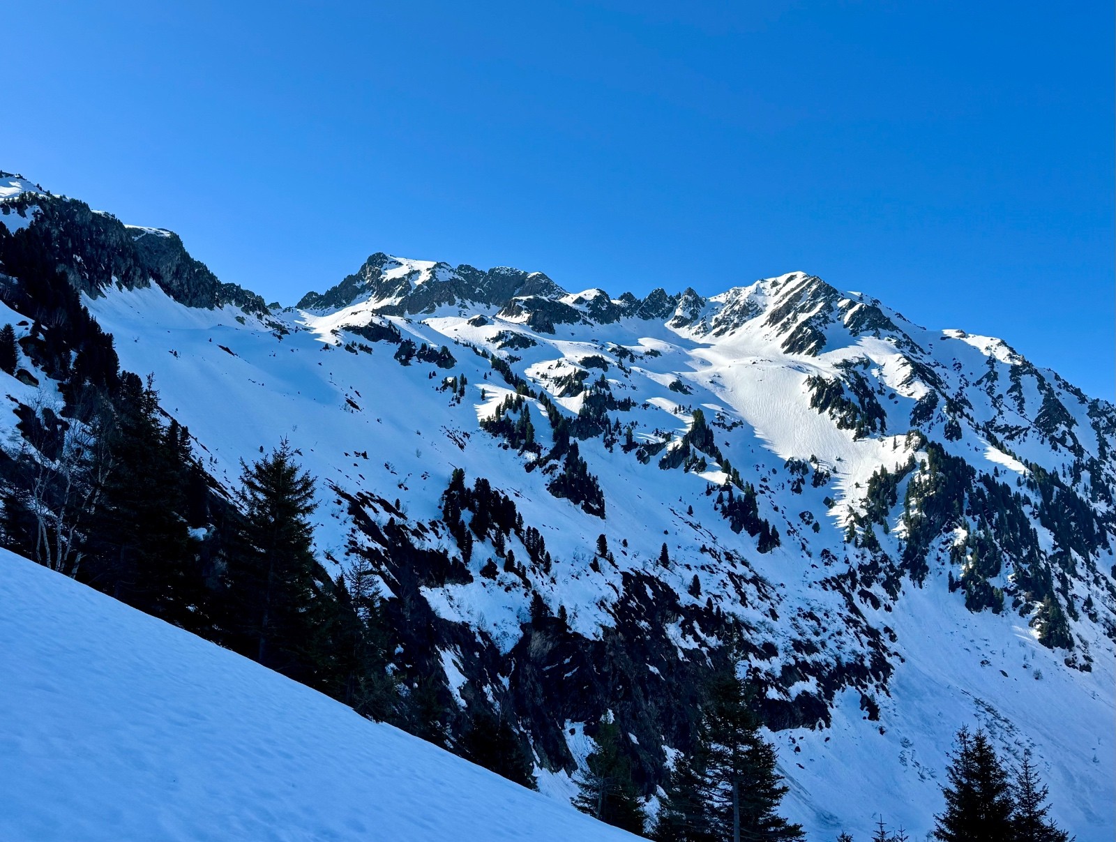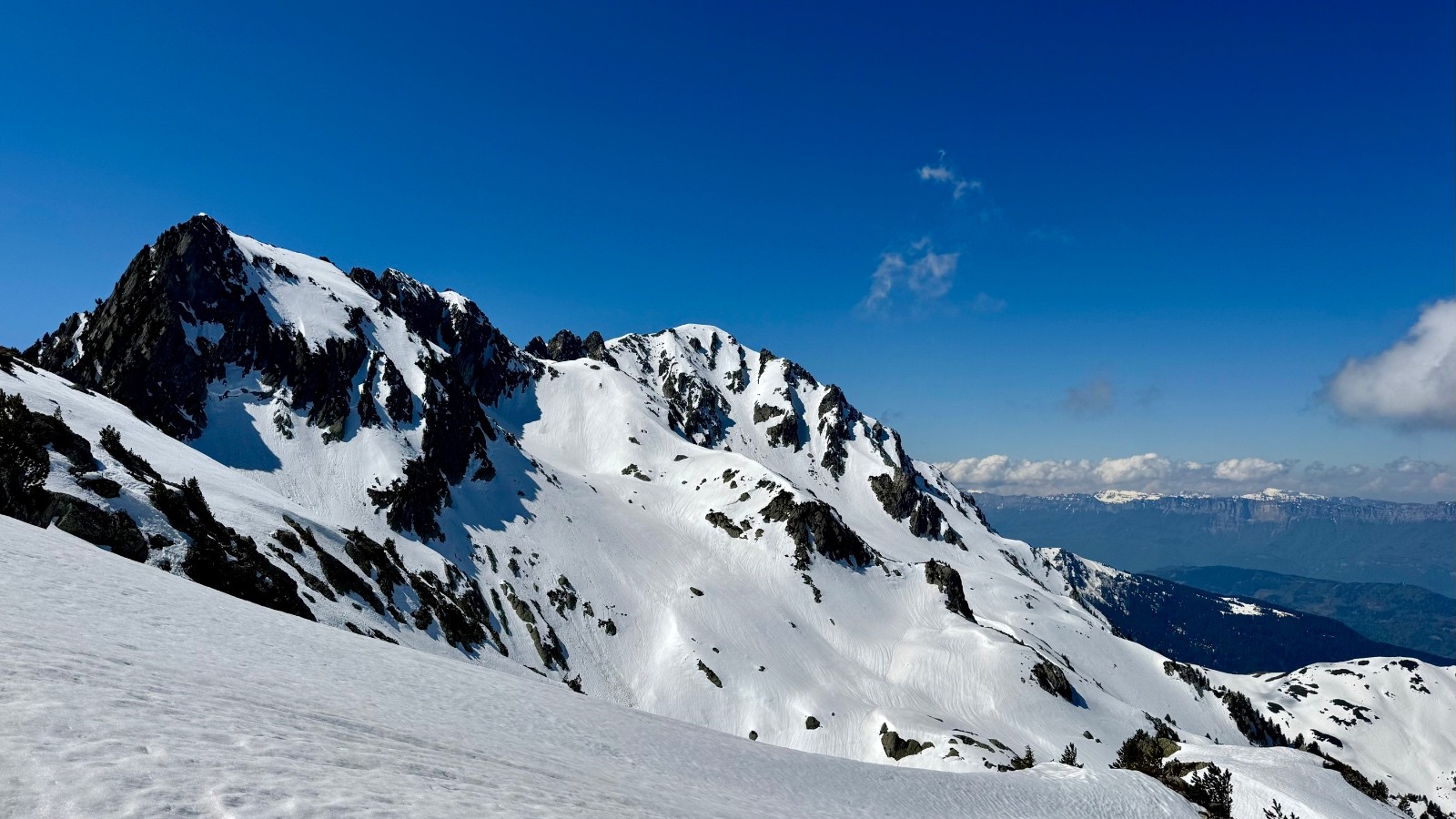 J'avais en tête de découvrir cette vallée du Joudron cette saison et il était grand temps d'y aller. Départ du PK d'été, remontée dans la forêt après avoir raté le sentier ... Montée un peu laborieuse avec passages enneigés bien durs et une forêt très "Belledonne". Je chausse après les sources du Gargoton et monte vers le col de la Perche. peu avant le col, skis à nouveau sur le sac, crampons aux pieds et je remonte le Grand Canal. La sortie sur l'arête NW de Rognier est un joli moment, la suite sur la crête est à nouveau déneigée jusqu'à quelques encablures du sommet : quelques passages ludiques dans les blocs. Du sommet descente vers le Plan du Lai sur une excellente transfo bien revenue vers 11h30, puis remontée au Pas de Gargoton (la fin à pieds car les skis chassent) dans le cagnard. Par contraste, la montée finale à la Grande Roche Blanche n'a pas encore chauffé et je sors les couteaux (bonjour les manips sur cette journée 😅). Descente de la rampe N sur une transfo juste revenue, bien agréable malgré l'état bosselé. Sur le bas je bricole dans les vernes pour rejoindre la combe de l'Arbet Neuf, un peu de pousse-bâtons, puis la forêt où je déchausse vers 1570. Retour tranquille au PK.