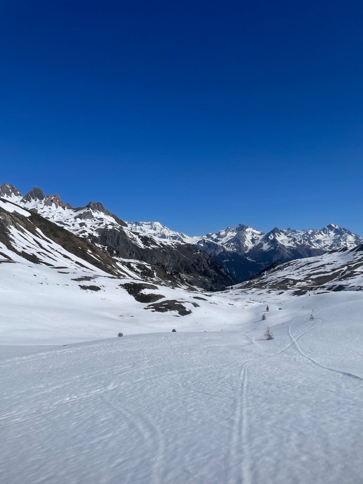 Le couloir N du col de la Gran Bagna est en neige dure pas très lisse, et peinait à décailler à 14h, la contrepente gauche plein Nord et plus raide gardait jalousement 3 virages en poudre. Le haut du col est assez sec et il faut naviguer entre les cailloux qui sortent et deviner les autres.