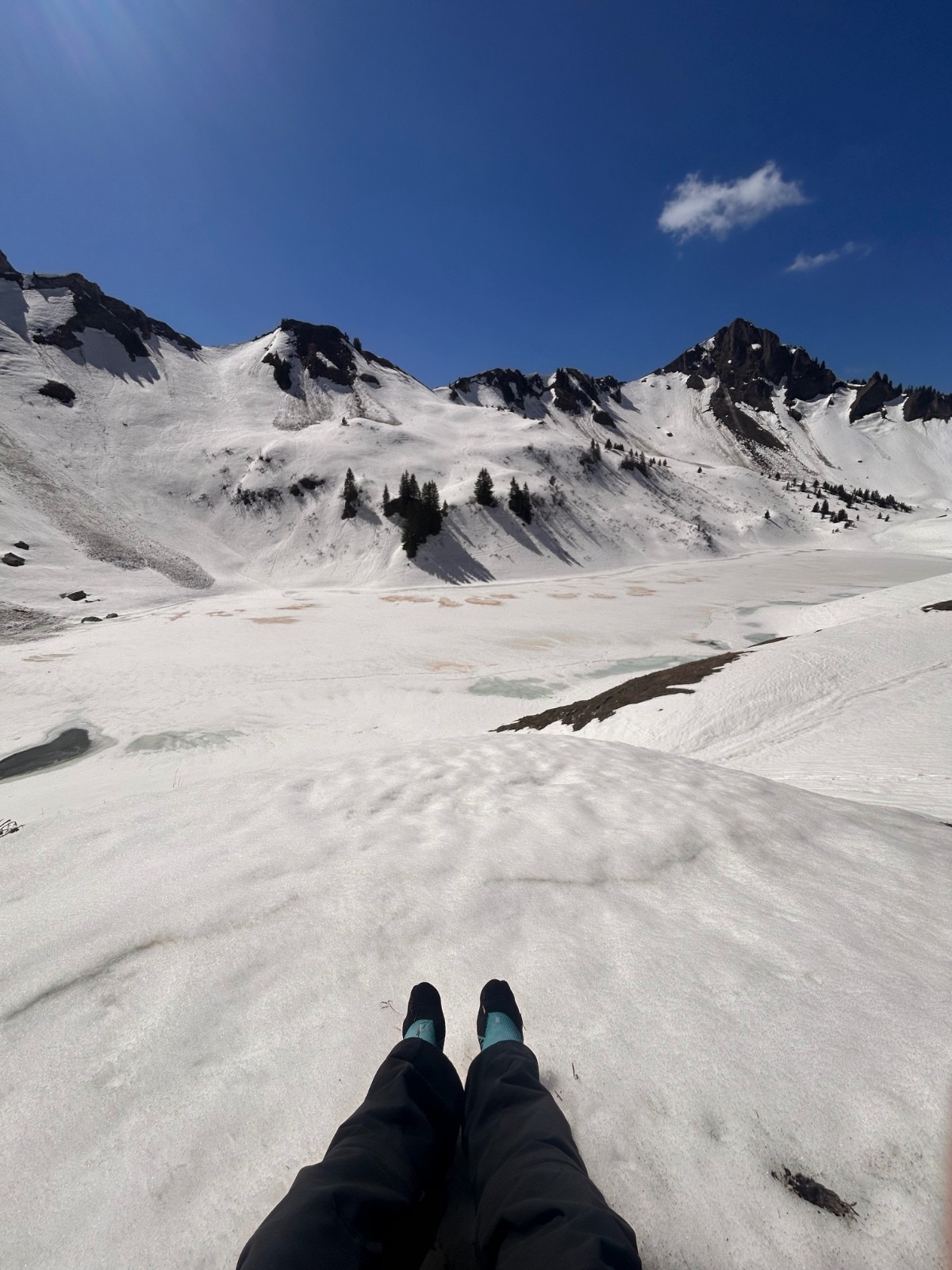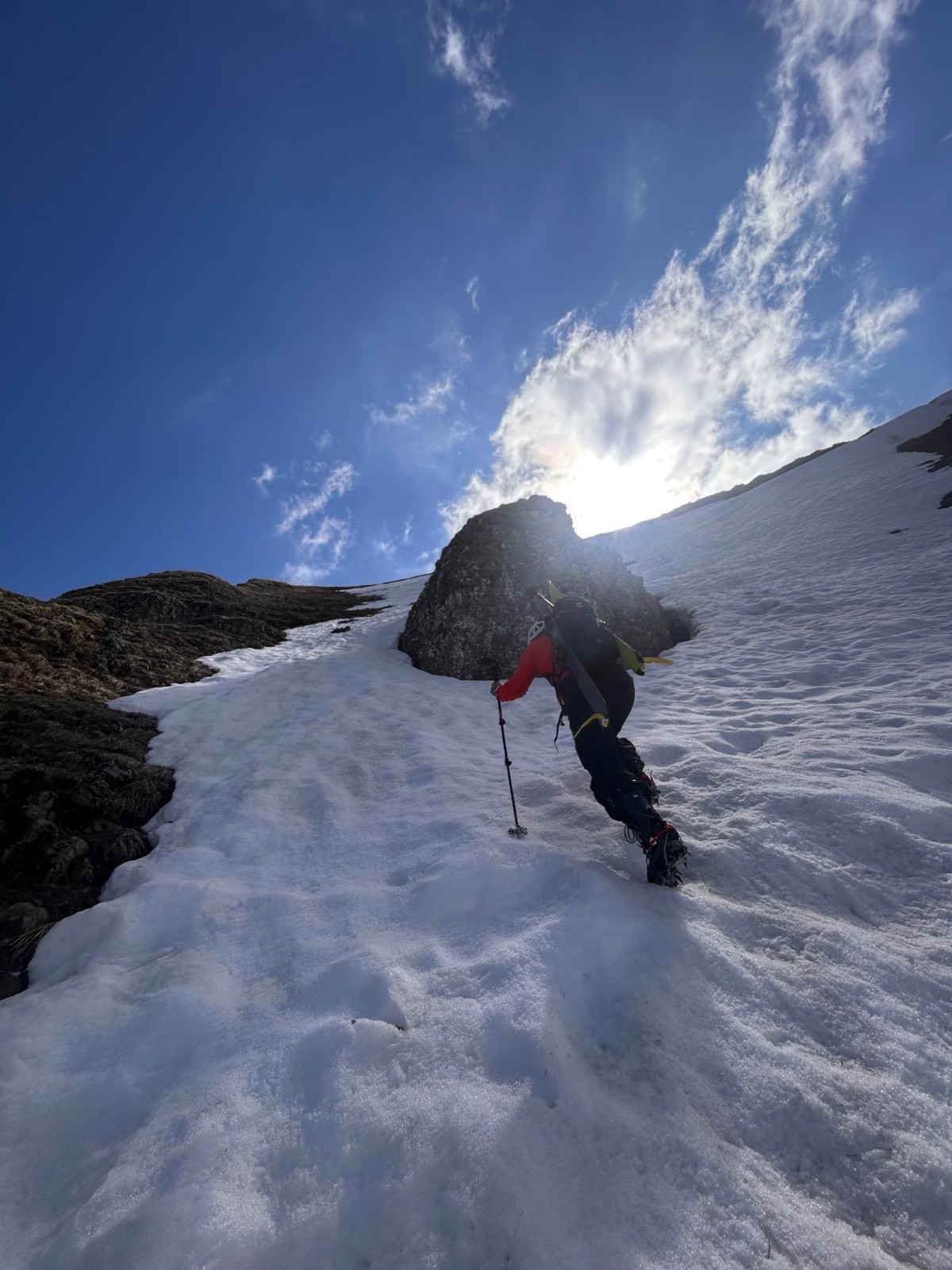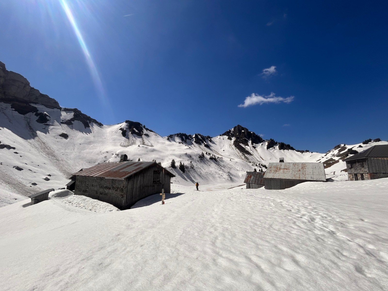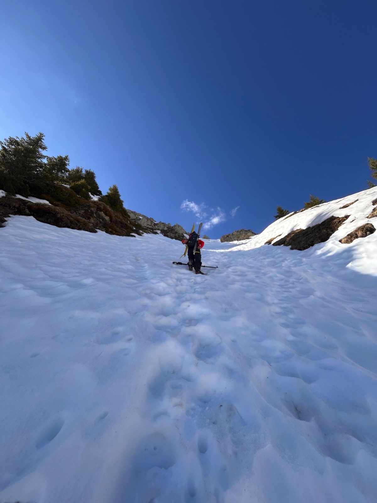 On attaque au dessus du petit Bornand, 10mn de portage (45mn pour toi qui lis le compte rendu), 20 mètres de ski, et hop les crampons sont déjà là. On remonte la pente en neige béton, passage du mauvais pas (pas de la chèvre) on prend pieds sur le plateau, running vers un couloir au col de sossay. On bascule et WOW on voit enfin la face après 12mn d’approche. Elle est si belle, elle est si longue, elle penche comme il faut, mais elle est… herbeuse. Mmmmmh… bon… faut voir comment ça passe ! Restons optimistes. En bon curieux on descend du col pour rejoindre le pied de la face… je choisi un des goulets d’étranglement, un avec de la neige (peu de choix). C’est raide, neige dure, crampons et lets go… en quelques secondes (minutes pour toi qui lis ça) je me retrouve une 100aine de mètres au dessus du départ… mais je ne peux continuer. Et pourtant je suis à l’aise techniquement… alors que se passe t’il ? Et ben… les conditions nivologiques complexes me font réfléchir. En effet, il manque environ 300m de d+ de neige pour atteindre l’autre patch de neige de la face tout en haut…. 💀 🤓😂😂 le but est signé. Allé c’est bon, je ski pas encore sur l’herbe et les caillasses. Je laisse ça à candide thovex et aux futures générations 😘. Adri non plus il ski pas sur l herbe, il est pas con le type. La neige étant béton, on désescalade les pentes et on file manger au lac de lessy… repeautage et retour vers le col de sossay tout déneigé. Adri le skiera, moi je garde les crampons, ils