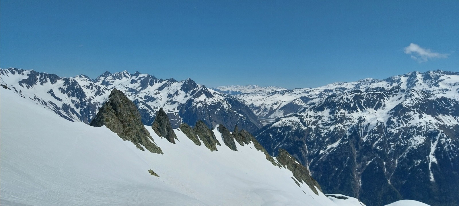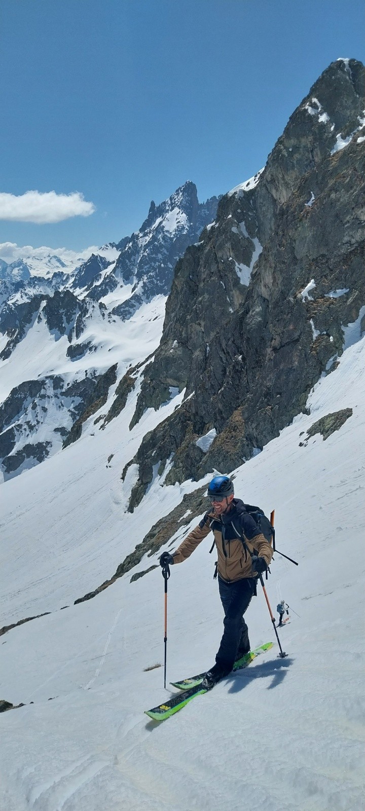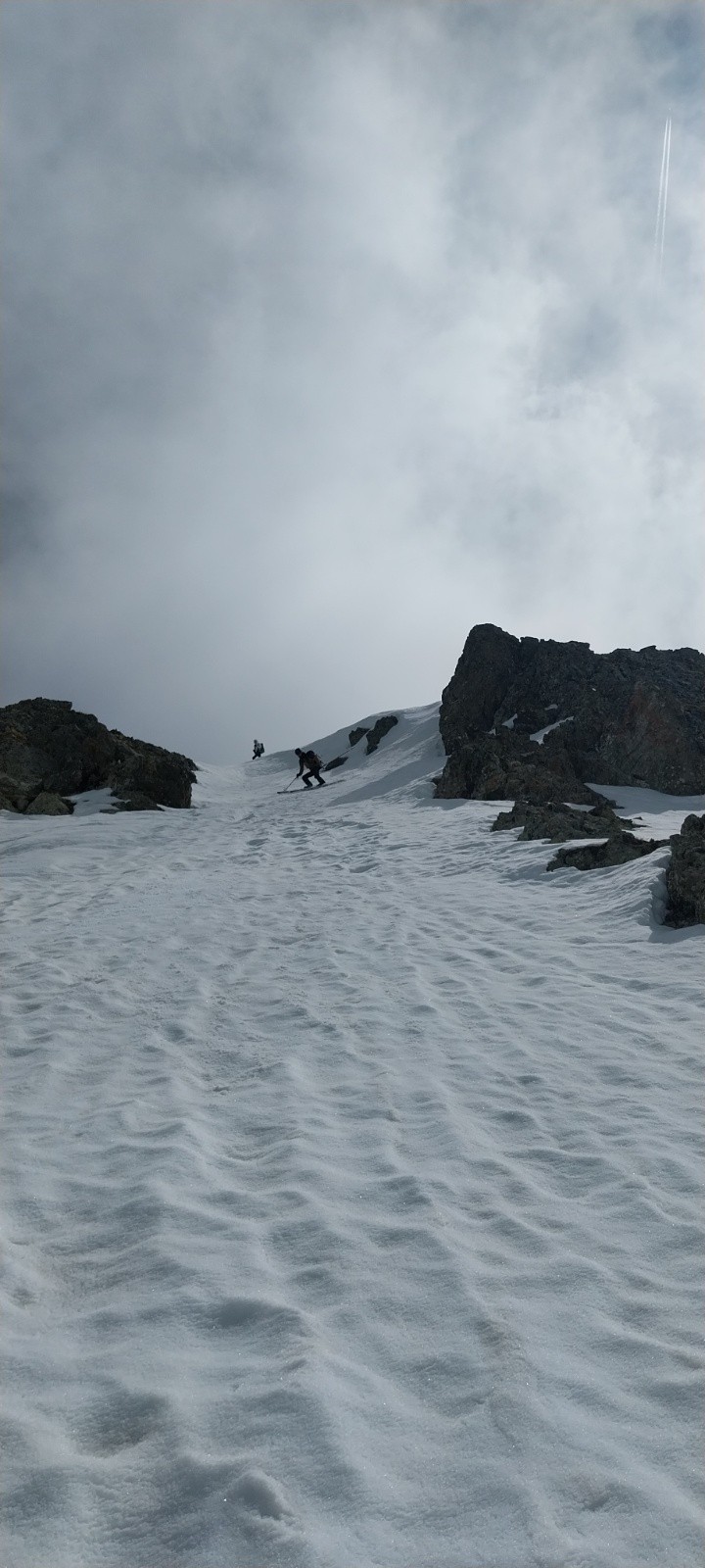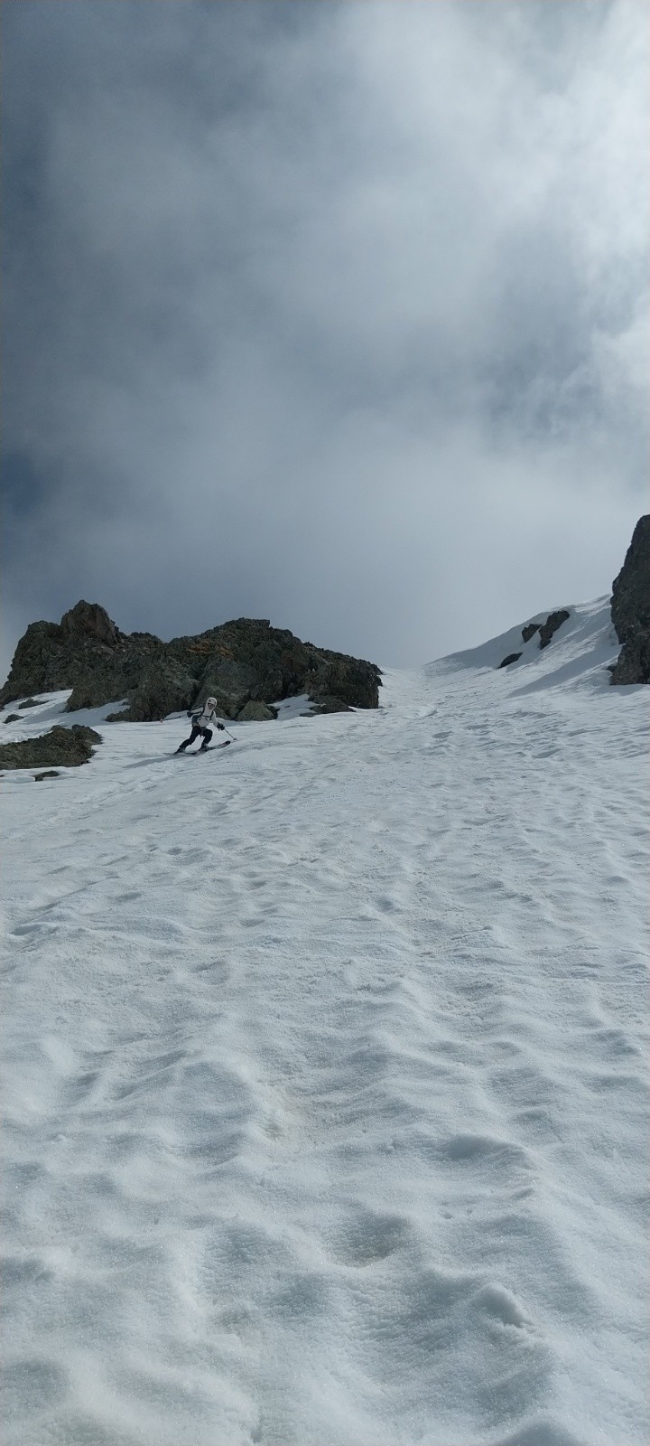 Avant de remonter, comme en mars lors de mon grand tour de Crop, j'ai regardé d'un œil désolé le bas du vallon complètement ravagé par les coulées. Même si Beauregard et le ruisseau de la Jasse ne sont plus ou presque plus praticables, le vallon classique de Roche Noire a fière allure. Il reste encore de quoi tenir longtemps. C'est la première fois que j'y viens en conditions printanières. Les 3 dernières années, j'aimais bien y passer, mais ça a toujours été en grosse poudreuse... La remontée est un peu longue, mais qu'est-ce que c'est beau. Ne voyant plus les traces des derniers skieurs passés, je me sentais vraiment seul avec la sensation d'être le premier à passer. Après avoir enchaîné des tonnes de conversions, je suis finalement arrivé à la Brèche Portelle où je pensais apercevoir Lucie et Ludo dans la montée pour finir ensemble. Finalement, après appel téléphonique, je choisis d'essayer de descendre dans le vallon du ruisseau de la Jasse en les attendant. Et bah quel bon choix (étonnamment), une des meilleures moquettes de la saison. Bizarre qu'elle soit encore si bonne, mais je prends volontiers ! Tellement volontiers que je suis descendu jusqu'à 1900 m.