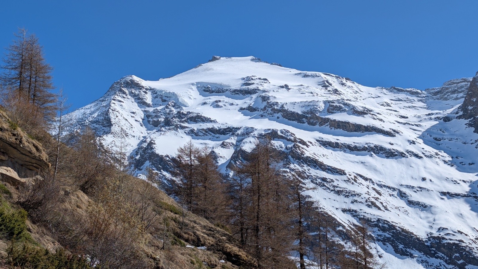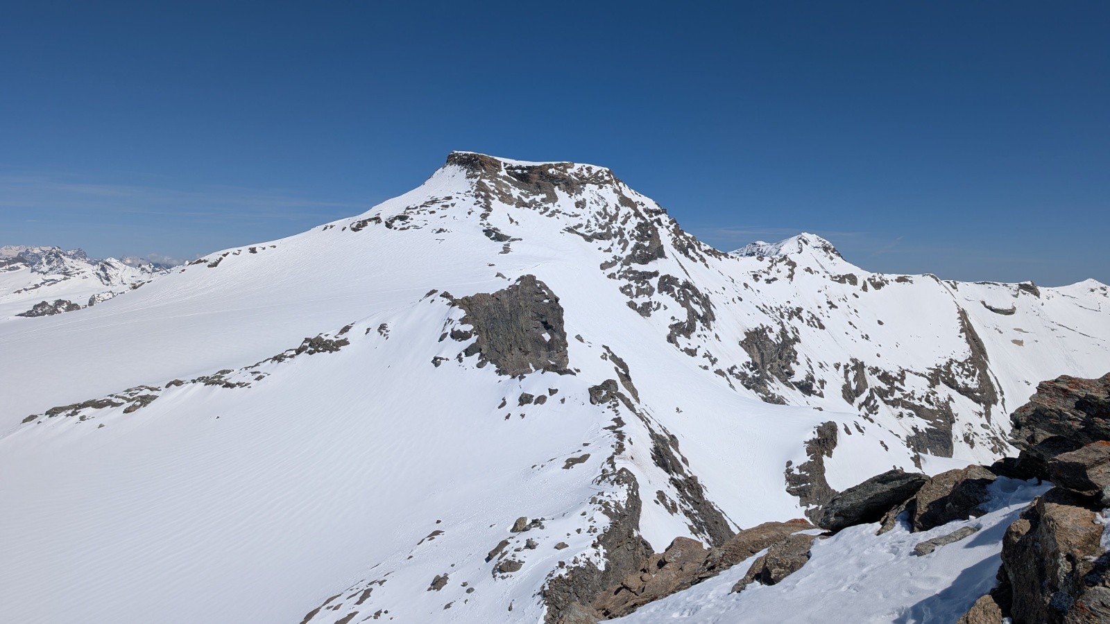 Étant déjà allé plusieurs fois à l’Albaron, je ne voulais pas m’embarrasser d’un piolet et des crampons et décide de me rabattre dans un premier temps sur le Dôme du Grand Fond ne sachant pas à quoi m’attendre. Montée en terrain connu mais surprise au vu du manque de neige, portage nécessaire jusque vers 2100 m en visant les premières langues de neige. Ensuite la montée se fait bien dans une neige compacte. En montant par le glacier, je regarde du côté de l’Ouillarse et croit avoir une vision : mais c’est un petit Charbonnel. En effet il ressemble à la partie sommitale du géant de Maurienne. Amoureux de ce dernier, je me rabats donc sur cet objectif qui paraissait proche mais le coup de barre arrivant, la fin fut interminable. Les derniers mètres nécessitent de laisser les skis et finir à pied dans une poudreuse plutôt profonde. Quelques rochers et voilà le sommet qui propose un panorama superbe. Je me retourne en regardant l’Albaron qui est quand même bien raidasse. Bon courage pour les quelques courageux qui s’approchaient du mur sommital.