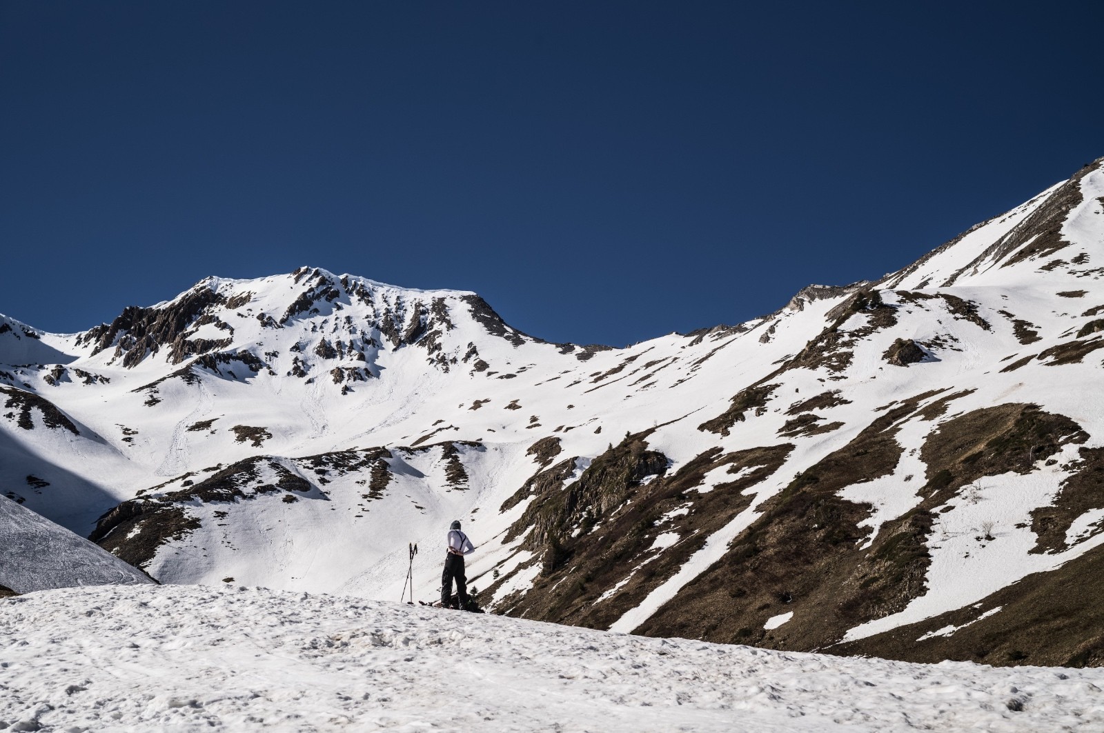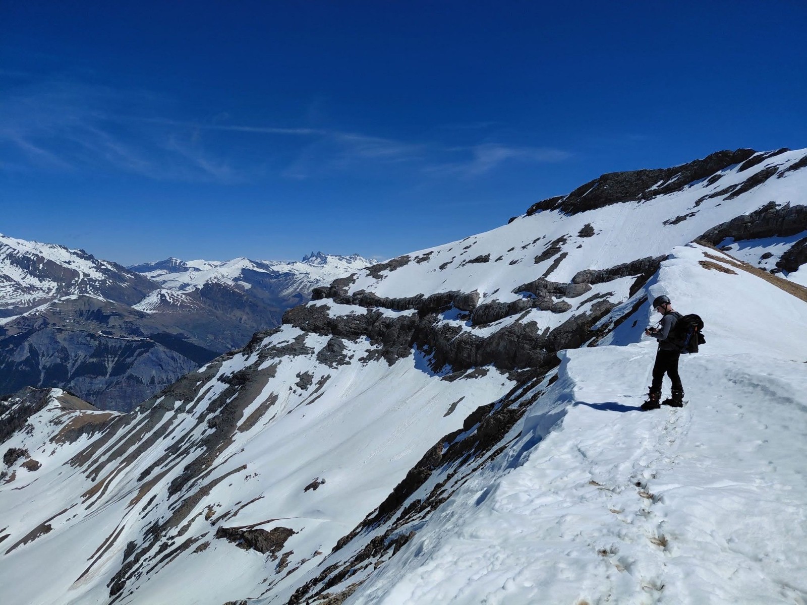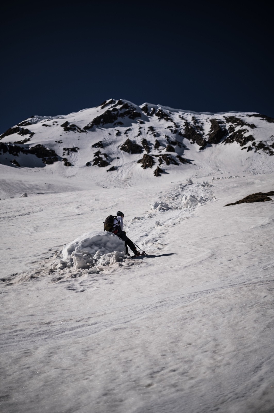 Après, itinéraire classique, nous contournons le sommet par l'ouest pour monter via l'arête sud. Le contournement est un peu rock & roll; et encore une fois Jéjé la joue ski, alors que j'opte pour les crampons dans les traversées de pente engagées. Nous suivons l'arête sud jusqu'au somment. C'est interminable, totalement déshabillé de neige sur 150m de D+.
