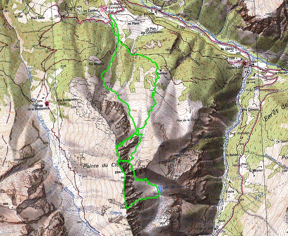 Itinéraire suivi : St Pierre d'Extravache-> couloir au Nord de la Pointe du Clot en AR -> arete jusqu'au point 2965->couloir NE -> remonter sud au dessus du couloir du Lac du Liael -> Couloir NE au nord de la la pointe du clot -> vallon à l'Est de Pré Maudru -> parking