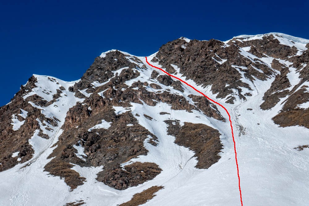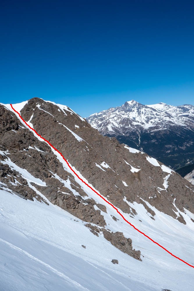 Sur les traces d'Etienne-H qui a parcouru cette arête il y a quelques jours. Magnifique itinéraire varié : des couloirs, 1 arête sans neige , une remontée chaude entre pierres et touffes d'herbes en Sud au dessus du lac Liael, un magnifique belvédère sur toutes les montagnes du coin....