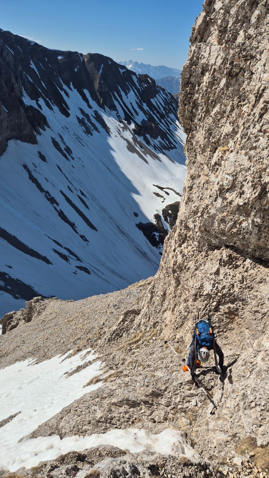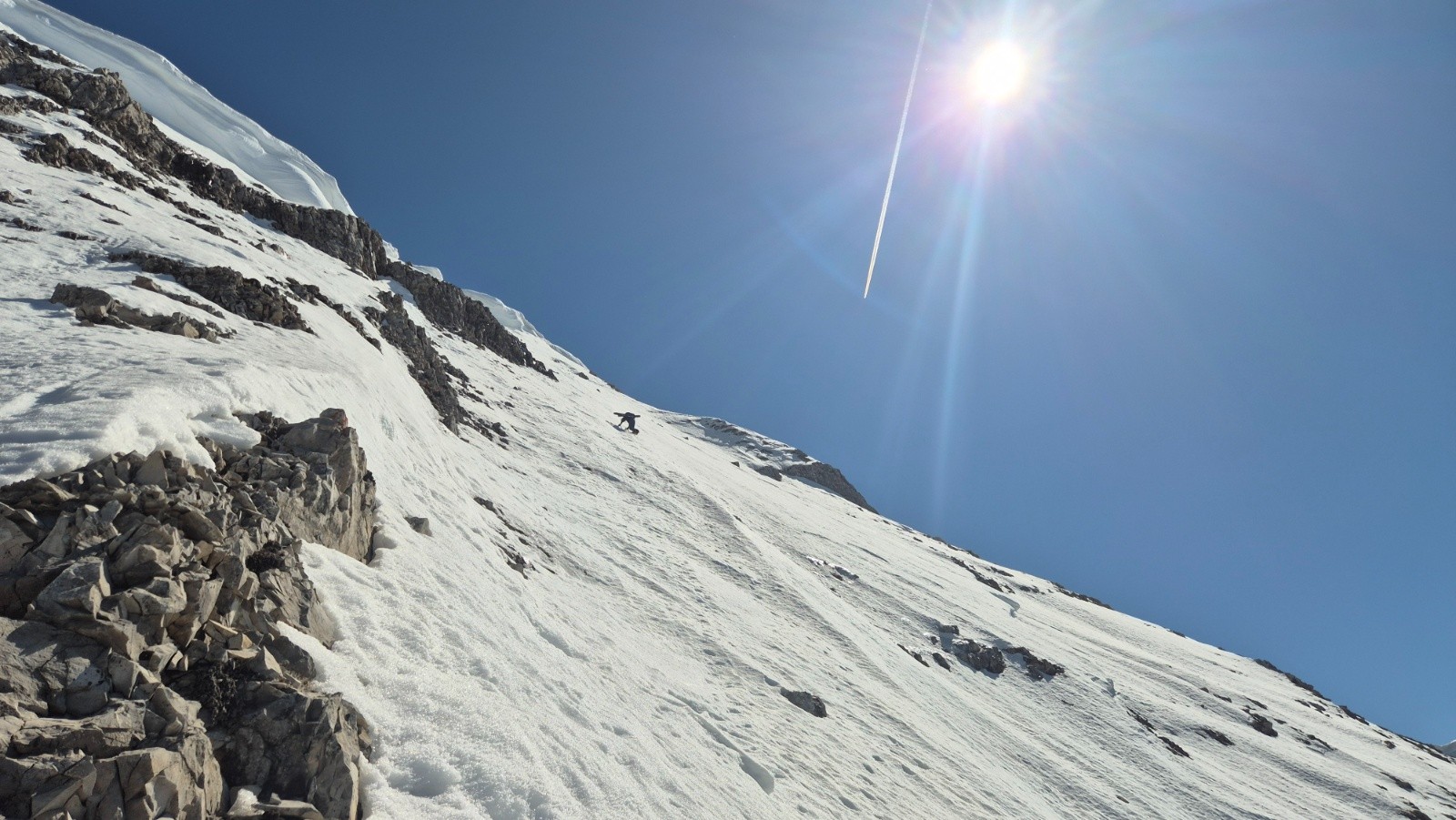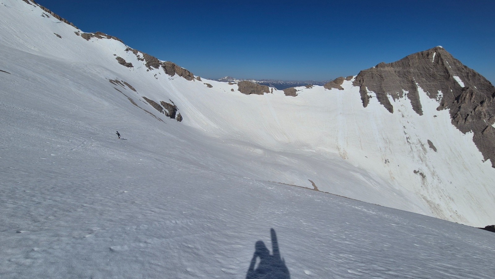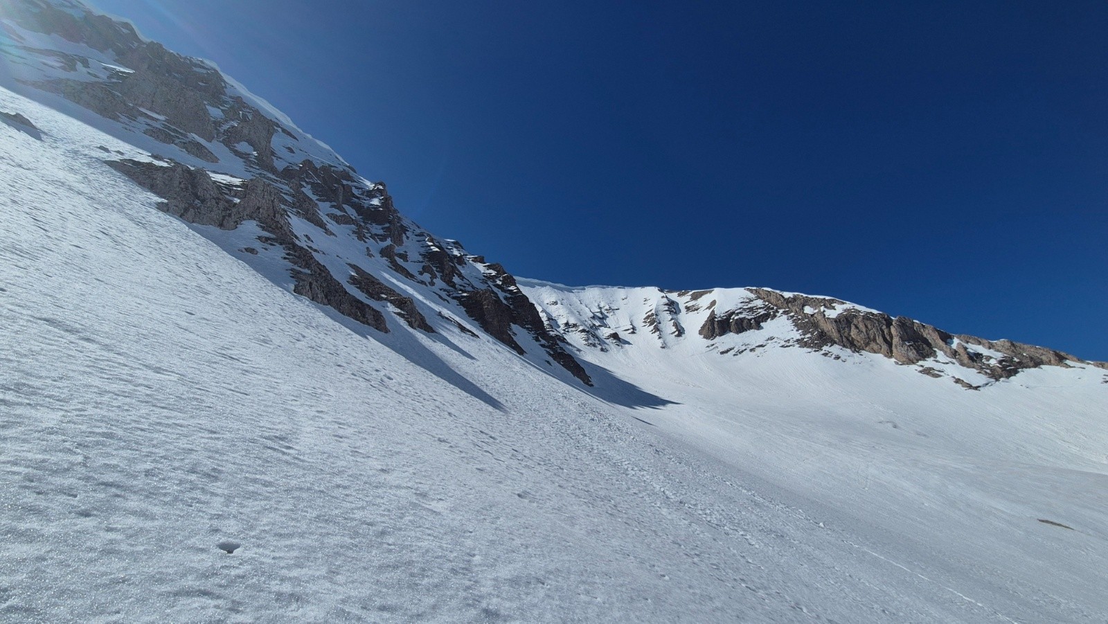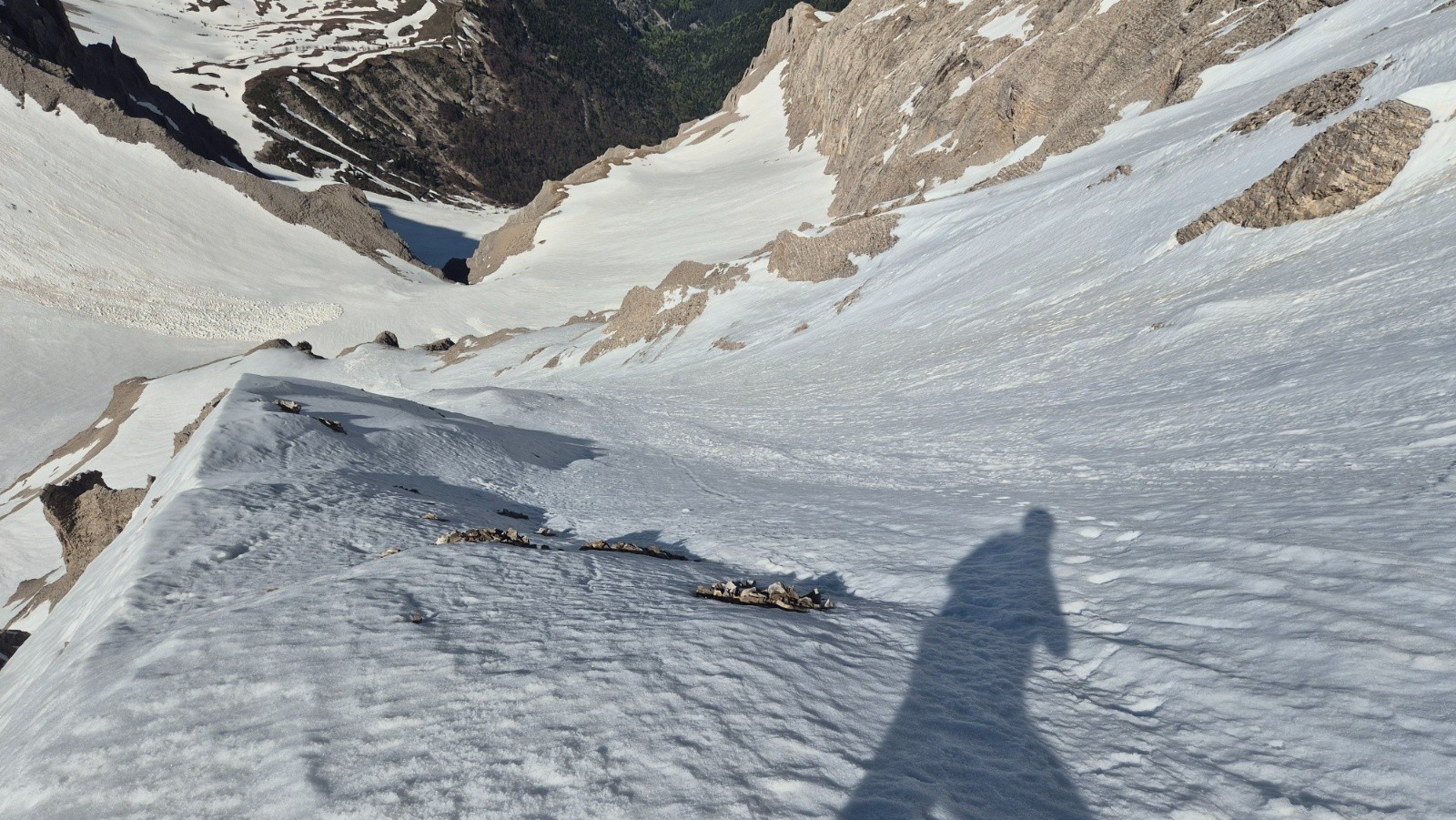 Concernant le malpasset, c est une autres histoire, nos prédécesseurs ont été plus patients que nous et l auront en bien meilleurs conditions. Il aurait fallu attendre encore 1 ou 2 heures, et meme pas gagné ? Du coup, on optent pour une descente prudente en crampons sur les 50 premiers metres avant de chausser sur une petite plate forme et profiter d une neige correcte dans la suite du couloir puis d une bonne moquette dans la combe. 🤩