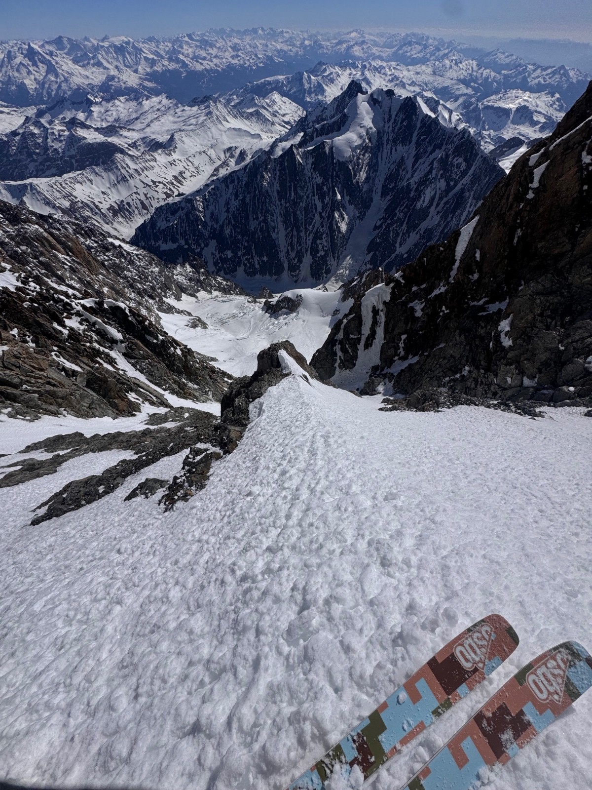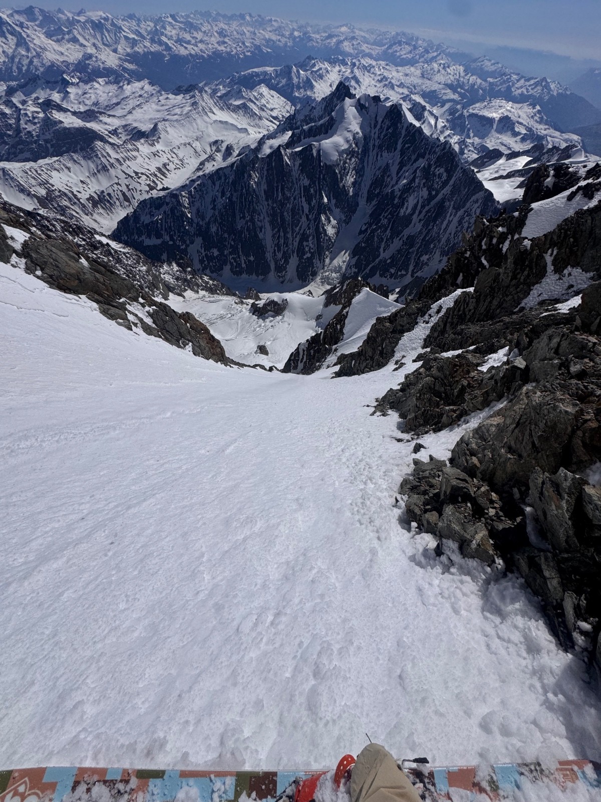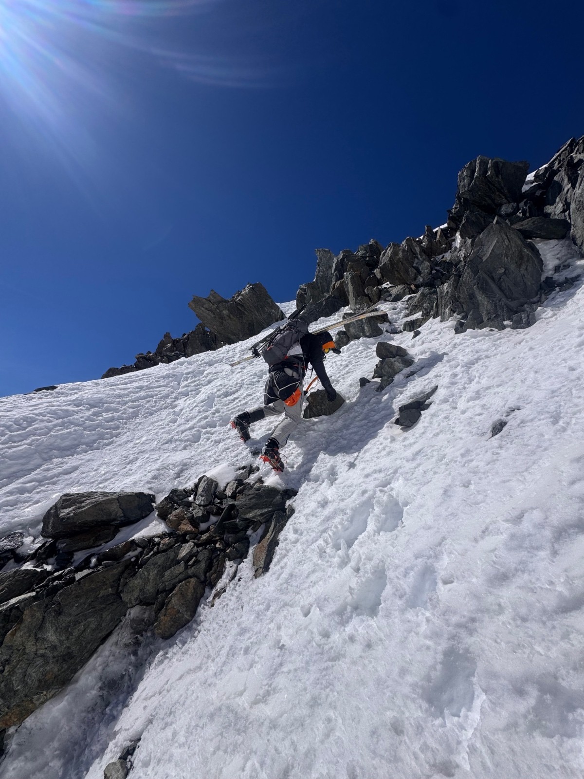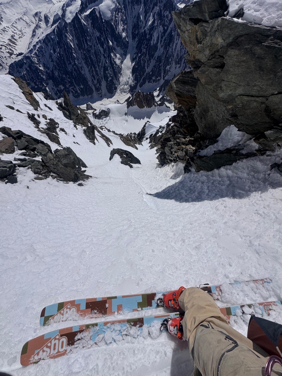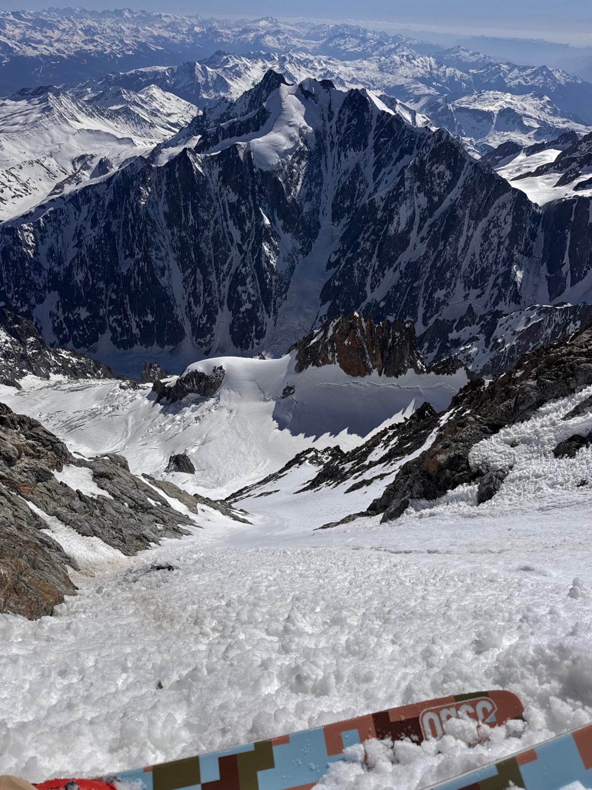 Arrivés en haut, Elias vomit, je cherche de l aspirine et le seul mec du coin m’en donne. Je l’aide un peu et me dit que ça va mieux. On rentre dans le Saudan avec une courte désescalade, c’est plutôt bien rempli le couloir, au moment de chausser il vomit de nouveau. J’hésite à remonter avec lui pour qu’il vole et descende vite mais on choisit la descente tout de même. Ça déroule plutôt bien même si il faut s’arrêter régulièrement d’où son état et l’altitude. Arrivés sur le bas c’est surprise, les pentes de sorties sont explosées. Le sérac a-t-il explosé de travers, chutes de pierres ? C’est visiblement criblé d’impacts et sec. On décolle donc dans la pente. Premier combo pour Elias, trop content de faire ça à 2 dans un endroit si sauvage. Posé Val Veny avec une grosse brise descendante, surprise aussi et nous voilà à marcher jusqu’au tunnel, quelques 5km, chiant mais pas si pire. Retour en stop à Cham et la boucle est bouclée.