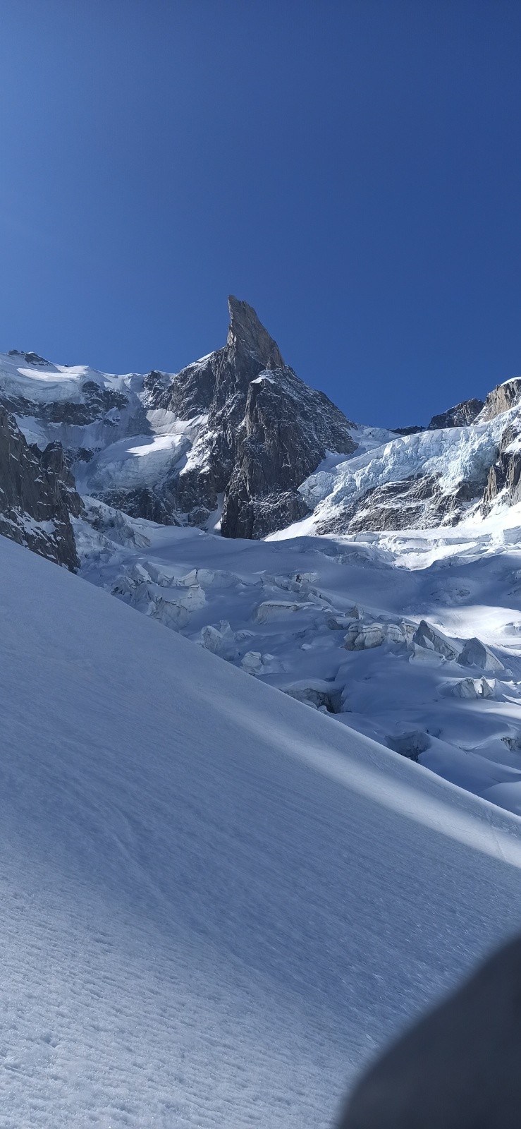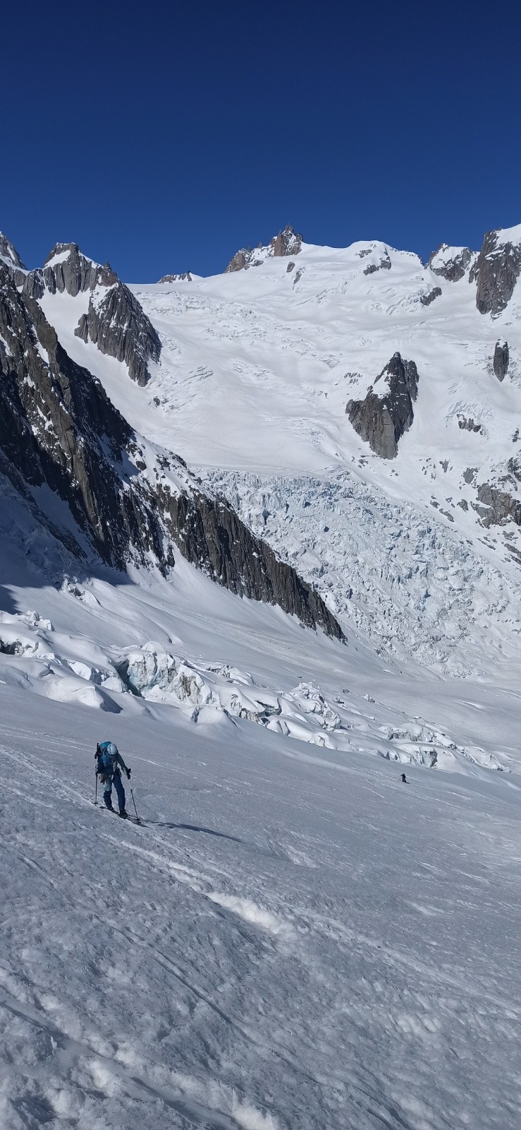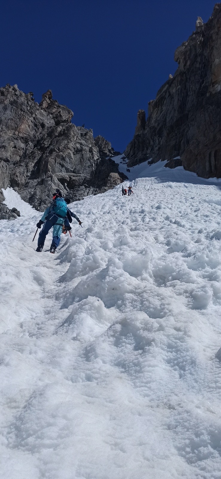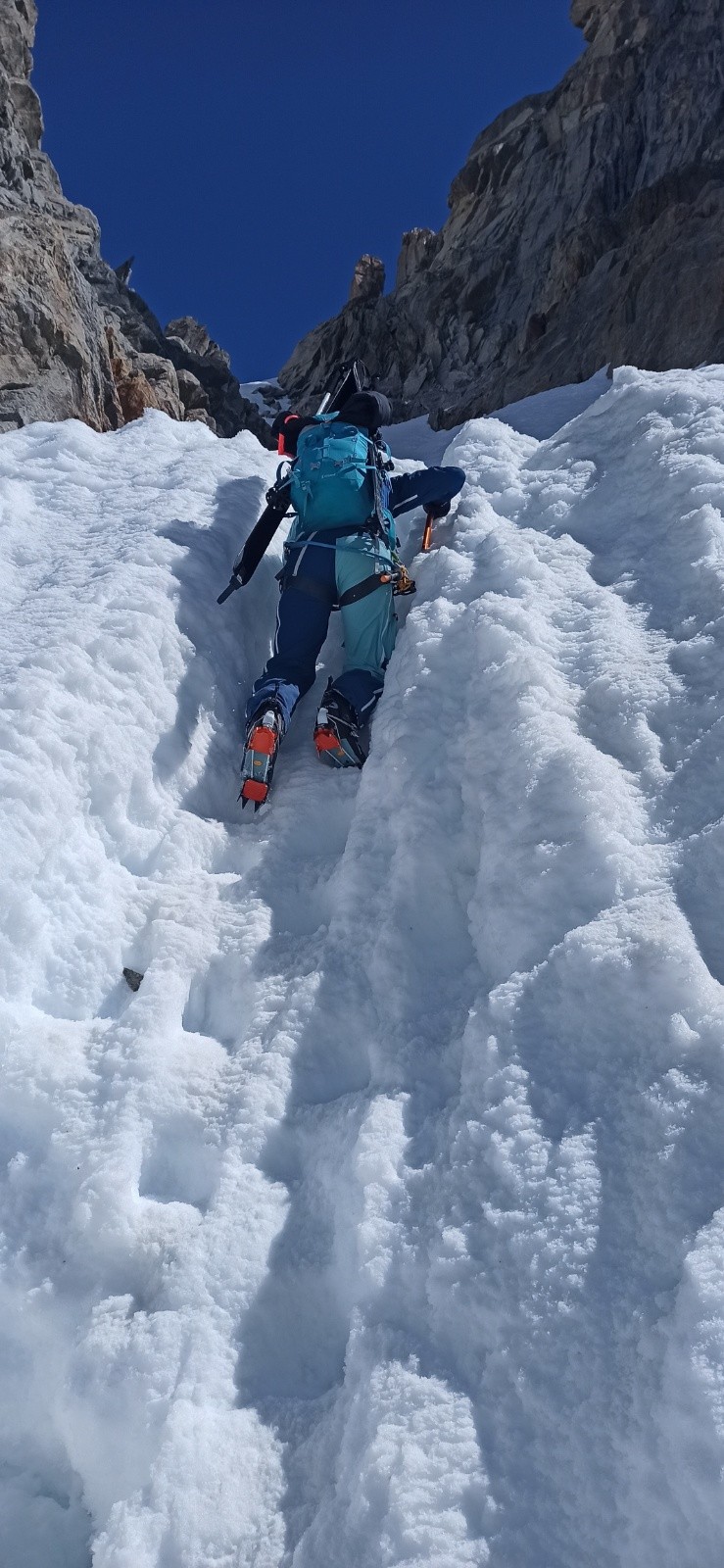 Tout s'était plutôt bien déroulé, malgré une neige infâme à skier pour l'approche depuis la Vallée noire. Nous avons chaussé, encore sur une neige dure , couteau obligatoire, glacier bien bouché.