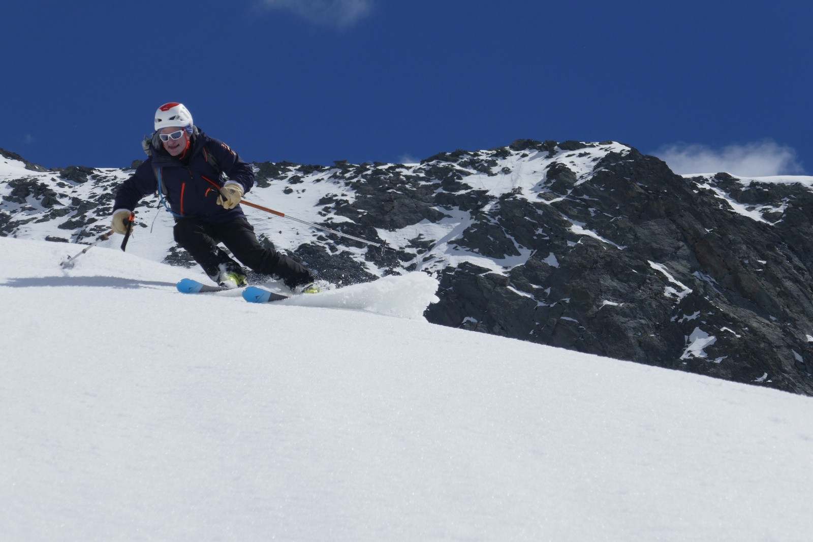 Nous montons assez vite sous le Boomerang, à 11h30, on se dit qu'il va être trop tôt pour le couloir, on cherche quelque chose à faire avant, ce sera la belle pente SW sous Becca Motta. A 2920m, il est 11h45, timing parfait pour une première descente à poil court. Nous remontons ensuite depuis la côté de 2600m. Le couloir est engagé vers 13h30 en neige encore bien ferme. Le Steph' doute un peu, j'ai confiance, le soleil va commencer à bien rentrer dedans. Montée efficace sur une belle neige lisse dure puis... poudreuse sur les 150 derniers mètres !! La crête menant à l'Antécime vers 3340m est en neige, je m'amuse à monter dessus pour chausser à l'antécime. Vue magnifique sur la Vanoise bien sèche actuellement. Début de descente ludique sur l'arête assez effilée puis belle descente poudre en haut. Ressaut en neige dure mais avec un grip excellent puis une belle moquette sur la partie basse.