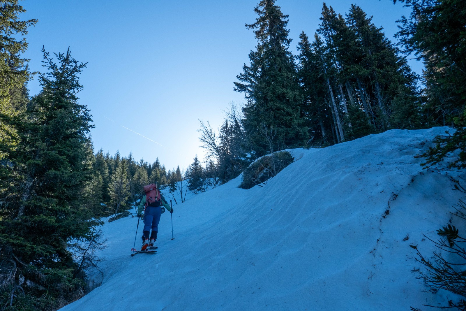 La suite s'enchaine bien dans une moquette parfaite jusque vers 2300m puis la qualité de la neige se détériore quelque peu tout en restant fort acceptable pour l'horaire (16h !!); Un peu de bricolage entre 1950 et 1750m en forêt avec quelques passages déneigés puis retour à la voiture skis aux pieds. C'est pas beau ça.