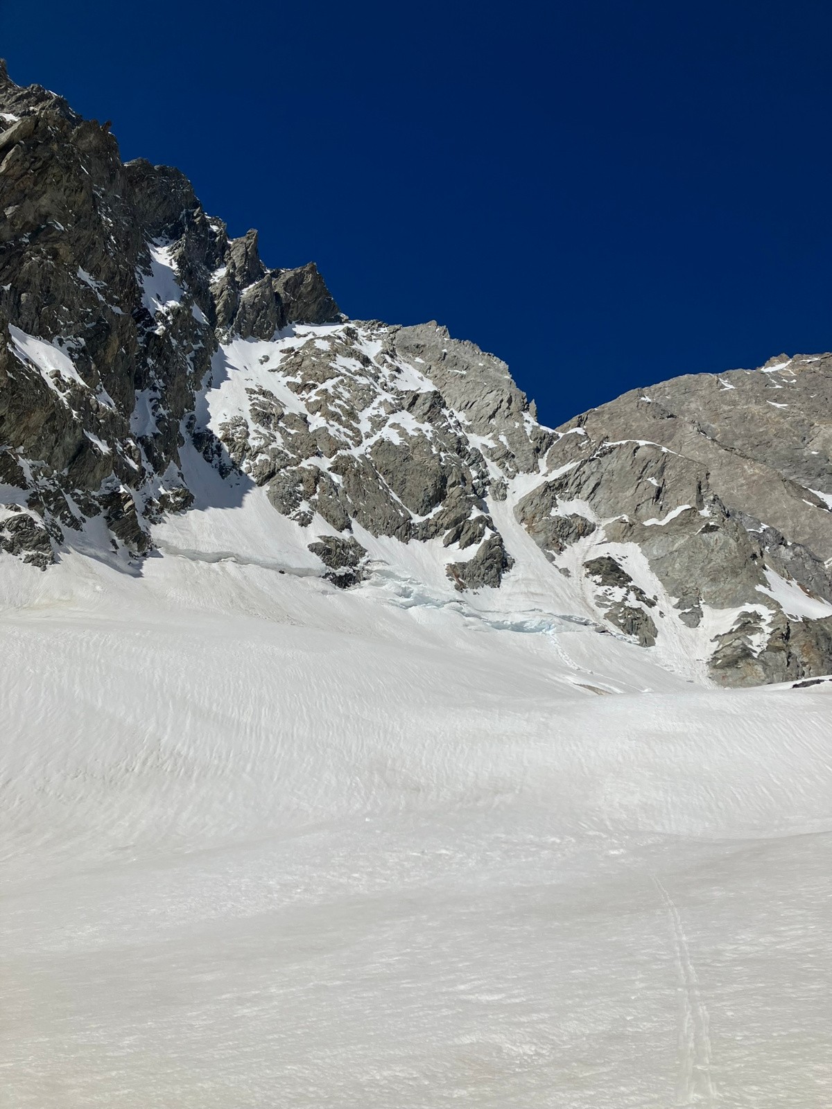 Descente à 15h15 conditions parfaites, ski dingue. Très sec en bas il faut traverser assez haut. Le bas est criblé d'impacts, ça fait peur.