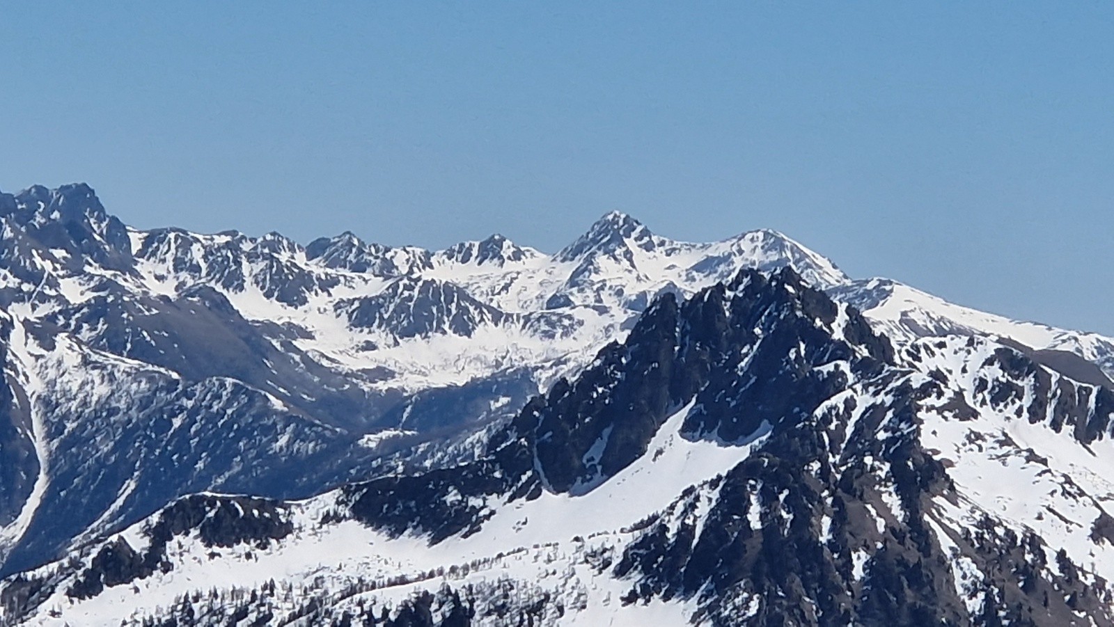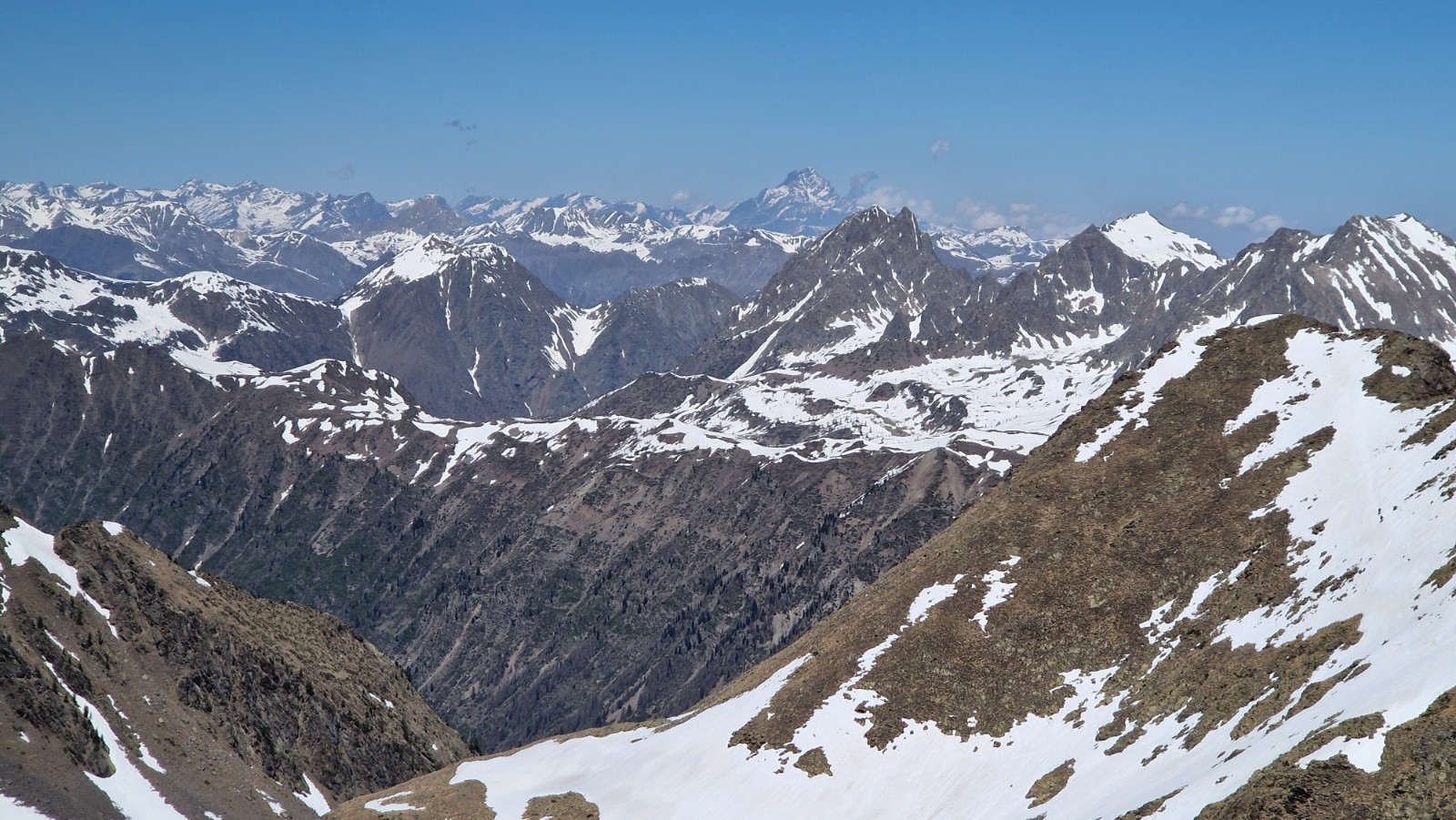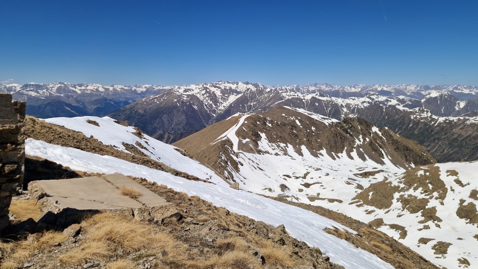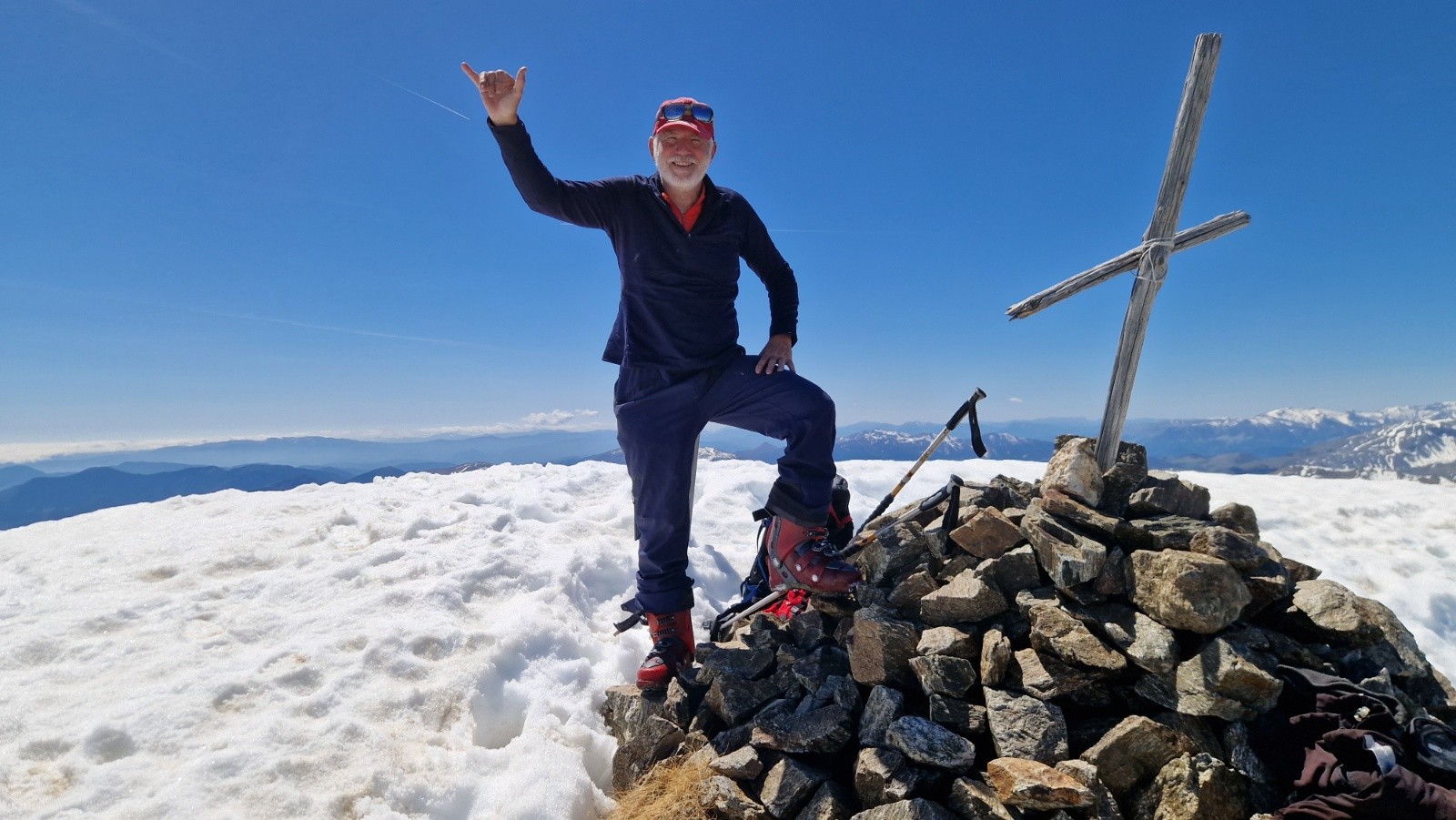 Tandis qu'on s'approche du Saint Sauveur, on se dit en suivant l'ascension plus qu'hesitante d'un skieur en solo que la pente finale doit etre encore bien dure. On decide de mettre les crampons et le sommet est atteint vers les 13h. Seuls au sommet, on en profite pour manger et contempler le paysage, toujours sublime là-haut par la vue a 360*, parfaitement dégagé sur la totalité des montagnes, aussi loin que porte le regard. On devine cependant une couche nuageuse bien dense vers la mer.