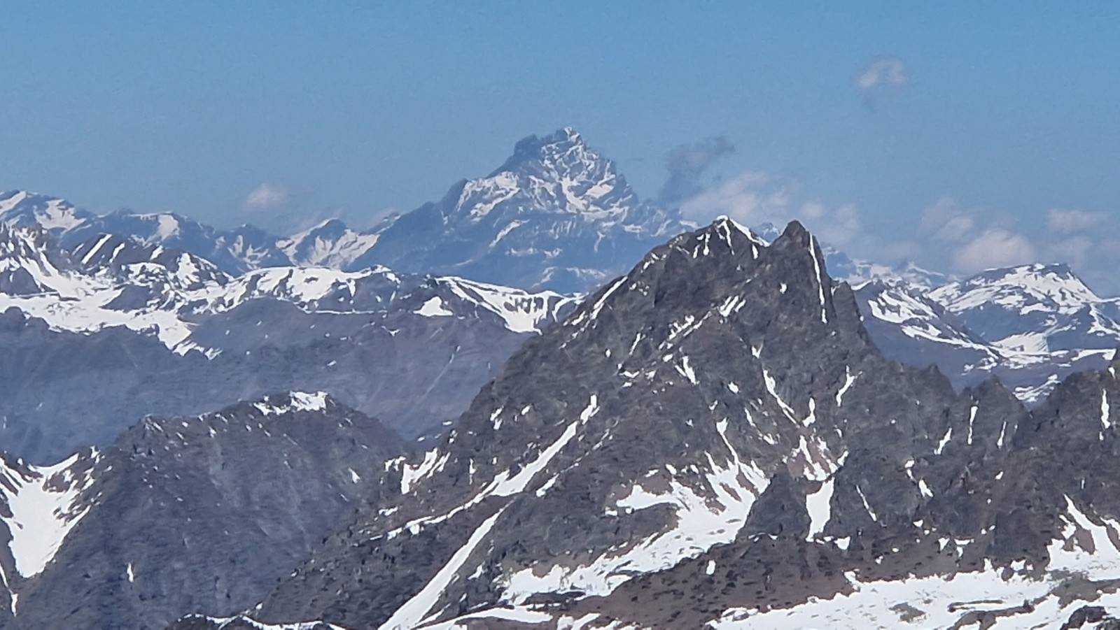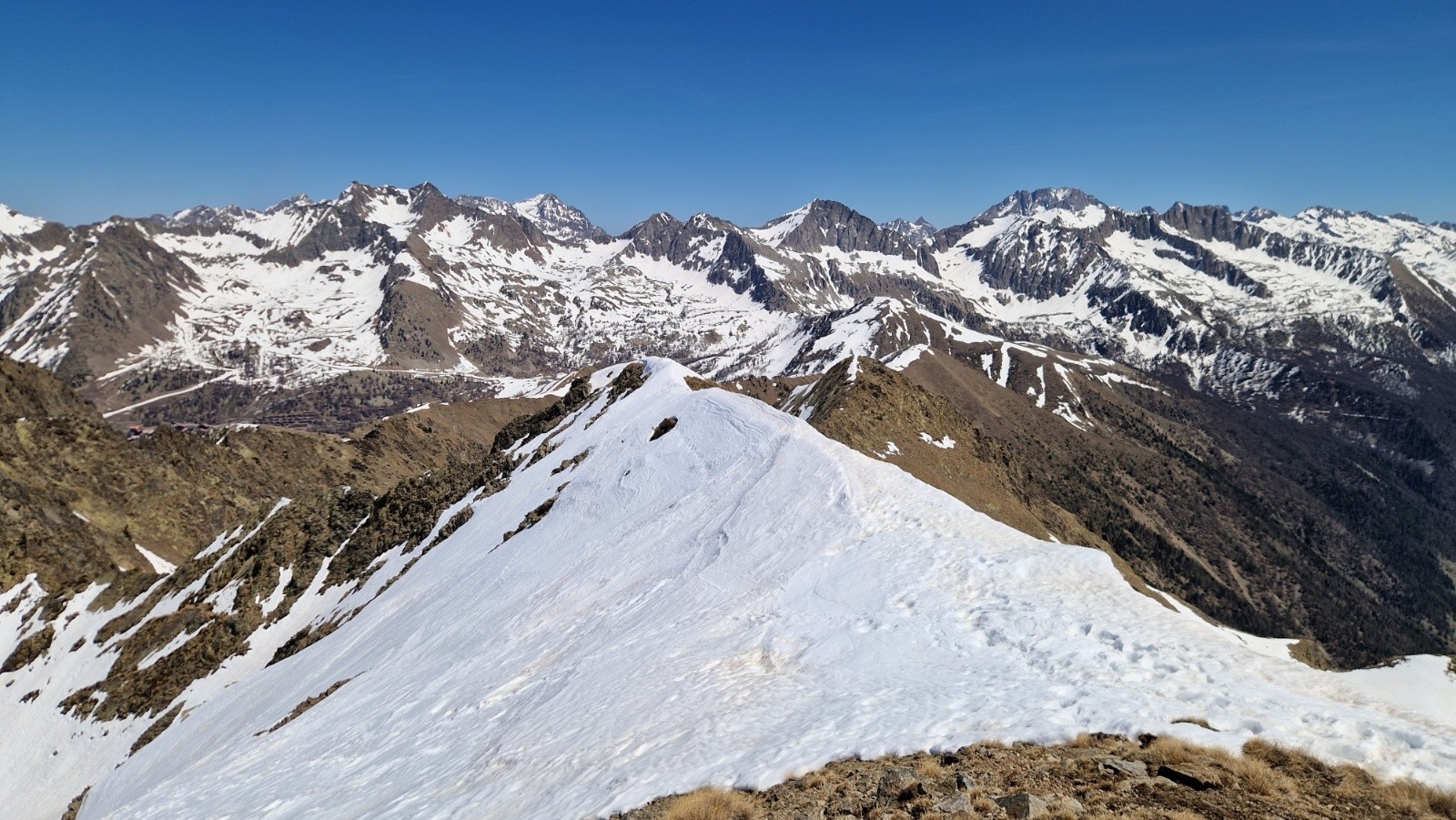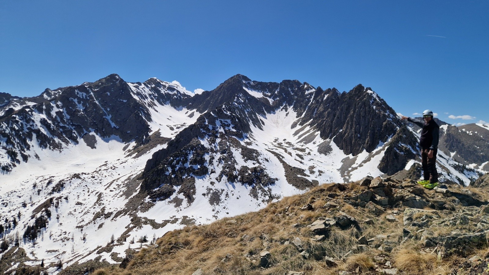 Tandis qu'on s'approche du Saint Sauveur, on se dit en suivant l'ascension plus qu'hesitante d'un skieur en solo que la pente finale doit etre encore bien dure. On decide de mettre les crampons et le sommet est atteint vers les 13h. Seuls au sommet, on en profite pour manger et contempler le paysage, toujours sublime là-haut par la vue a 360*, parfaitement dégagé sur la totalité des montagnes, aussi loin que porte le regard. On devine cependant une couche nuageuse bien dense vers la mer.