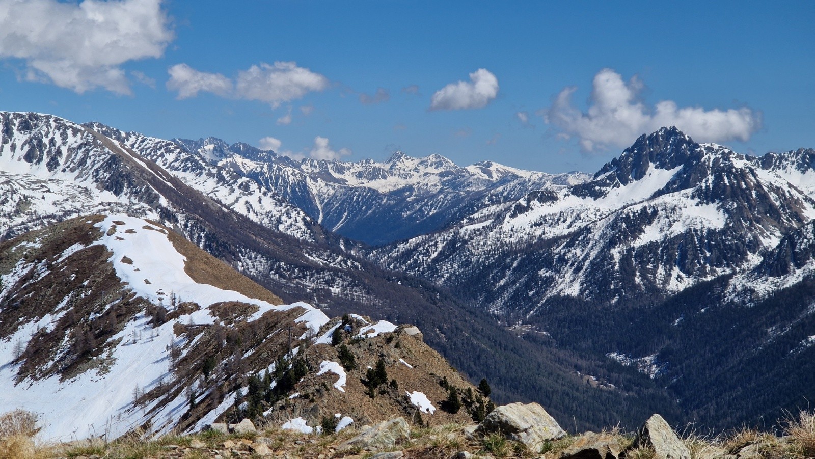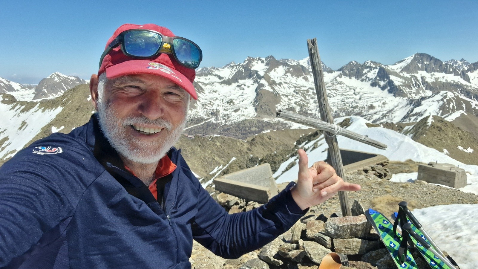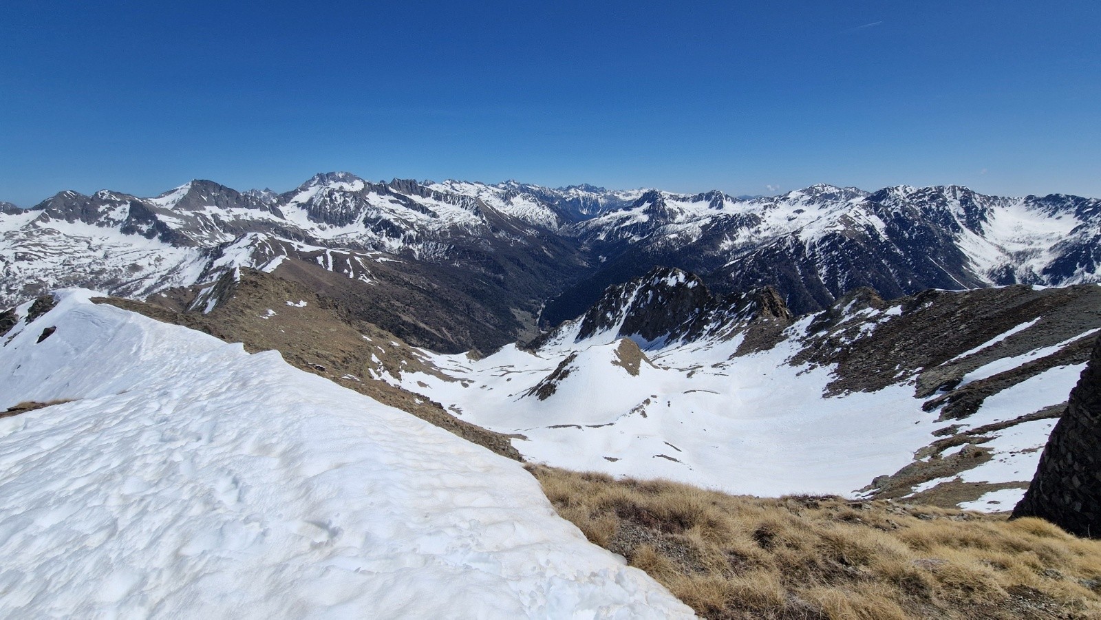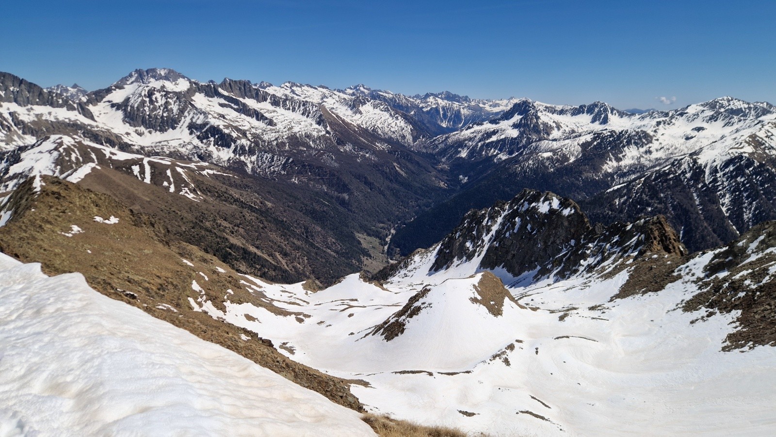 Tandis qu'on s'approche du Saint Sauveur, on se dit en suivant l'ascension plus qu'hesitante d'un skieur en solo que la pente finale doit etre encore bien dure. On decide de mettre les crampons et le sommet est atteint vers les 13h. Seuls au sommet, on en profite pour manger et contempler le paysage, toujours sublime là-haut par la vue a 360*, parfaitement dégagé sur la totalité des montagnes, aussi loin que porte le regard. On devine cependant une couche nuageuse bien dense vers la mer.