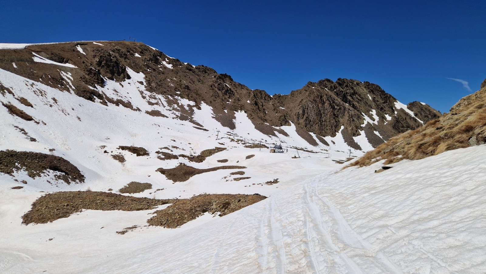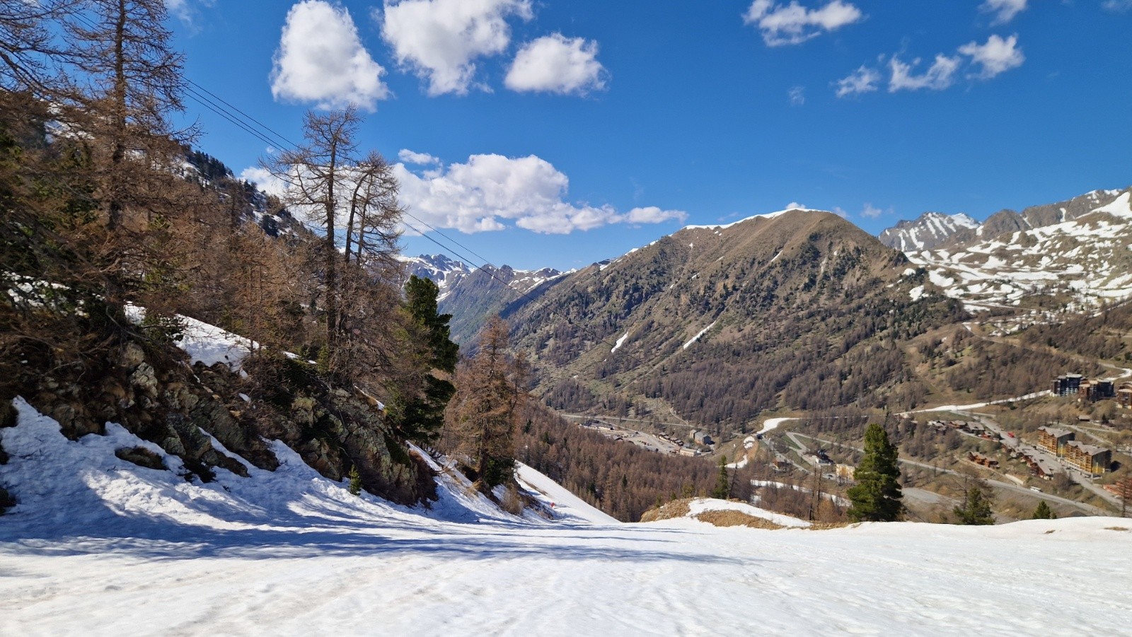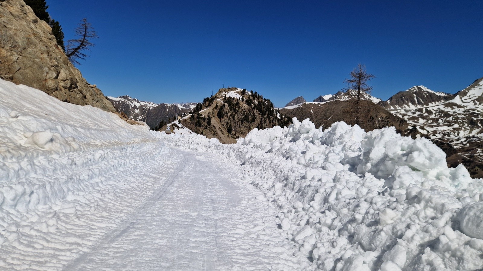 14h, descente sympa sur neige bien compacte, à peine transformée. On croise 2 gars redescendant de la Tète de Pignals par la pente sud, après être montes par la diagonale ouest bien enneigée. On continue la descente toujours peinarde vers la cote 2200 (au-dessus du chalet-restau) puis on remonte jusqu'à la Tête de Pelevos, par le Col de ls Vallette, par le chemin bien dégagé par les ratracks. La redescente finale par la piste rouge des sapins est encore bien skiable, malgre l'heure avancee, mais s’avère plutôt collante vers le bas : on s'aperçoit après coup que les semelles des skis ne sont plus vraiment lisses, comme empéguées de fillasses noirâtres...Bizarre, bizarre.