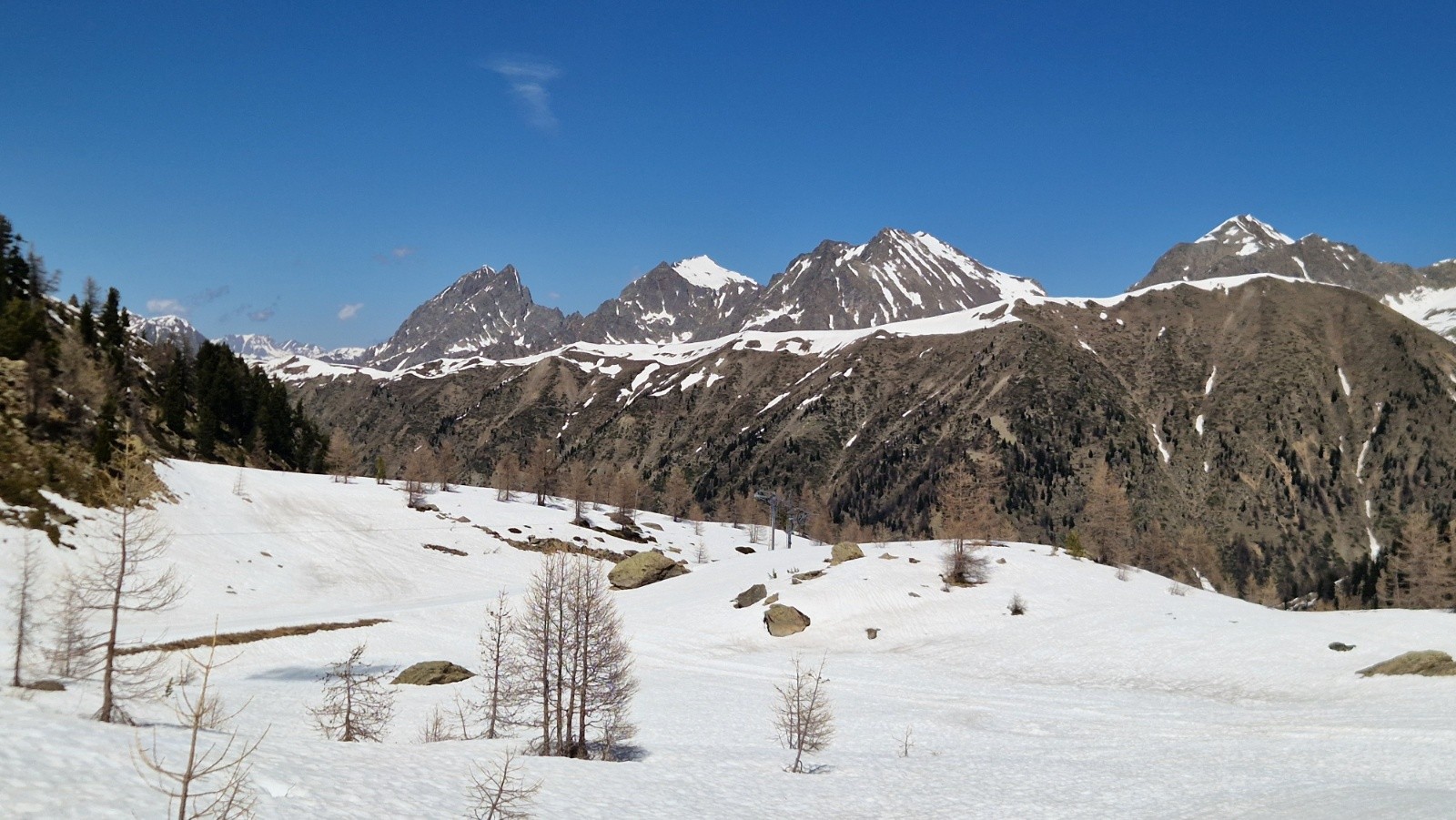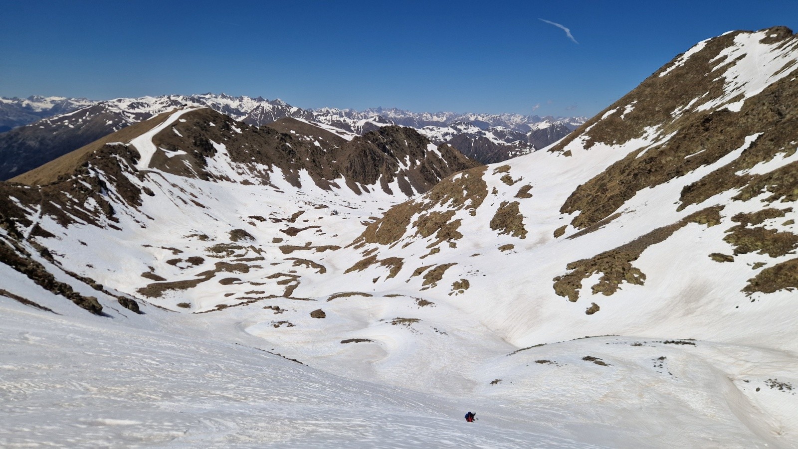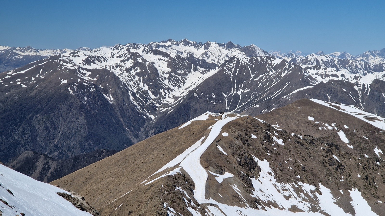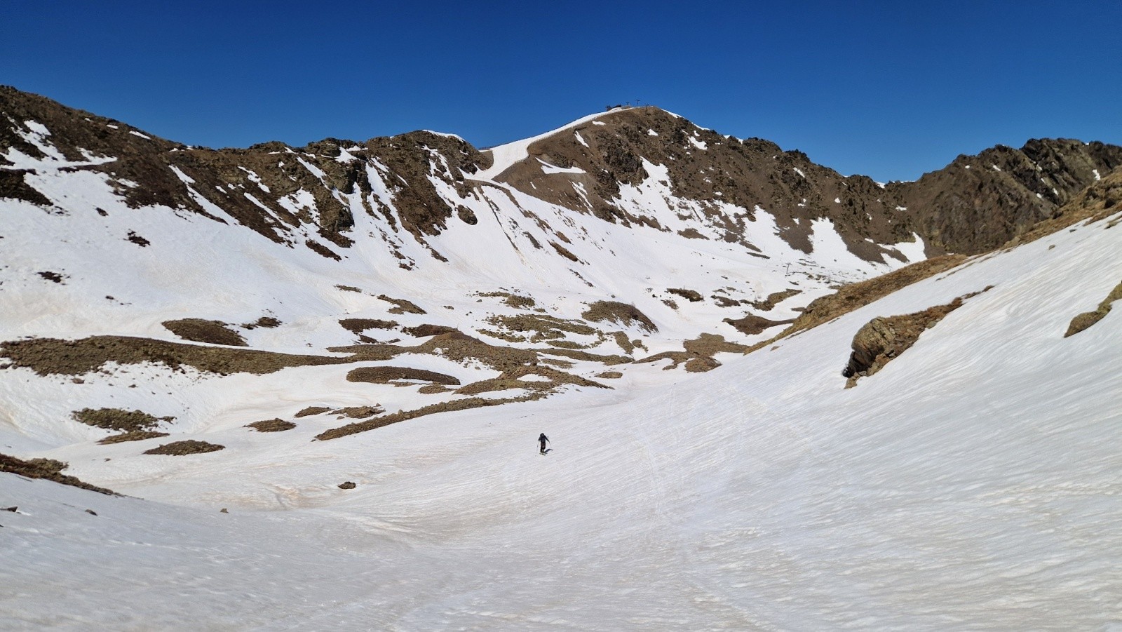 14h, descente sympa sur neige bien compacte, à peine transformée. On croise 2 gars redescendant de la Tète de Pignals par la pente sud, après être montes par la diagonale ouest bien enneigée. On continue la descente toujours peinarde vers la cote 2200 (au-dessus du chalet-restau) puis on remonte jusqu'à la Tête de Pelevos, par le Col de ls Vallette, par le chemin bien dégagé par les ratracks. La redescente finale par la piste rouge des sapins est encore bien skiable, malgre l'heure avancee, mais s’avère plutôt collante vers le bas : on s'aperçoit après coup que les semelles des skis ne sont plus vraiment lisses, comme empéguées de fillasses noirâtres...Bizarre, bizarre.