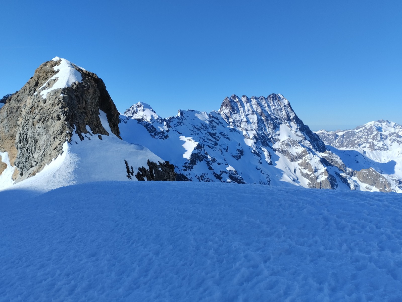 Conditions pour le ski : Bon regel. Moquette en suivant la courbe du soleil. Vieille poudre en N au dessus de 2900m