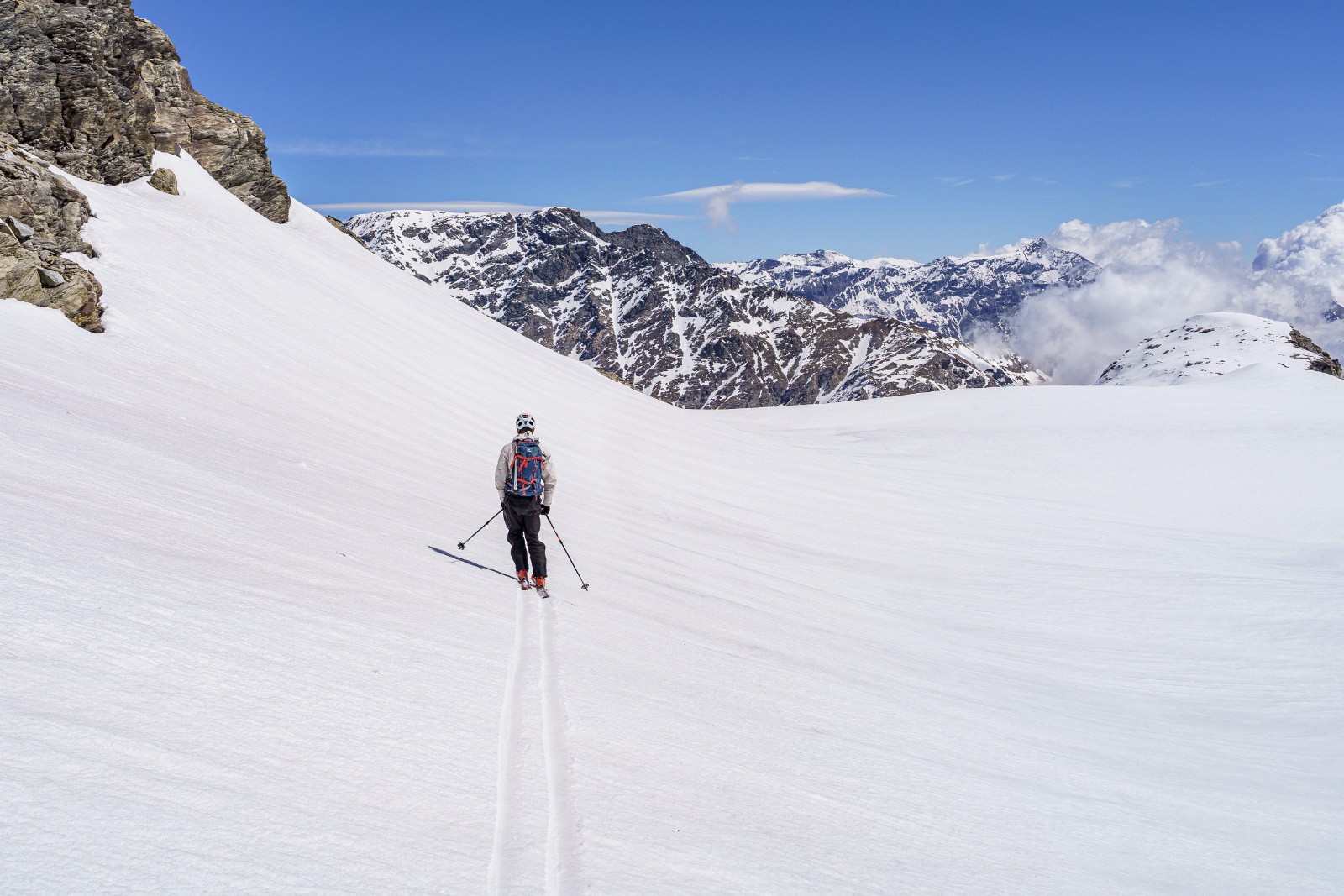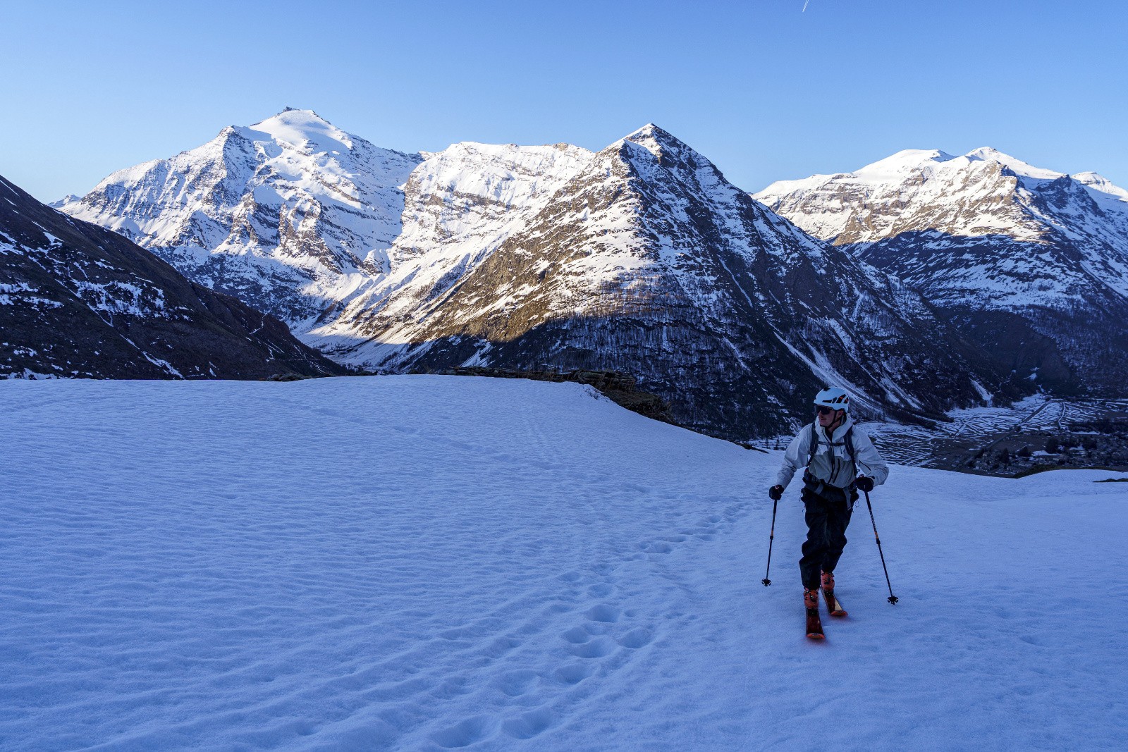Conditions pour le ski : Moquette de luxe si descente au bon horaire. Le relief est assez présent dans les versants sud, rendant la moquette bien moins agréable à skier. Poudre au-dessus de 3000 m en nord, souvent soufflée sur la frontière italienne. La neige devient, au fil des jours, de plus en plus de type névé.